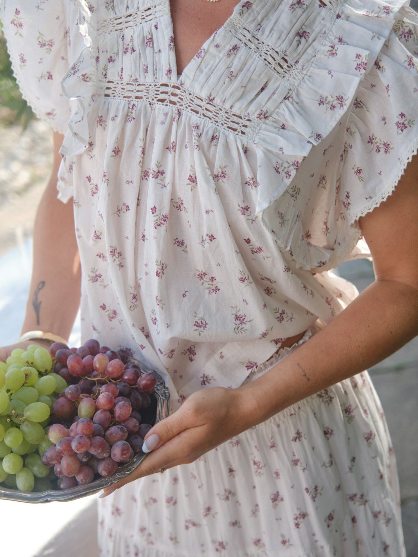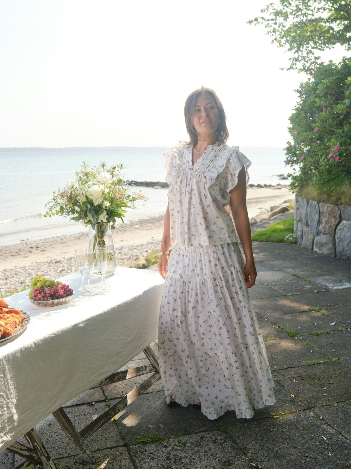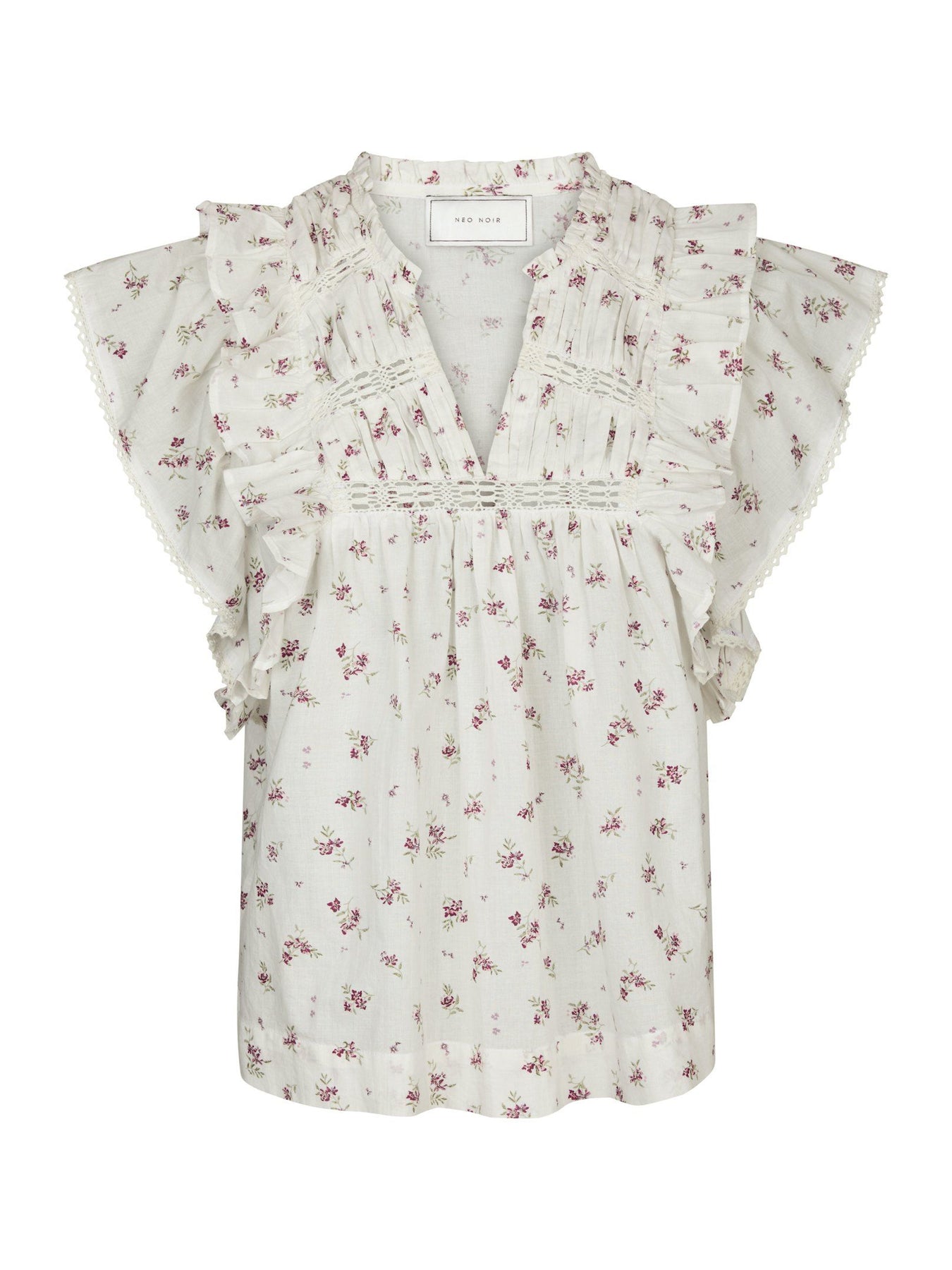 Fin blomstret top fra Neo Noir. Toppen har en løs pasform med korte ærmer og V-hals. Den har flot detalje med flæsekant i ærmerne og nakken, samt hulmønster hen over brystet.