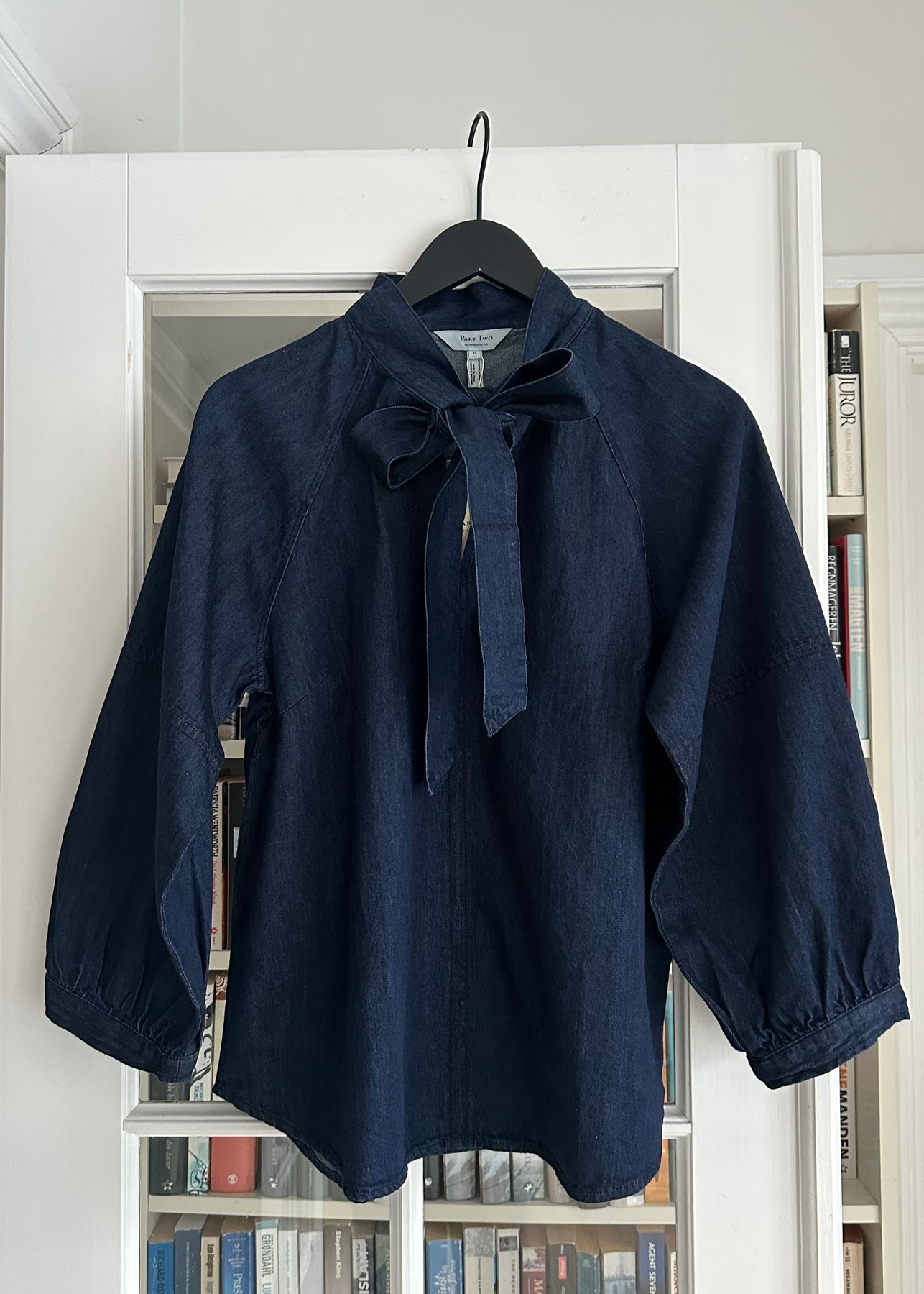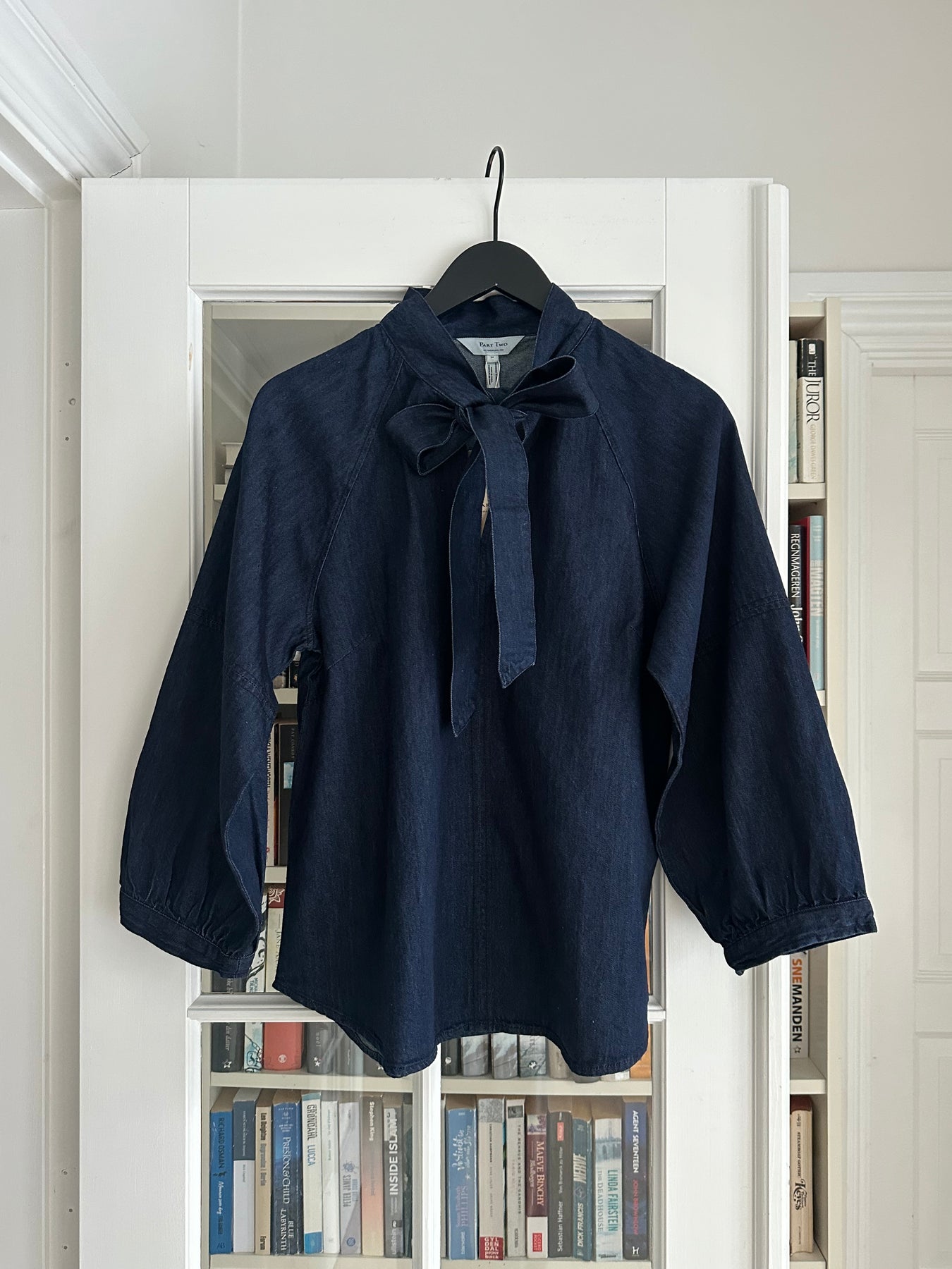 Flot mørk denimskjorte fra Part Two med bindebånd i halsen og en løs pasform.