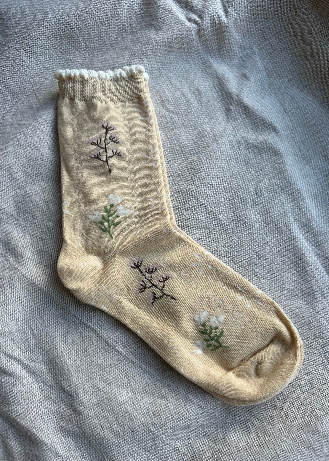 Fine strømper fra Plissé Copenhagen med vævede blomster.