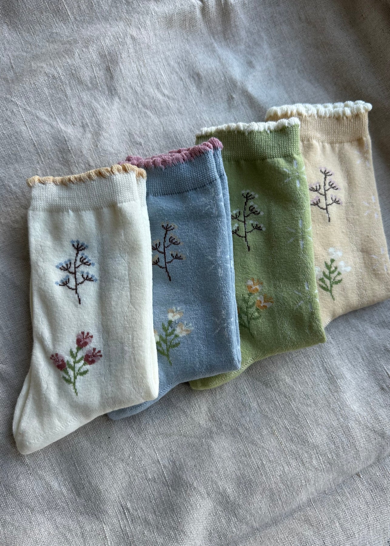 Fine strømper fra Plissé Copenhagen med vævede blomster.