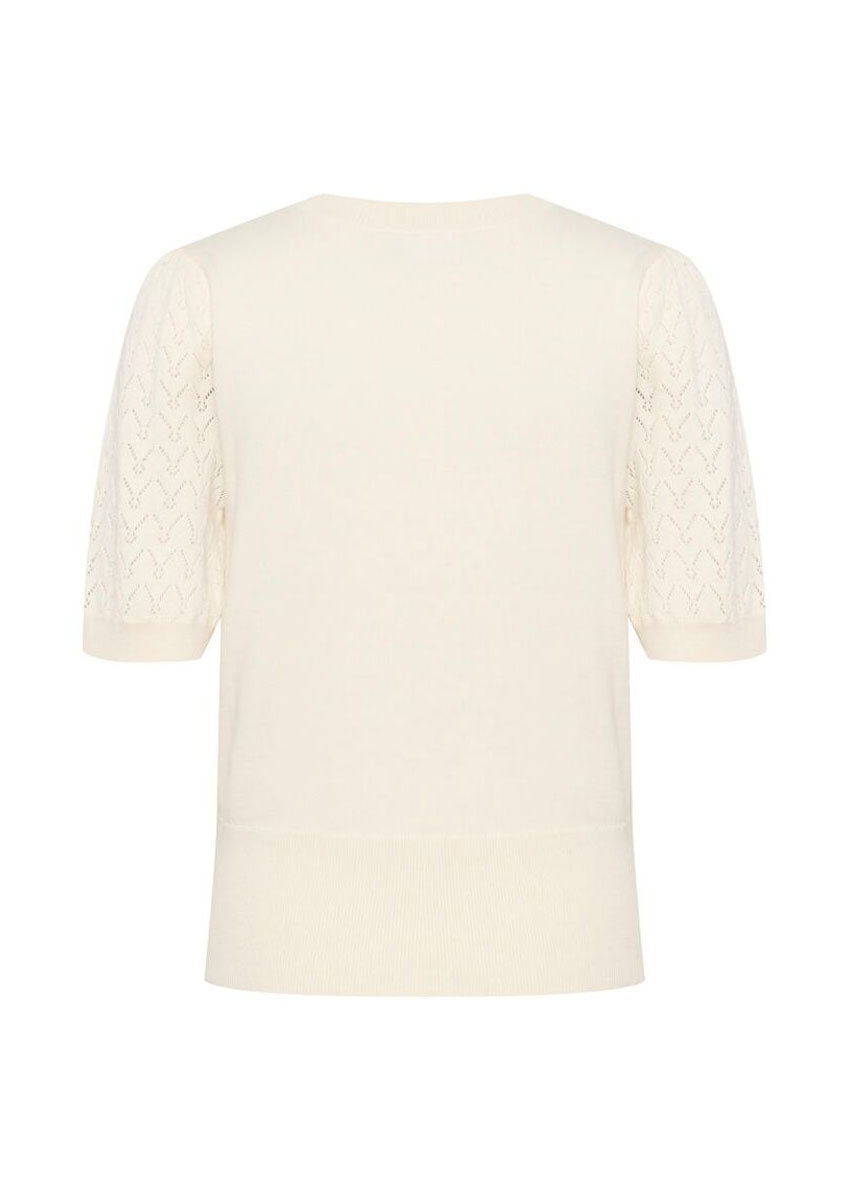 Fin cremehvid strikbluse fra Saint Tropez. Striktrøjen har korte ærmer og et dekorativt hulmønster. Den har en klassisk pasform samt ribkanter ved hals, ærmer og bund.