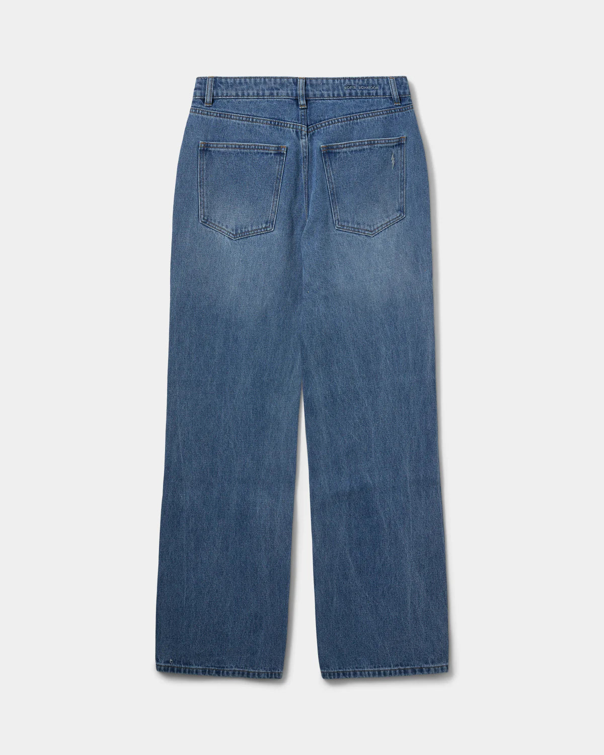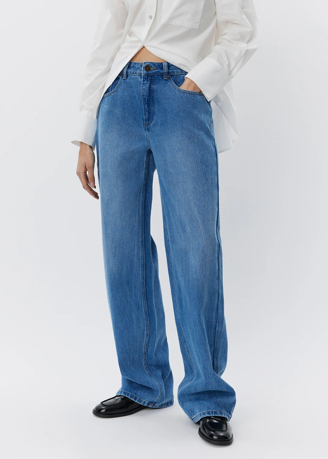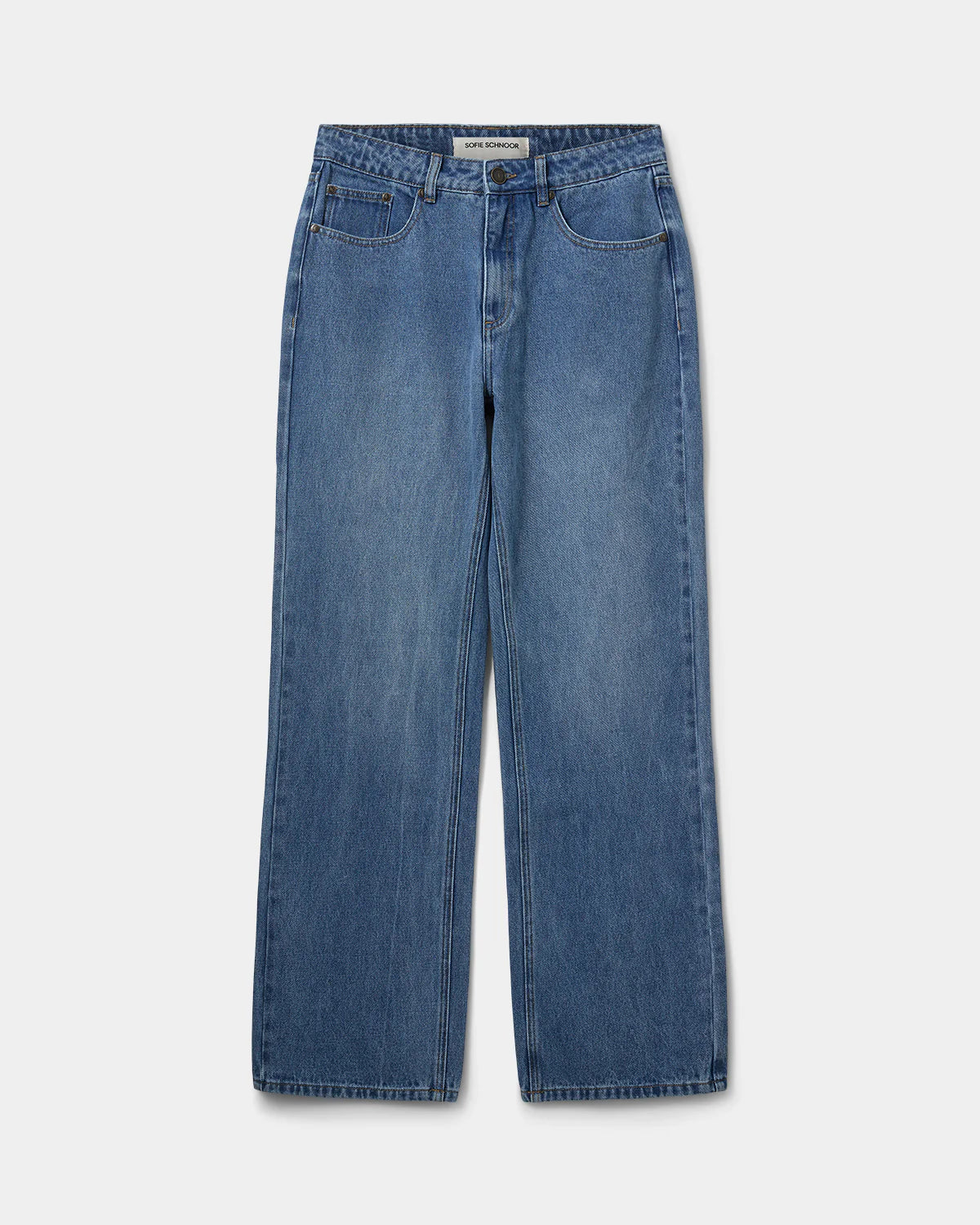 Klassiske jeans i blå denim med regular fit fra Sofie Schnoor. De har lommer foran og bagpå samt lynlås- og knaplukning foran. På baglommen findes en lille, diskret lyn-detalje.