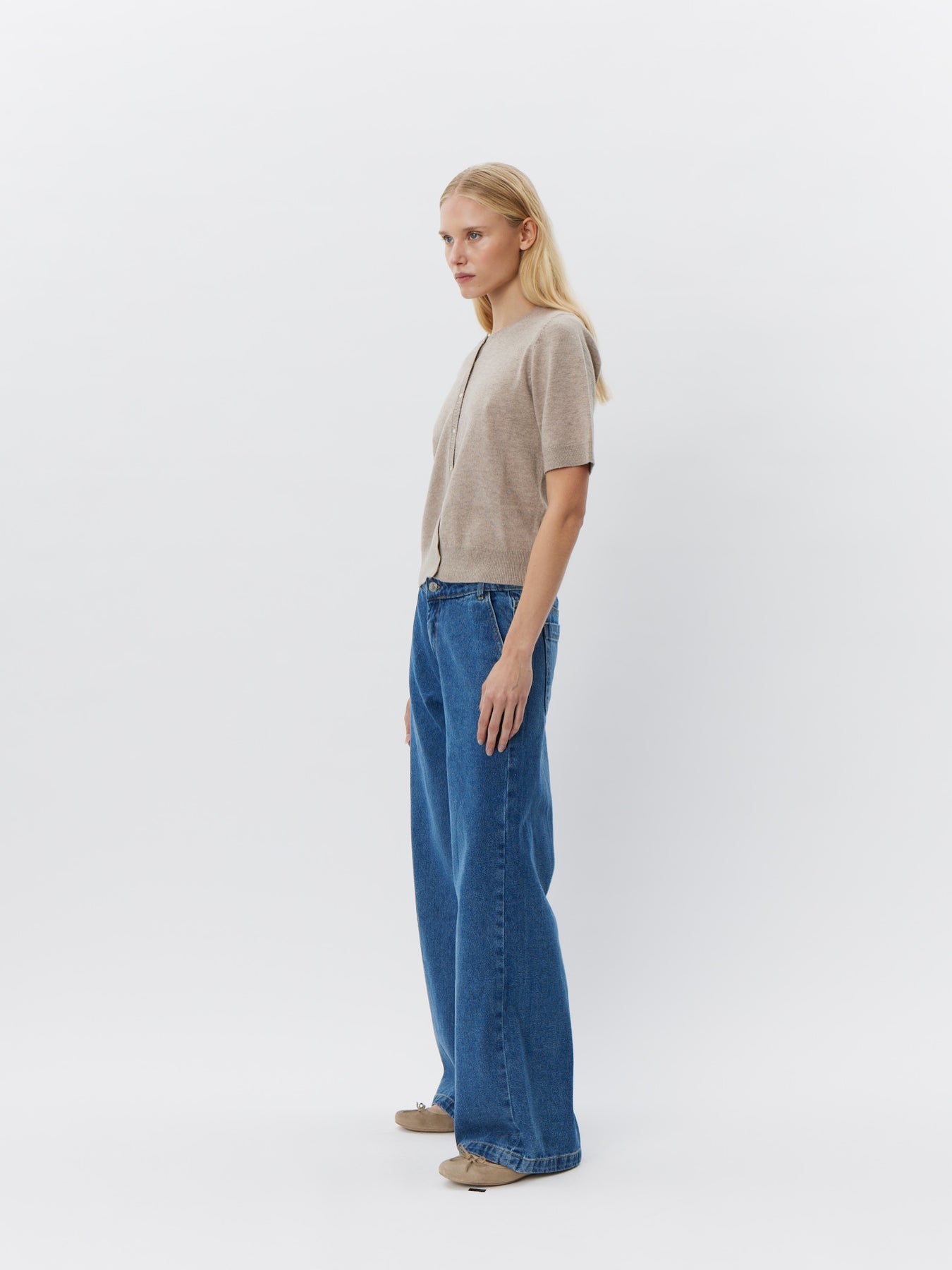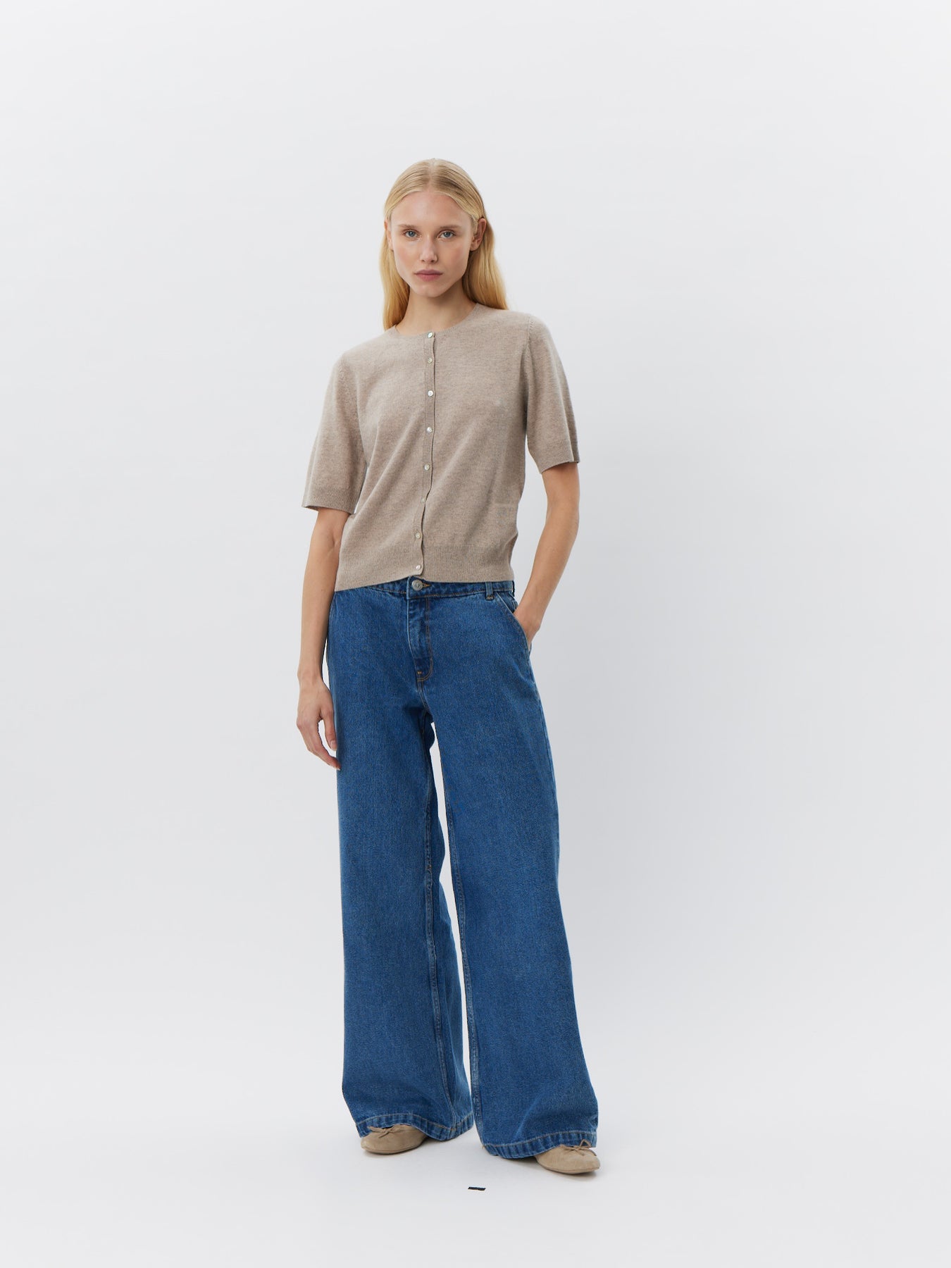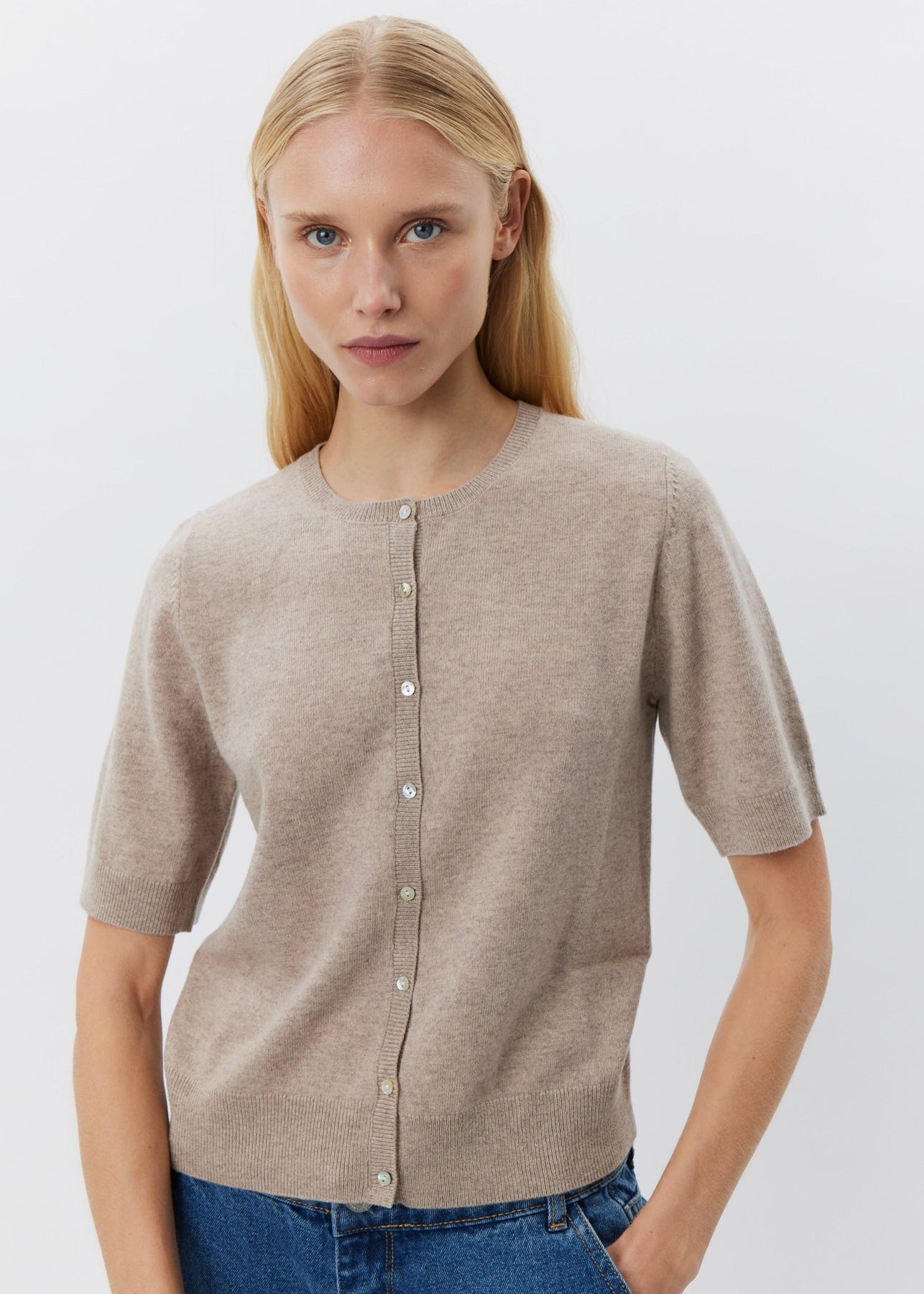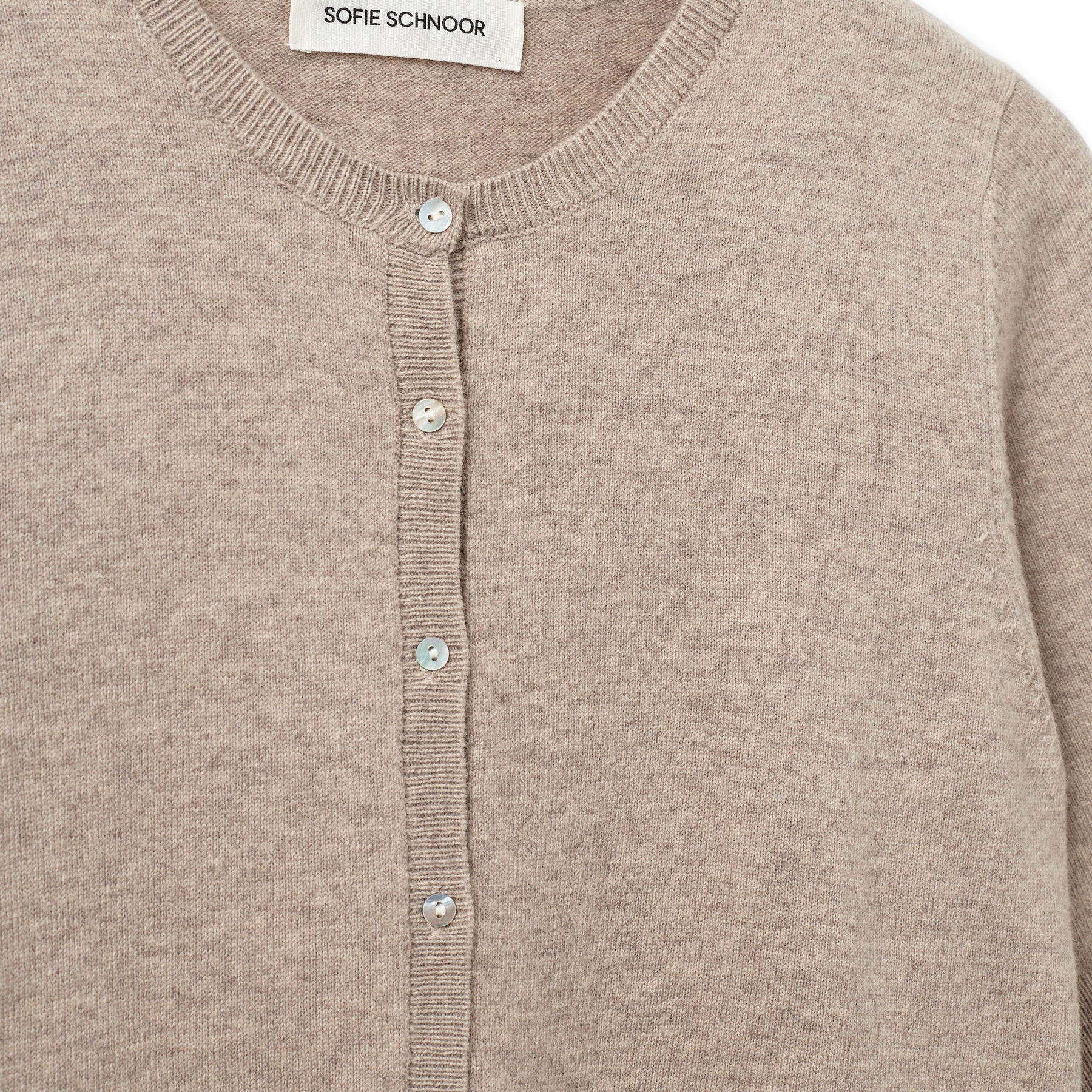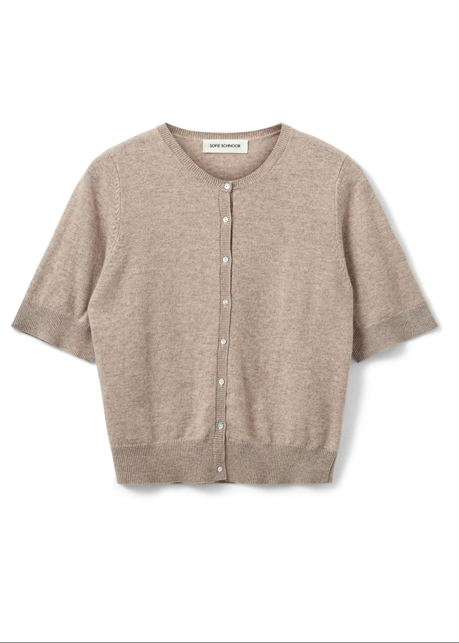 Super fin beige cardigan fra Sofie Schnoor. Cardiganen har korte ærmer og lukkes med knapper foran.