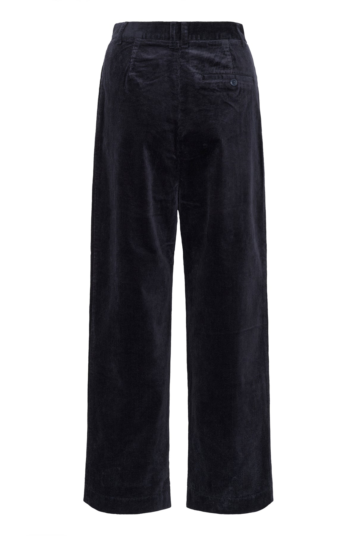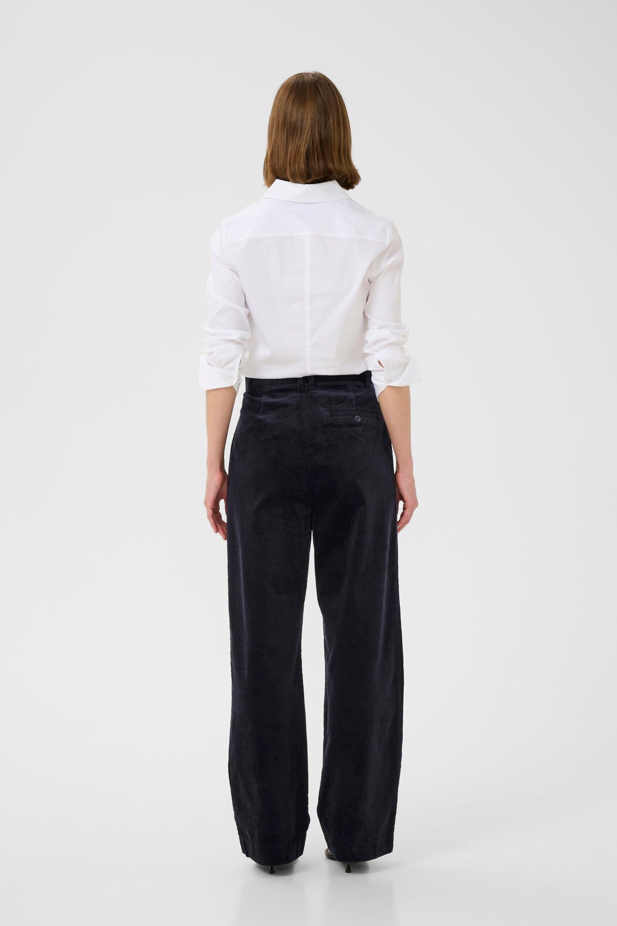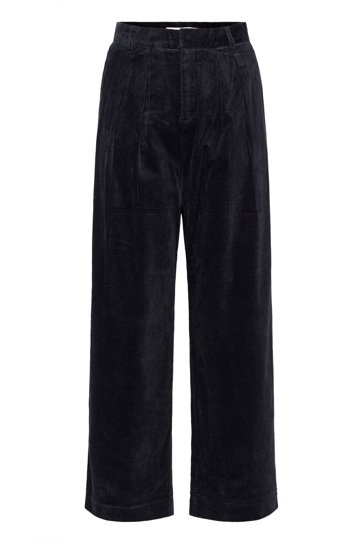Lækre mørkeblå fløjlsbukser fra Inwear. Bukserne er mellemhøje i livet, har læg foran, sidelommer, paspolerede baglommer og brede ben.