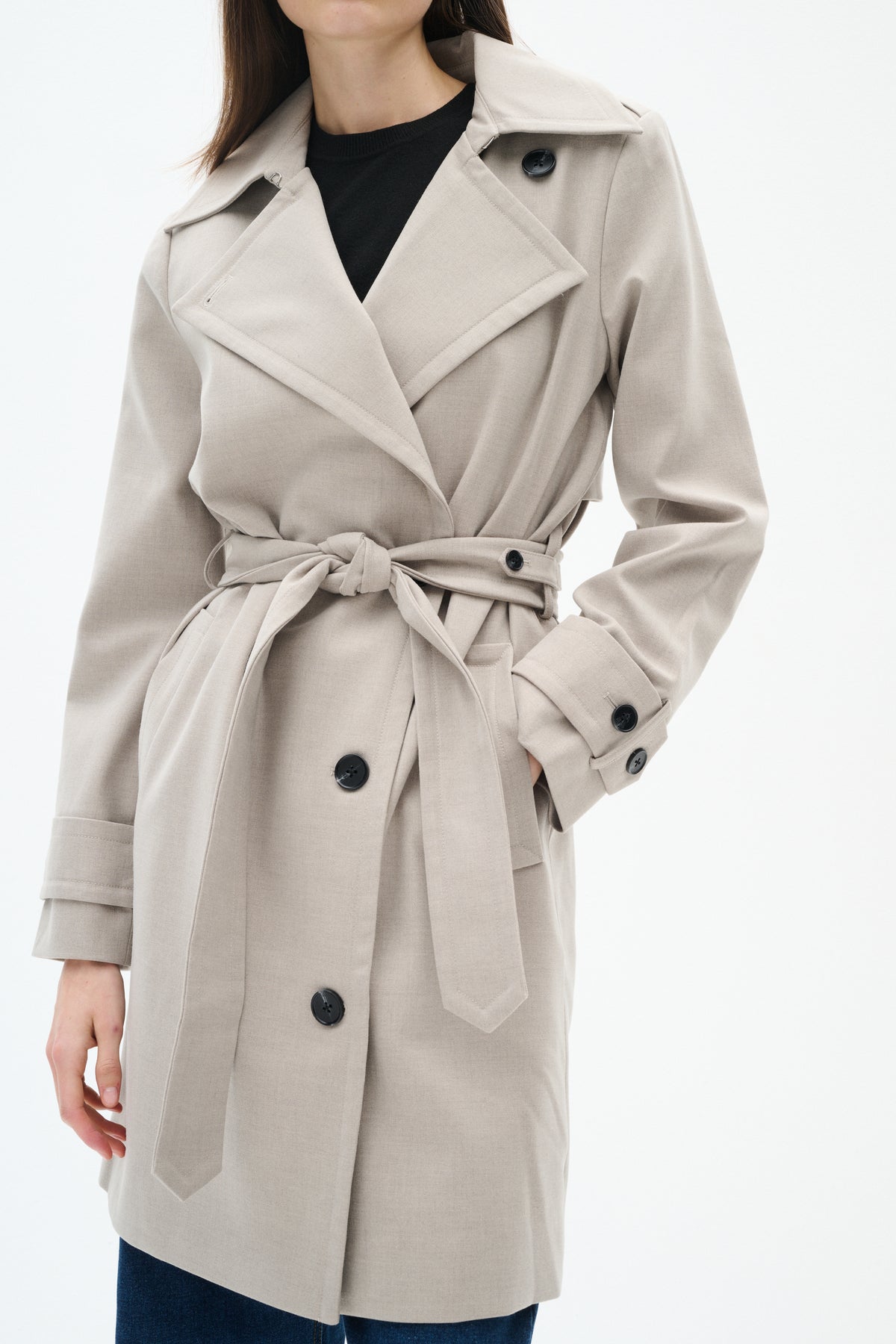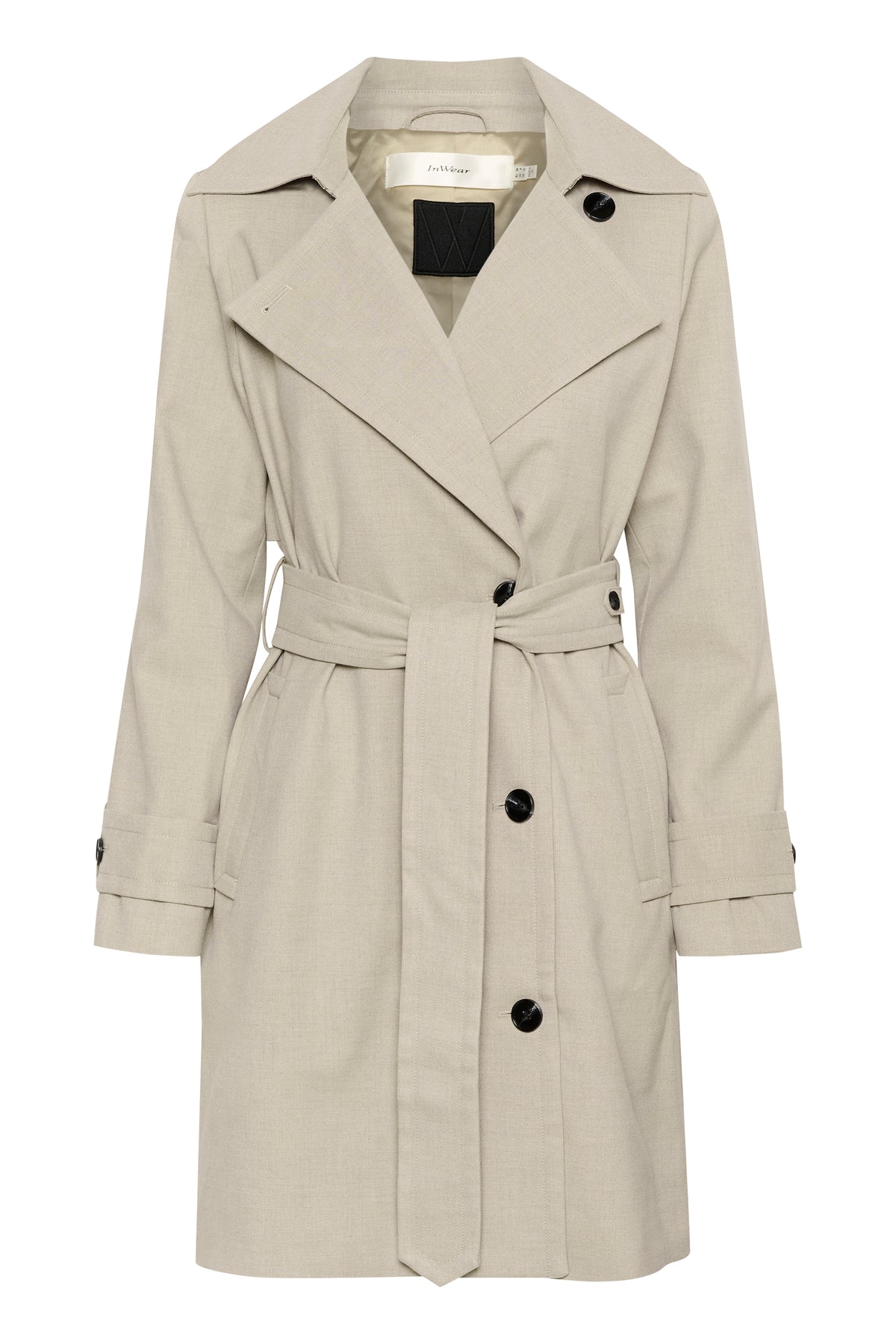 Lækker trenchcoat fra Inwear med uld i. Frakken har bredt revers, lukkes med knapper foran, har bindebånd i livet og sidelommer.