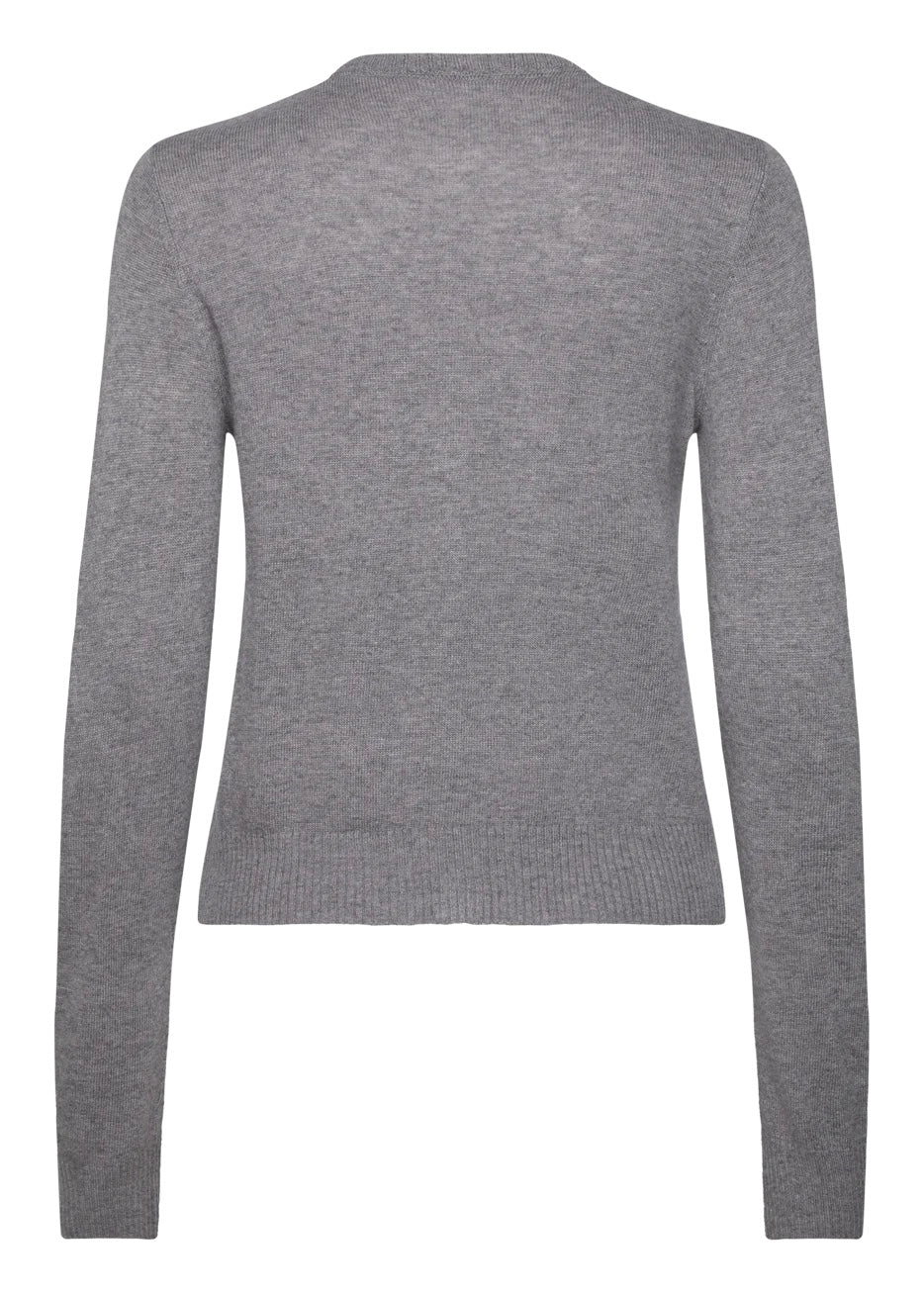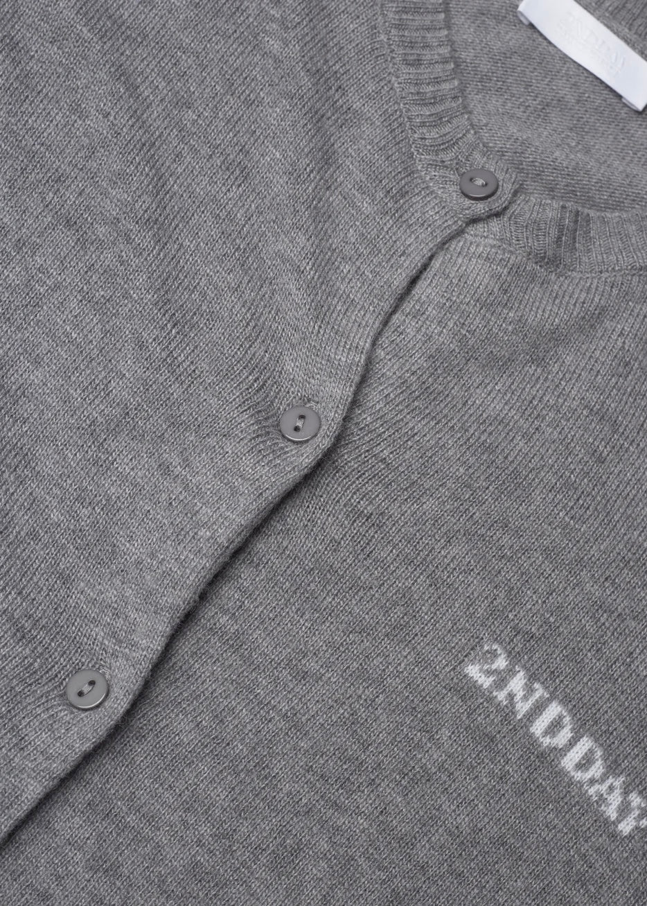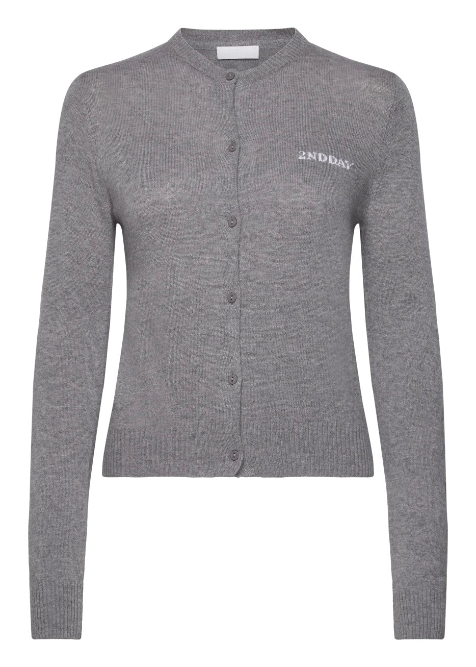 Fin grå cardigan fra 2NDDAY. Cardiganen har rund hals og gennemgående knaplukning foran. Den har ribkanter ved ærmer og bund samt et hvidt logo på brystet.