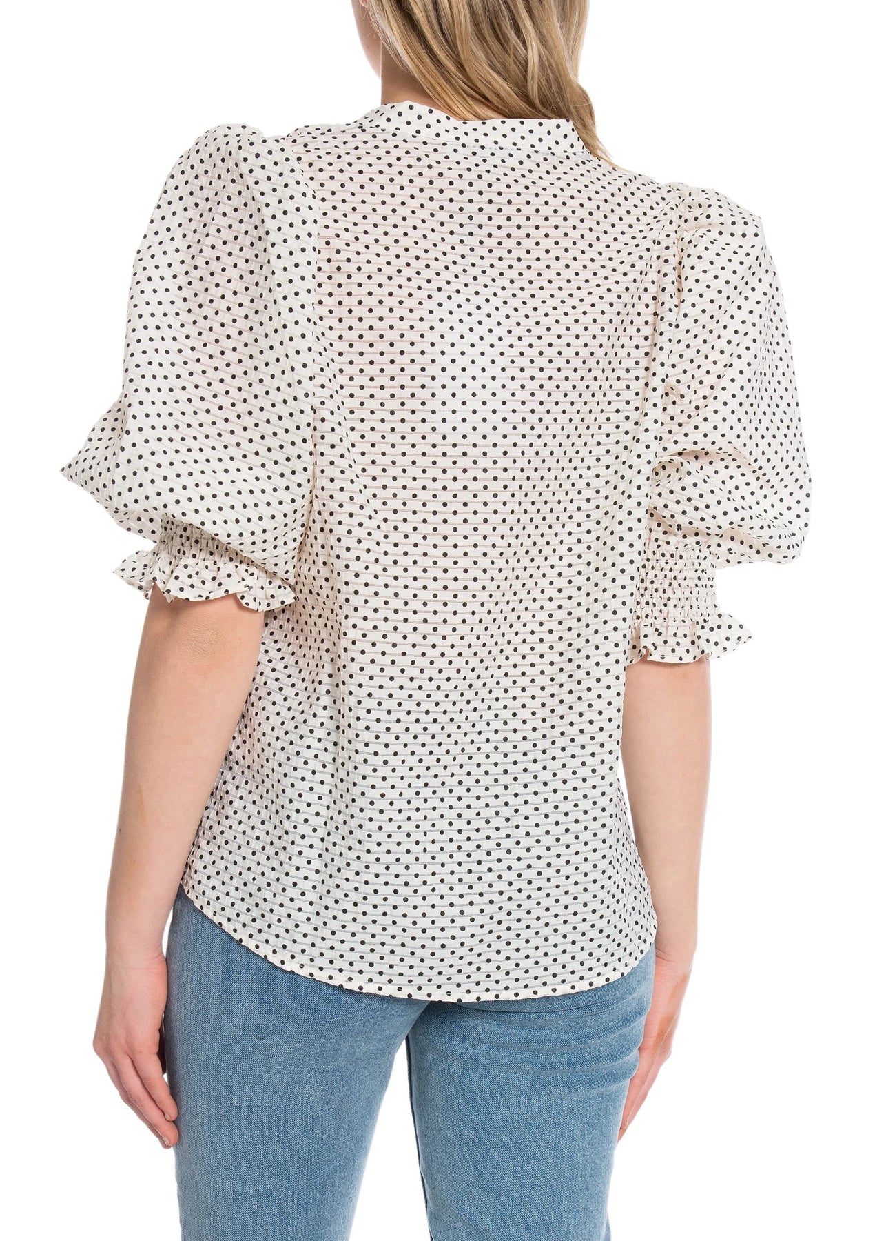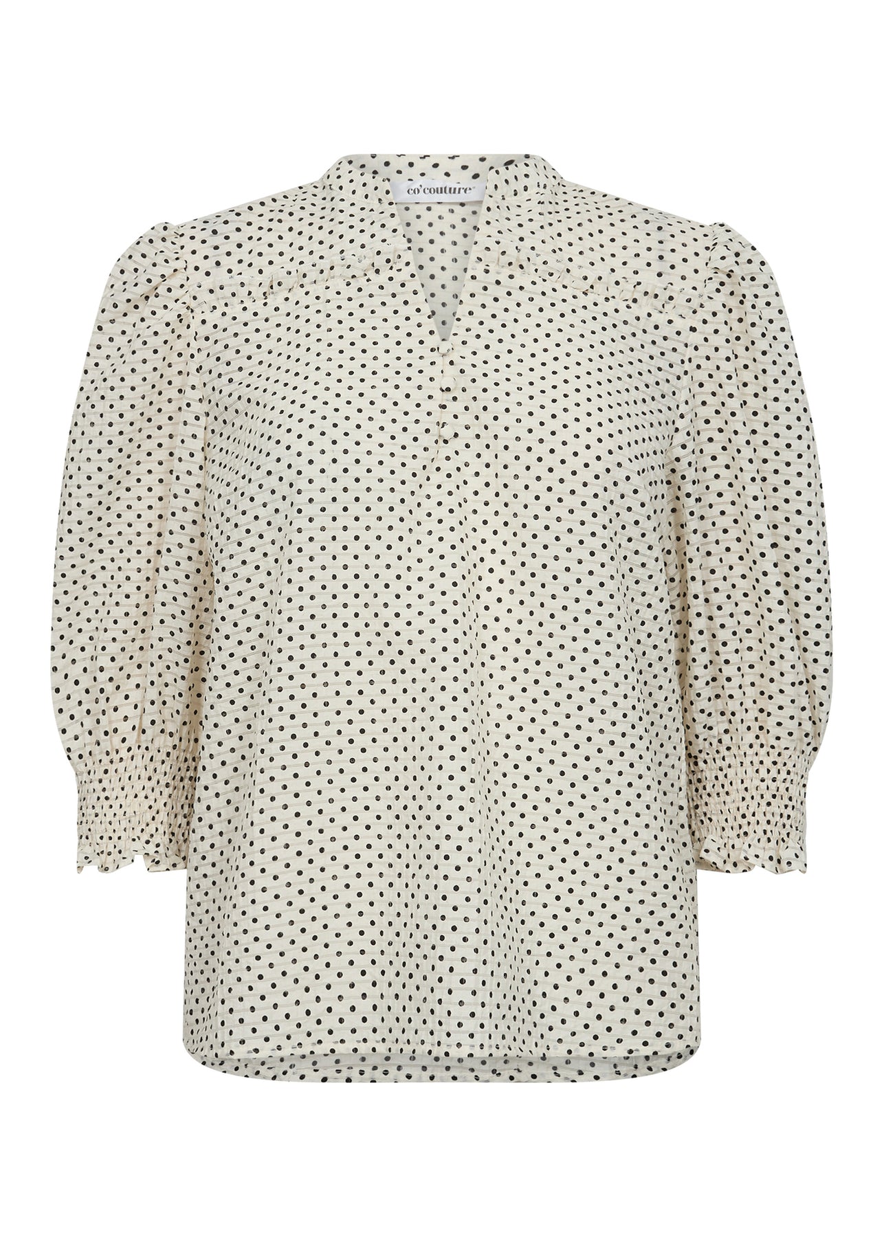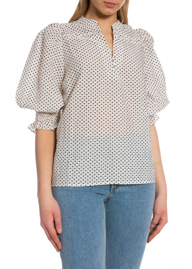 Fin prikket skjorte fra Co'Couture. Skjorten har en løs pasform med korte pufærmer og V-hals.