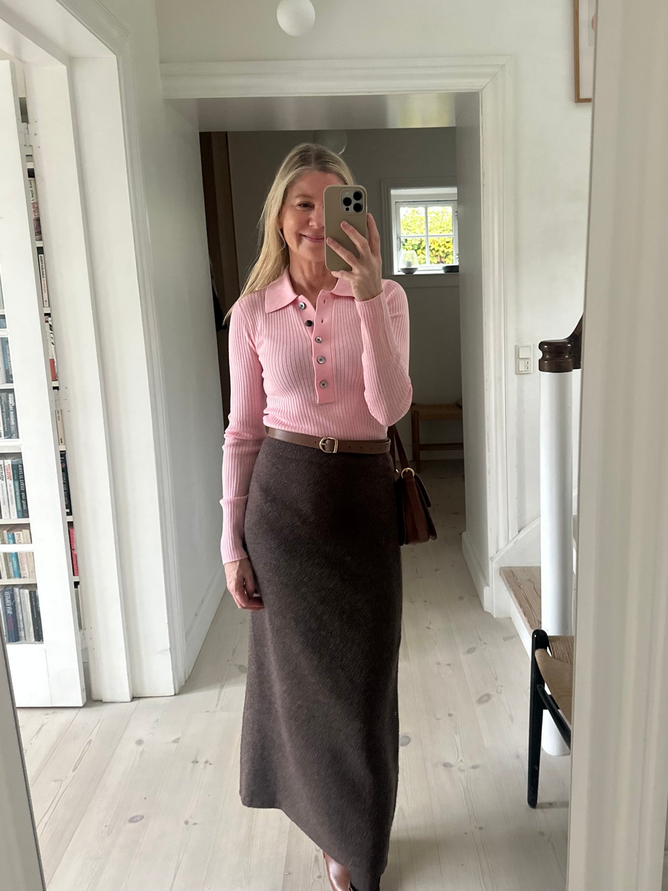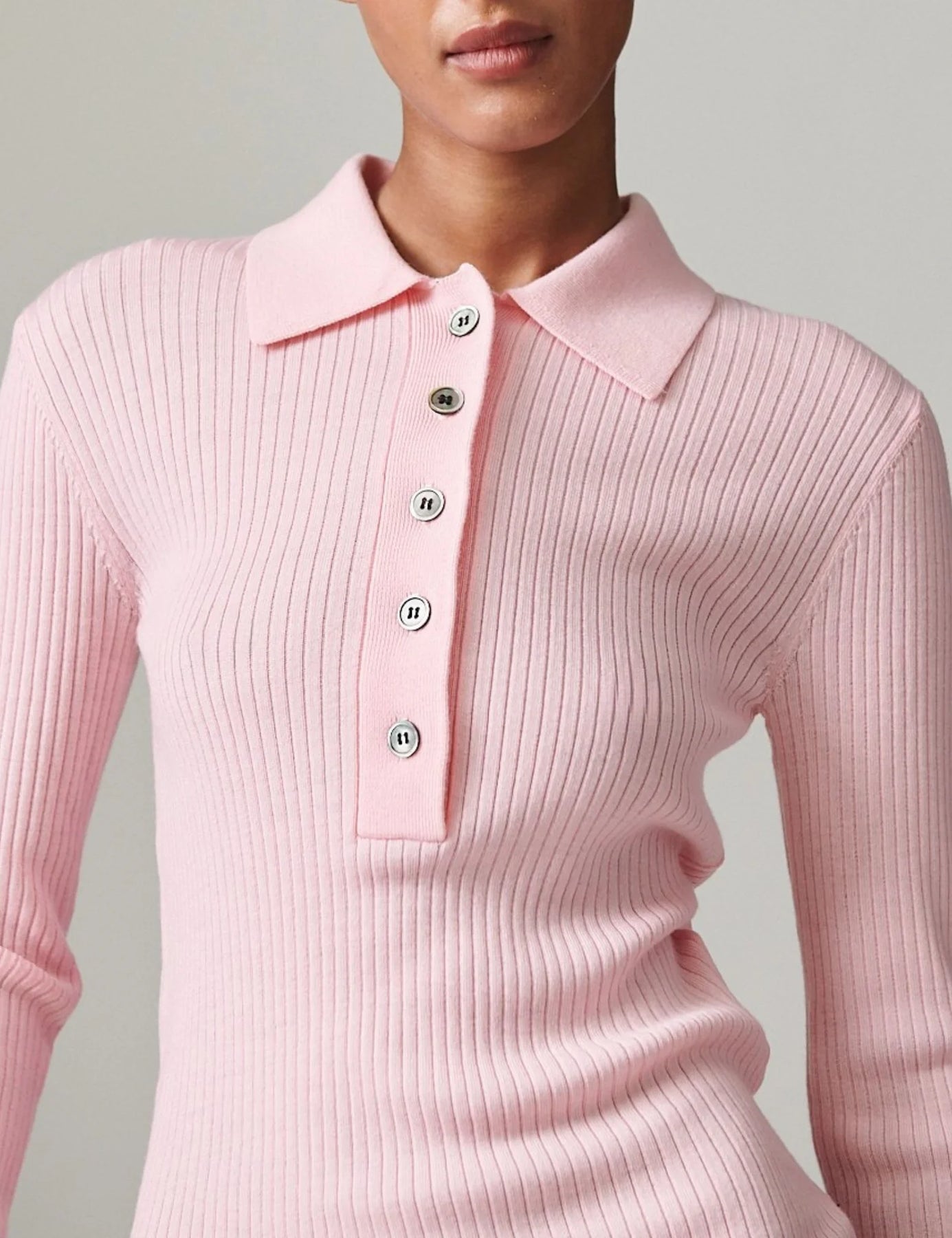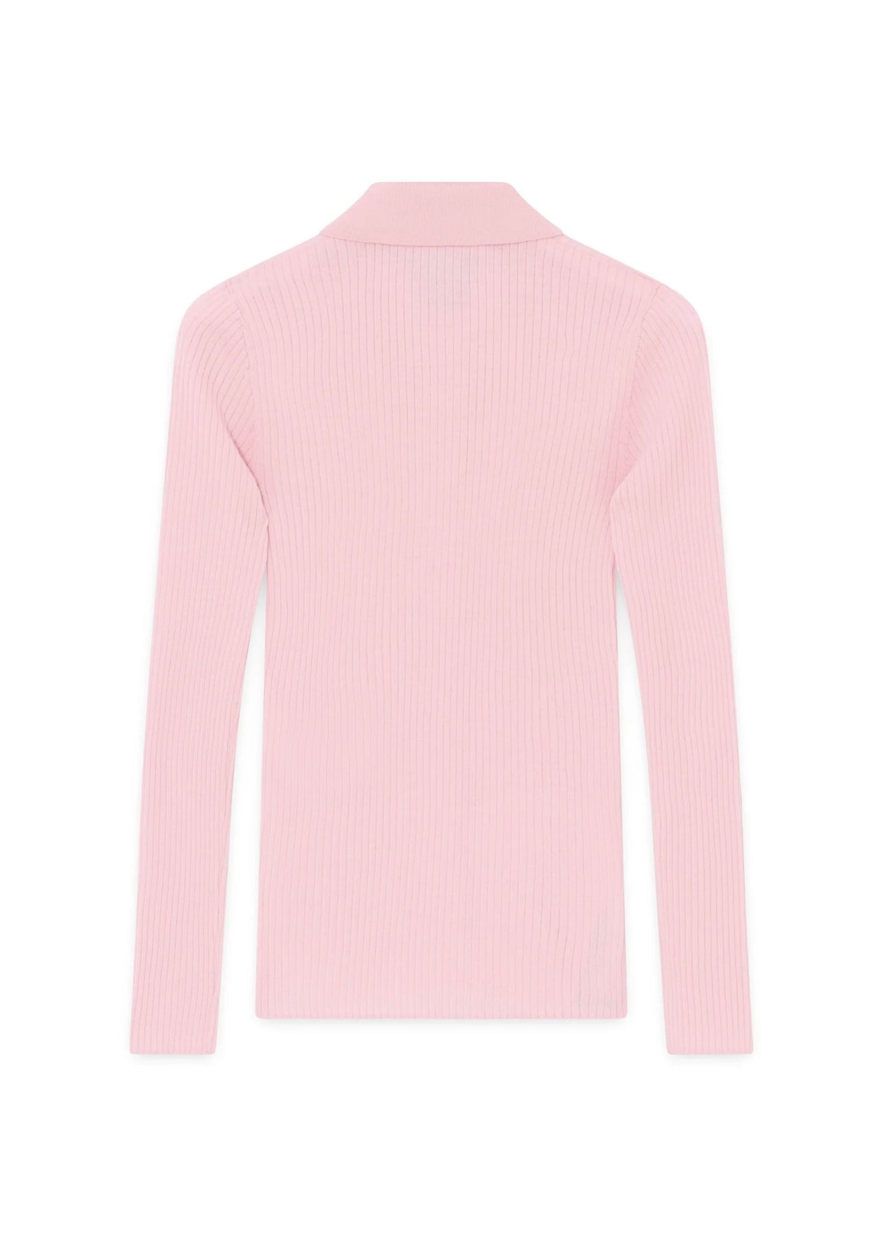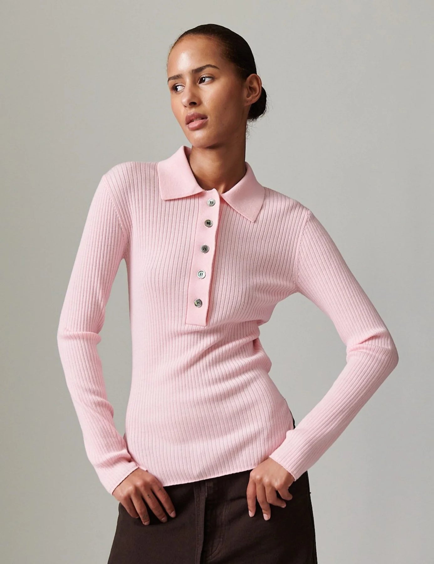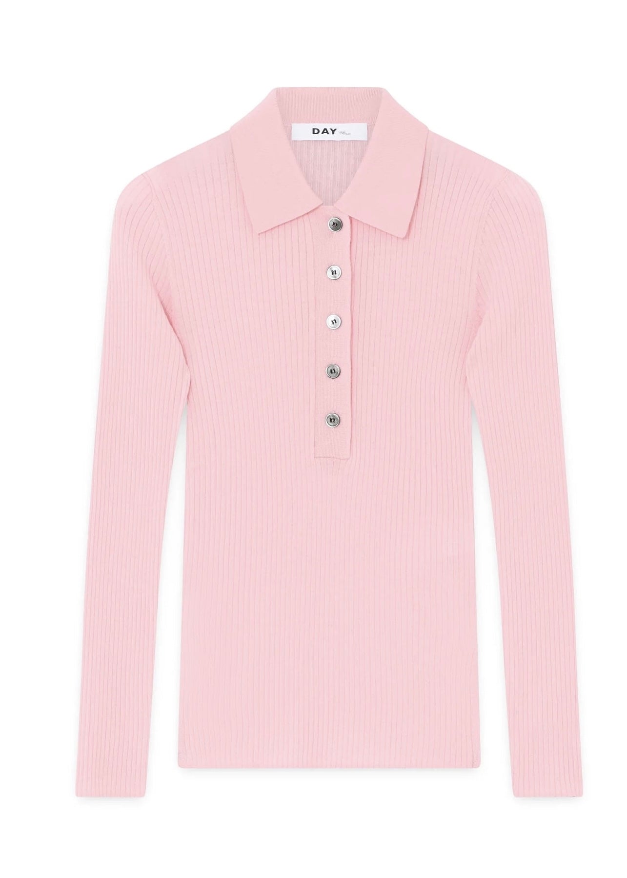Skøn lyserød striktrøje i ribstrikket merinould fra DAY. Striktrøjen har lange ærmer, klassisk polokrave og knapper foran. Den har en tætsiddende pasform og slidser i siderne.