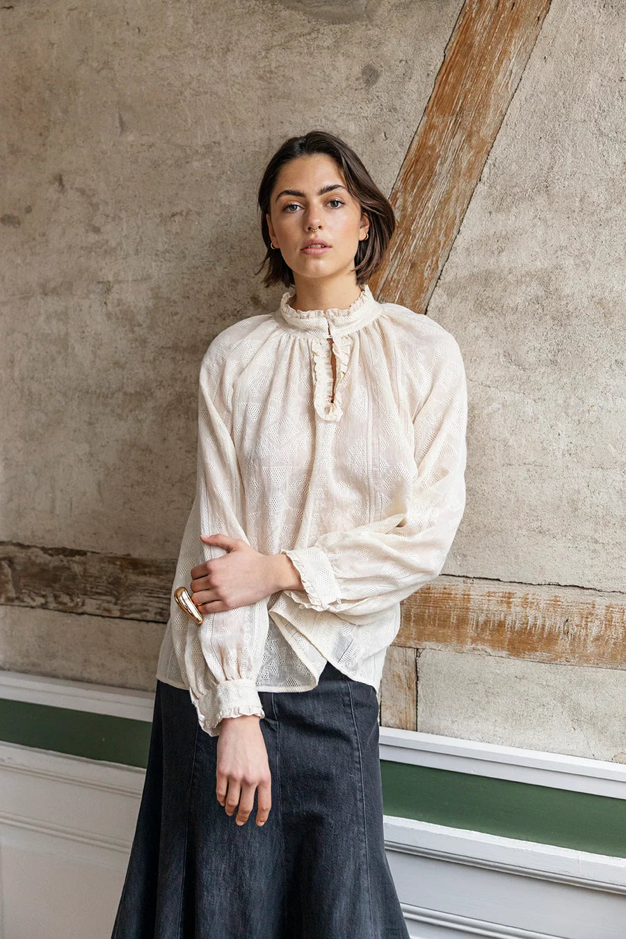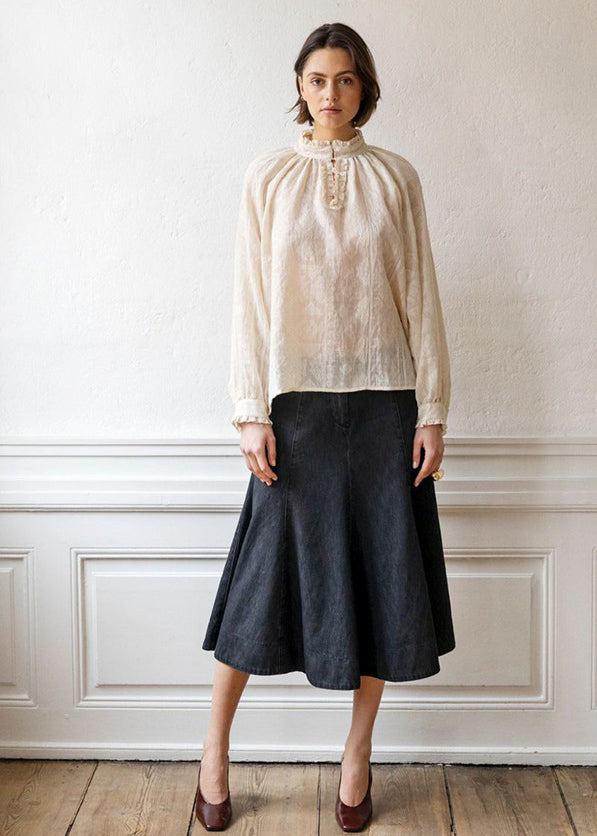 Fin bluse fra Project AJ med brodering og flæser ved kraven og på ærmerne. Blusen har et fint mønster og er en anelse gennemsigtig.