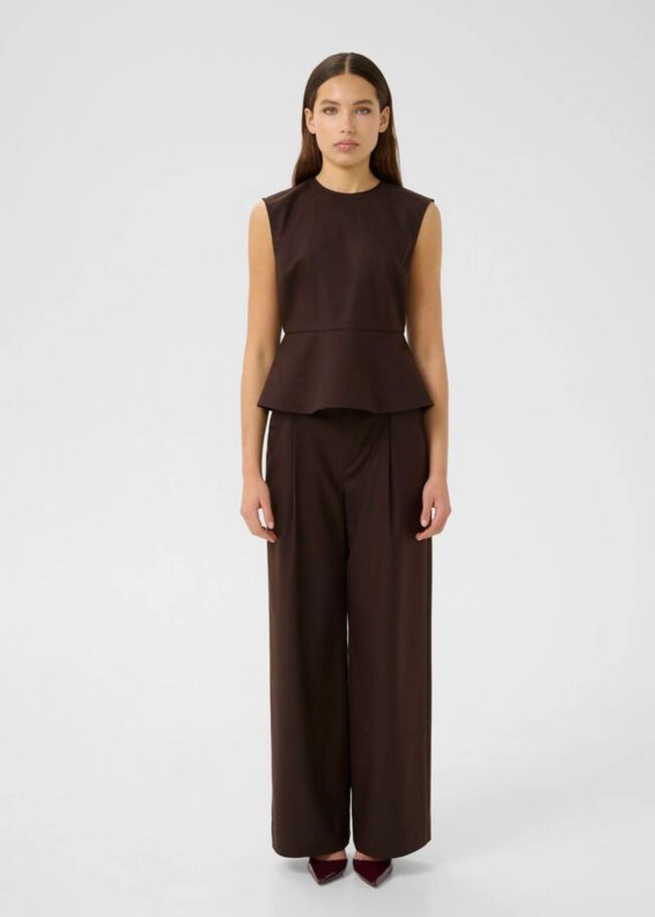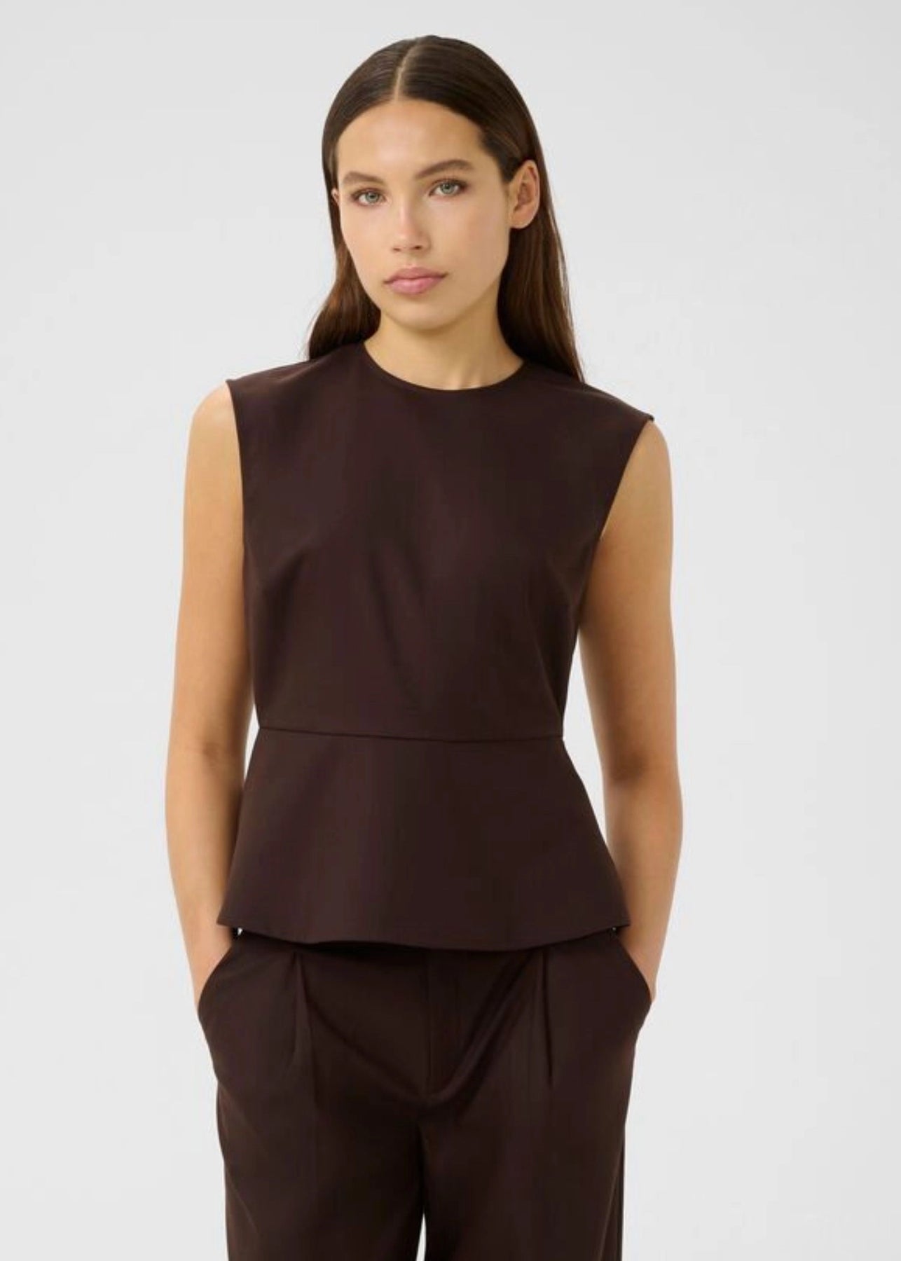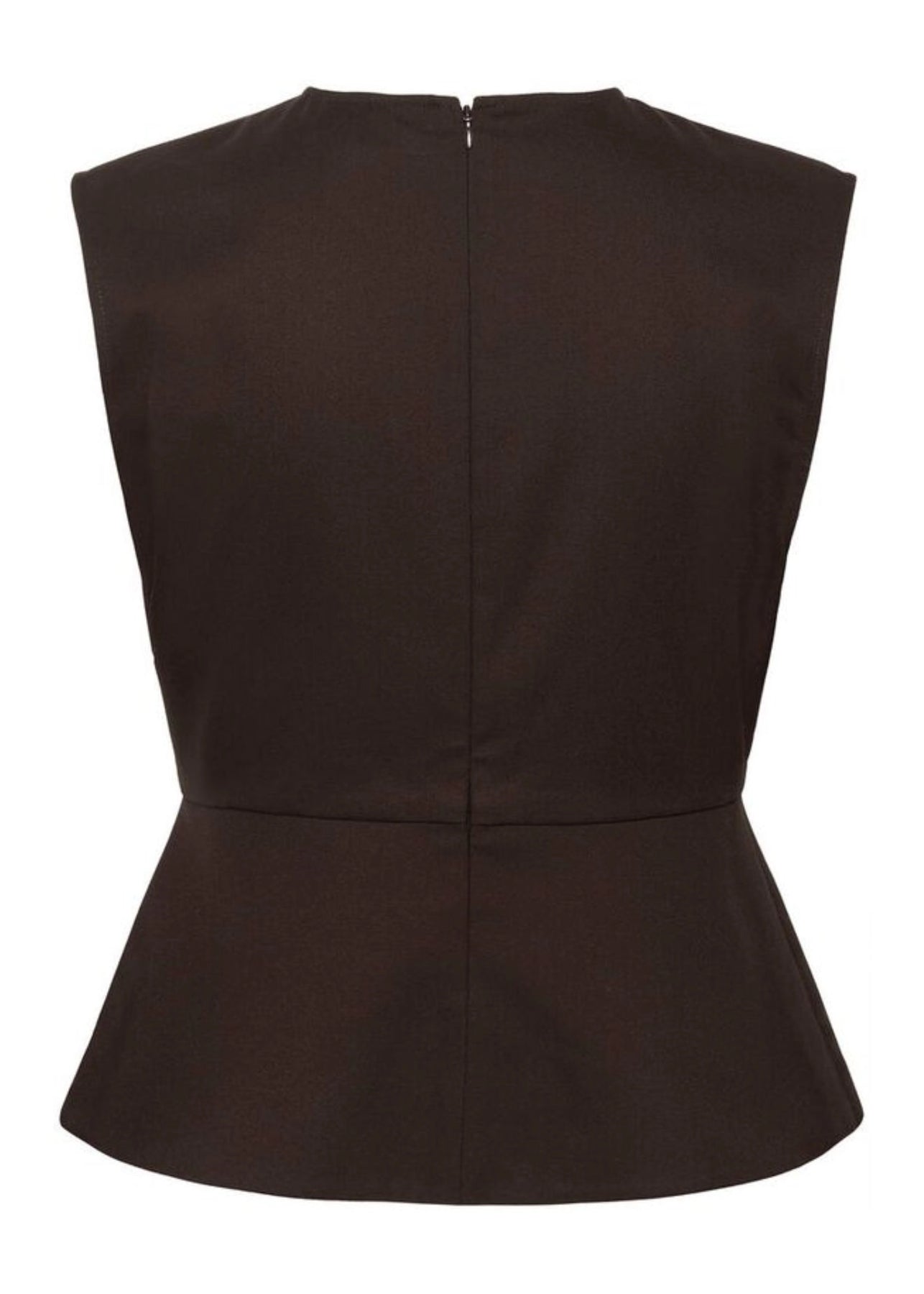 Flot mørkebrun top med peplum fra Gestuz. Toppen har rund hals og en skjult lynlås ned langs ryggen.