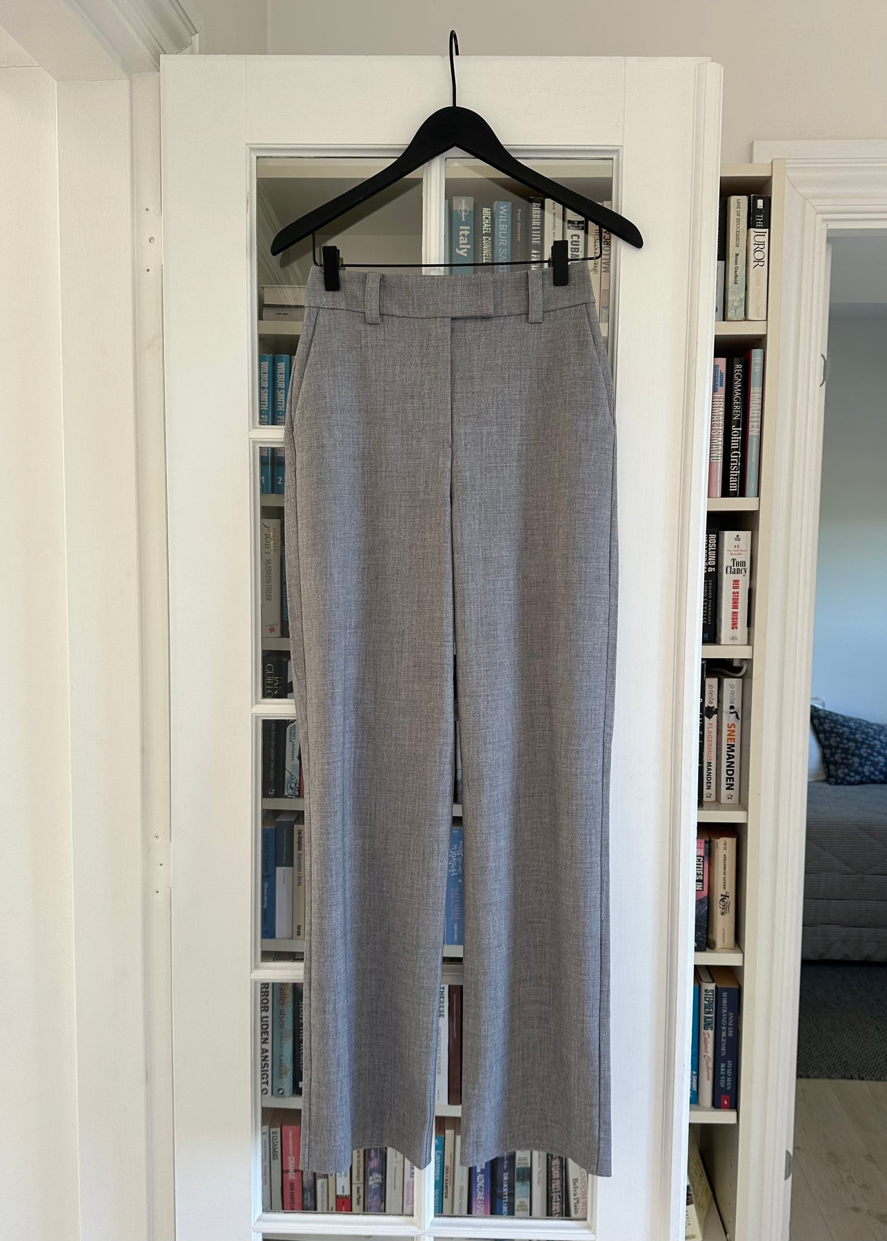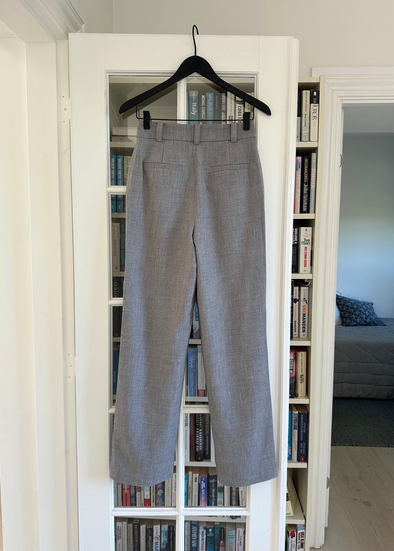 Grå habitbukser fra Modström i vævet kvalitet. Bukserne er højtaljede har lynlåsgylp med skjult hægte, skrå sidelommer og snydelommer bagpå. De har lige ben.
