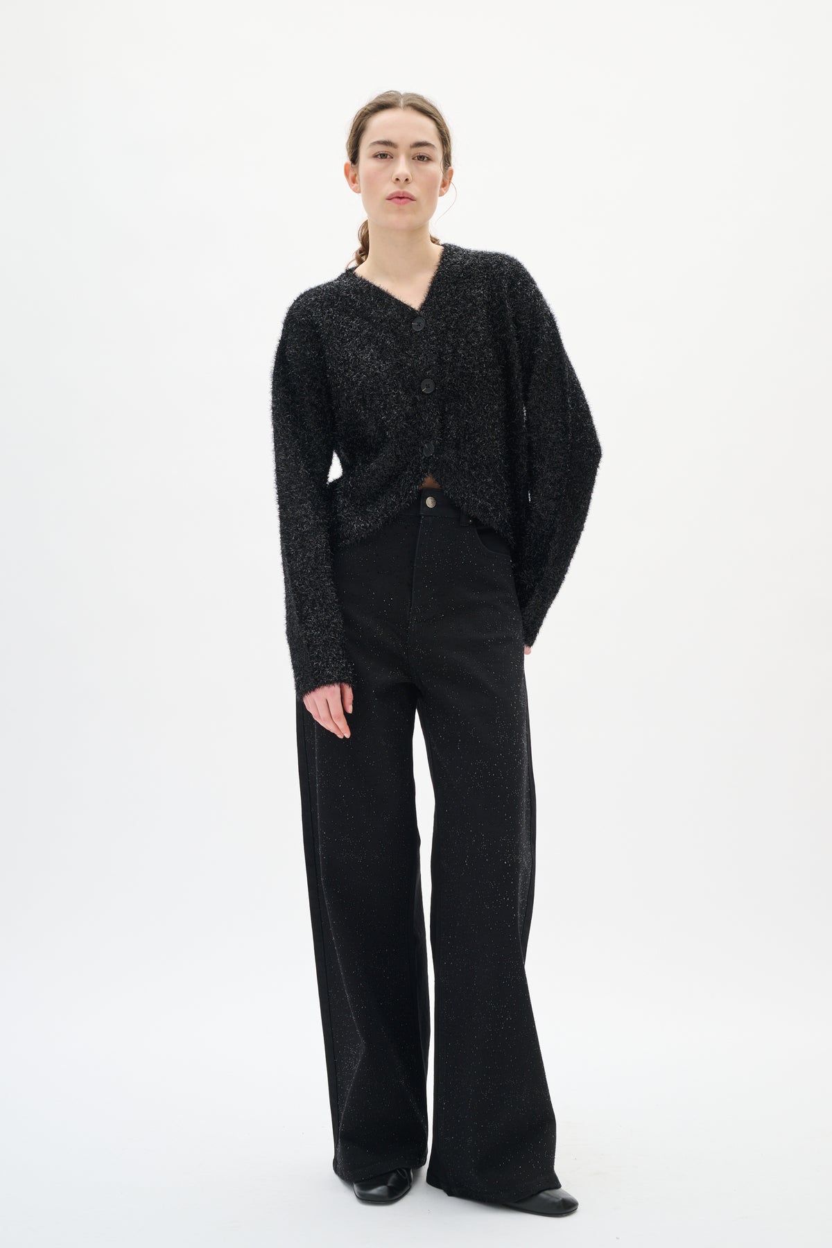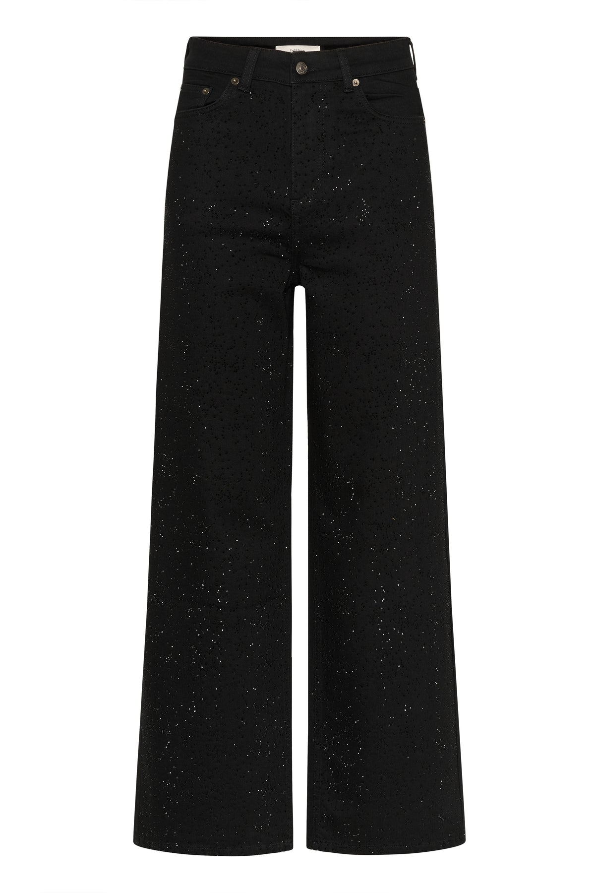 Cool sorte jeans diskrete metaleffekter. Bukserne er højtaljede og klassiske jeans lommer og brede ben.