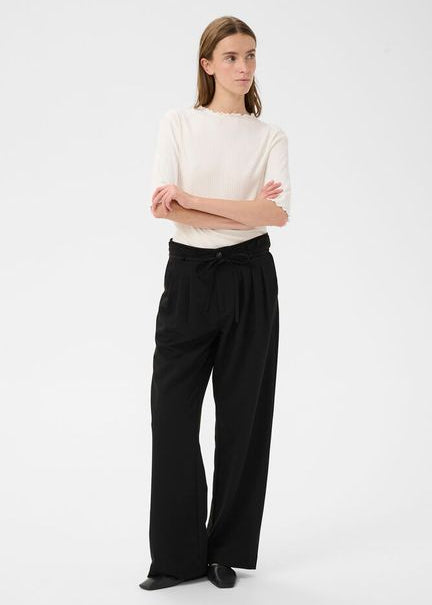 Lækre sorte bukser fra Karen by Simonsen i en let kvalitet. Bukserne har læg foran, løse ben, sidelommer og aftageligt bindebånd i livet.