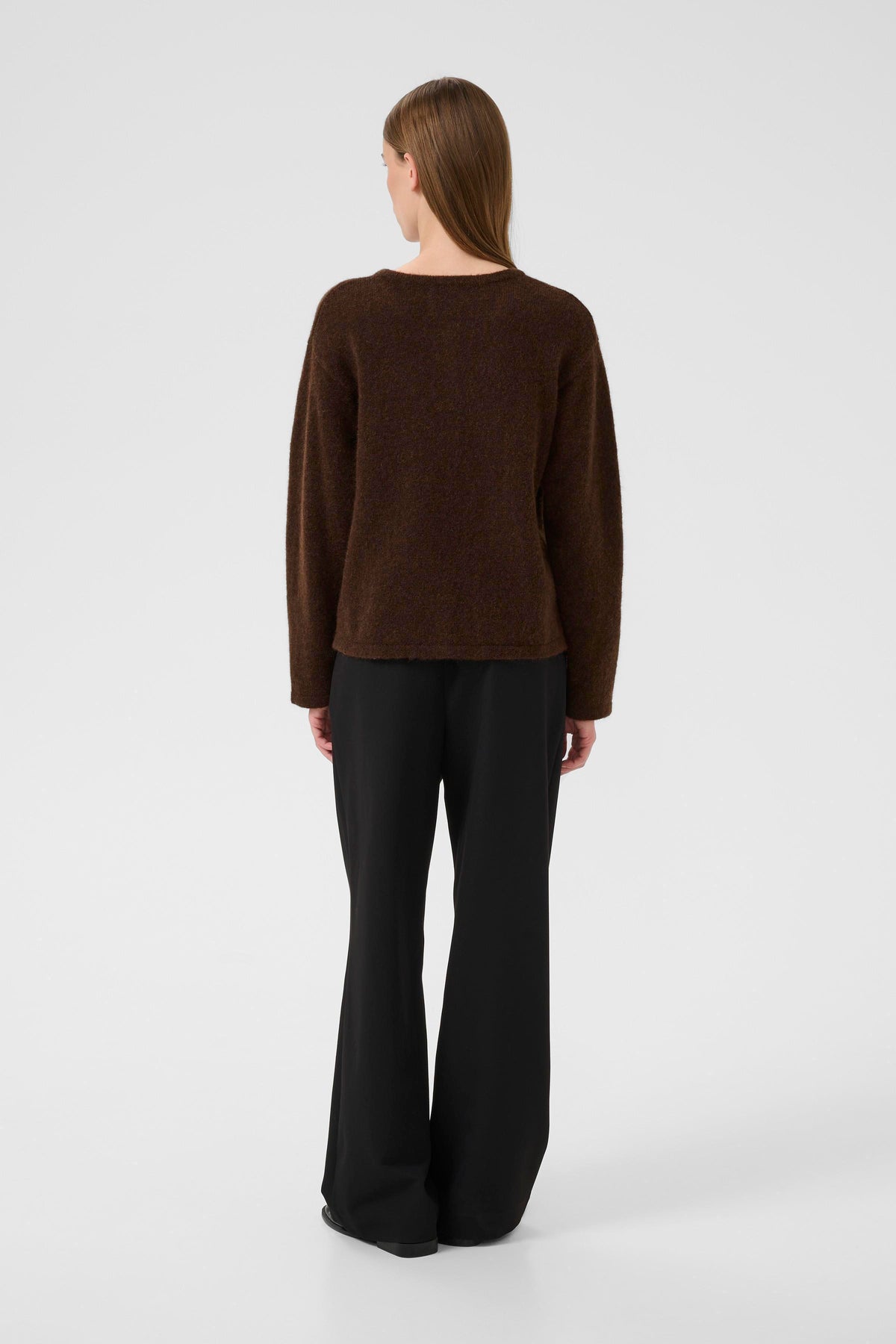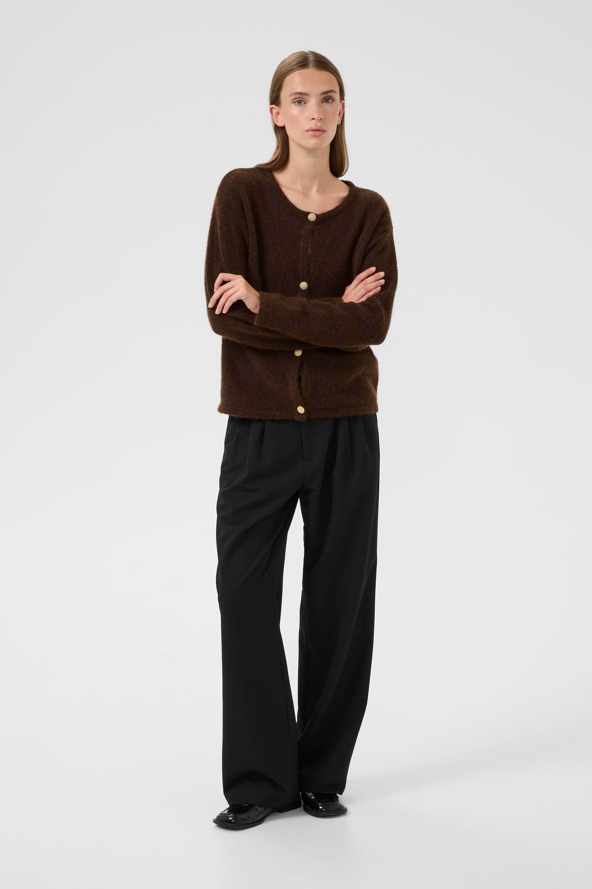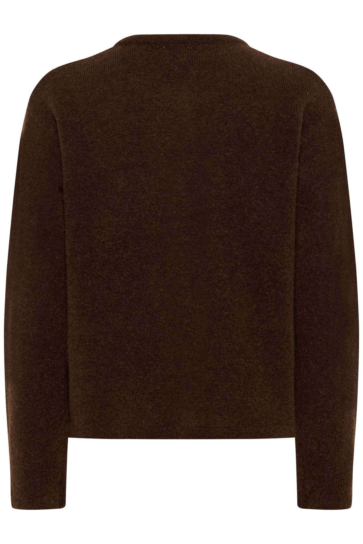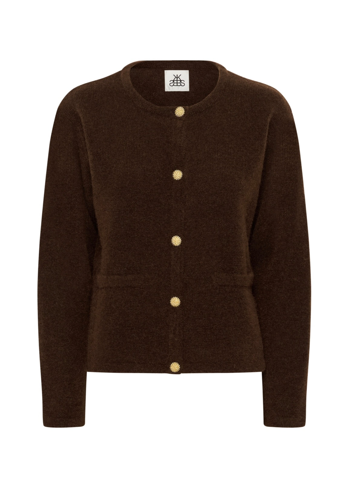 Skøn brun cardigan i let mohairmix. Cardiganen har rund hals, lange ærmer, knaplukning og en lige pasform.