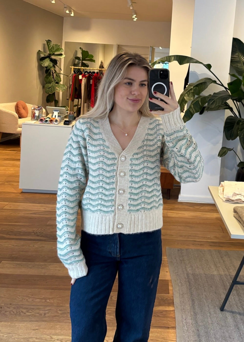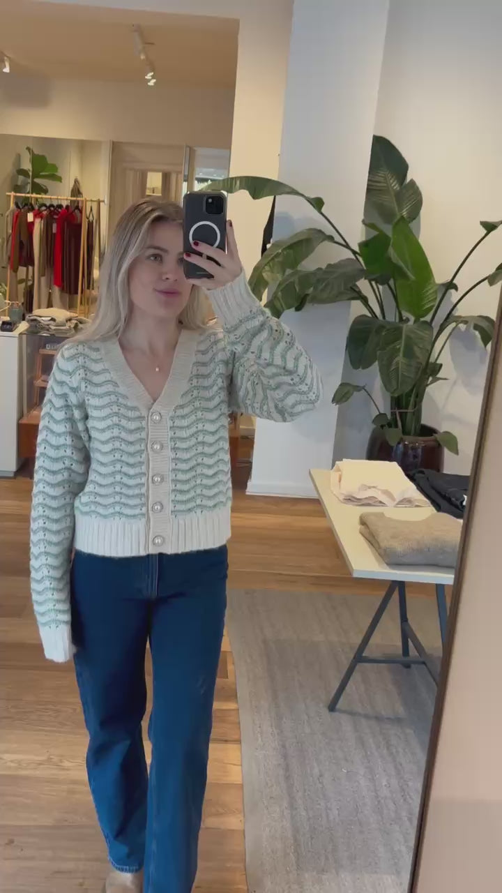 Smuk hulmønsteret cardigan i lysegrøn og off-white. Cardigan har v-udskæring, fine knapper, lange ærmer og en lidt kort løs pasform.