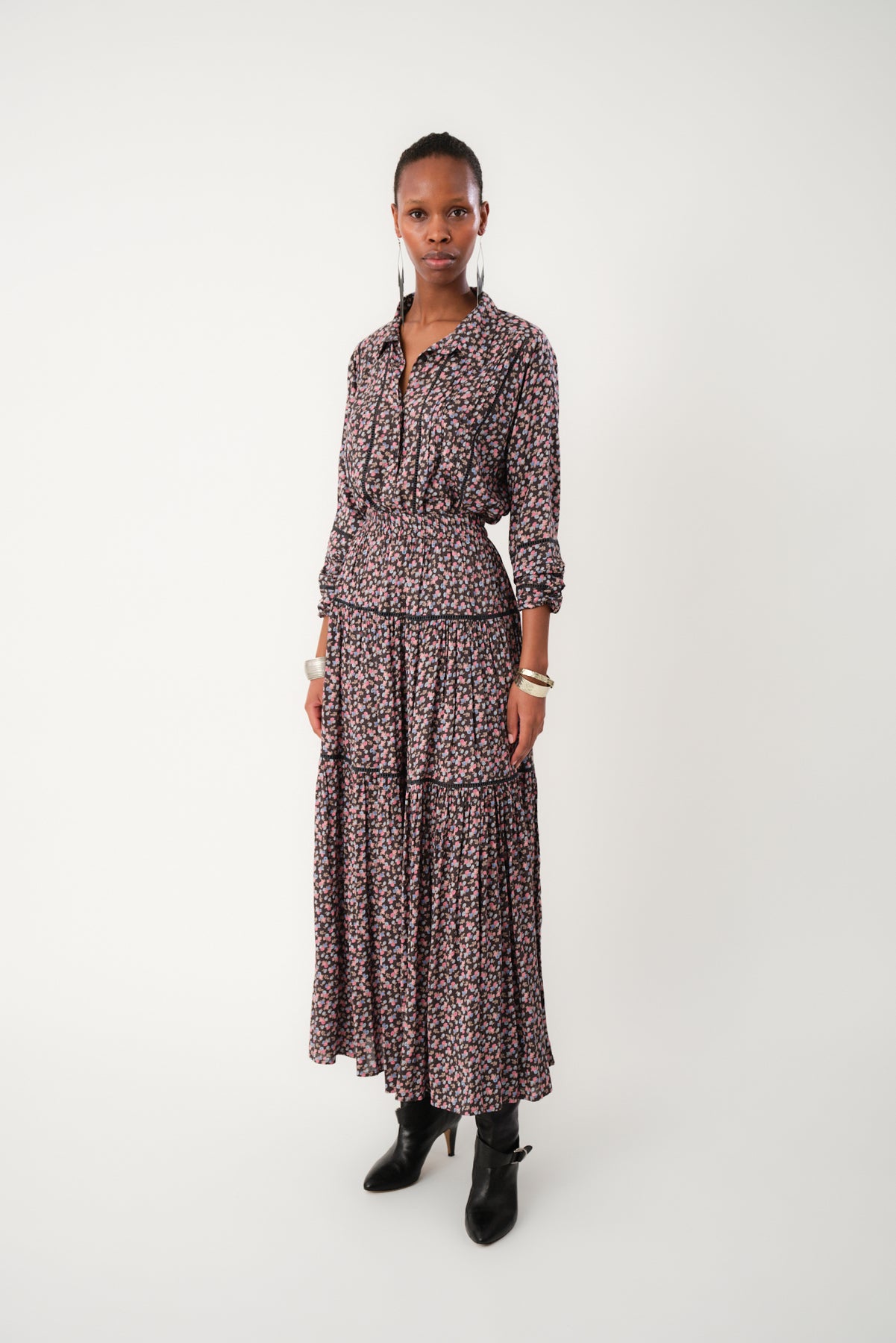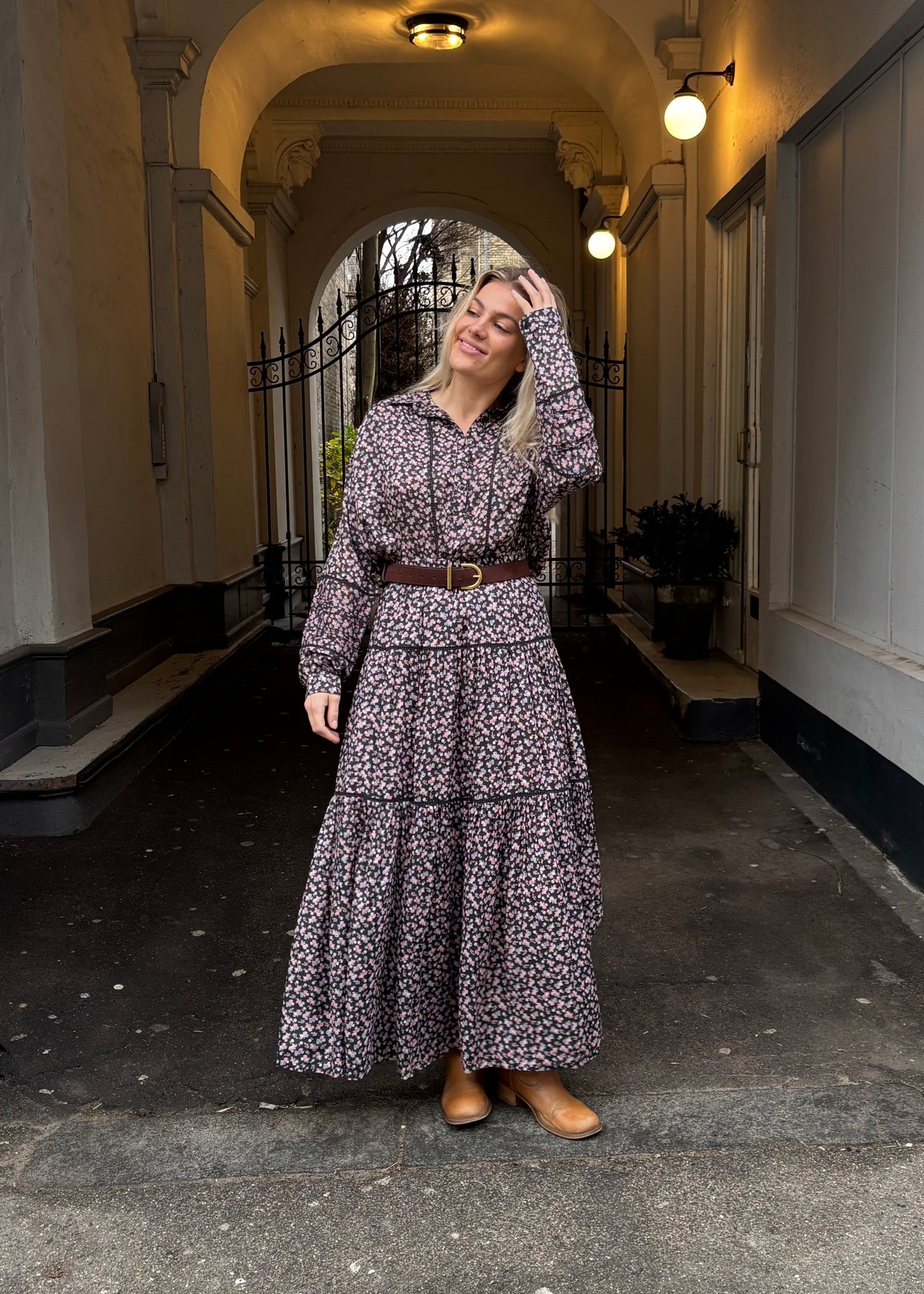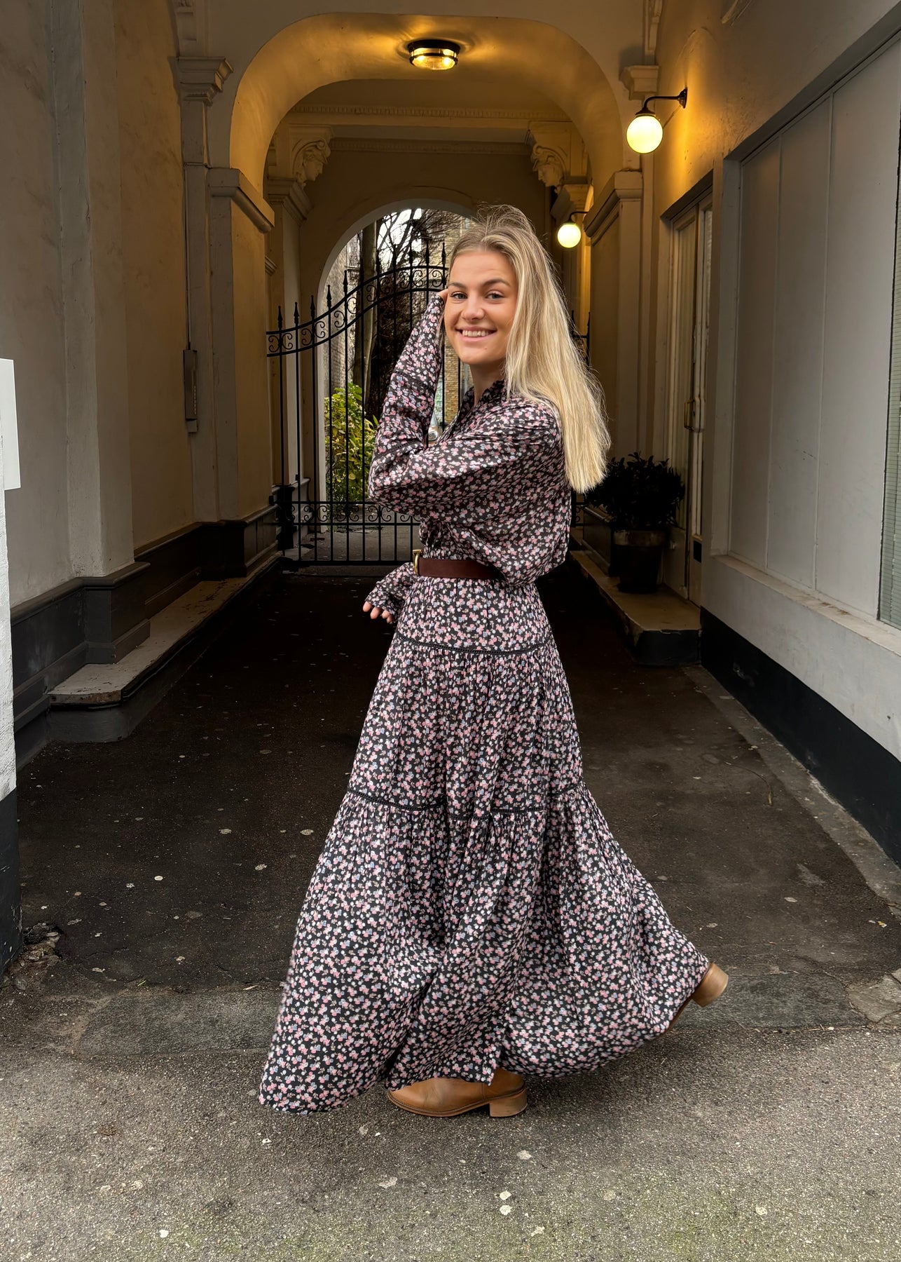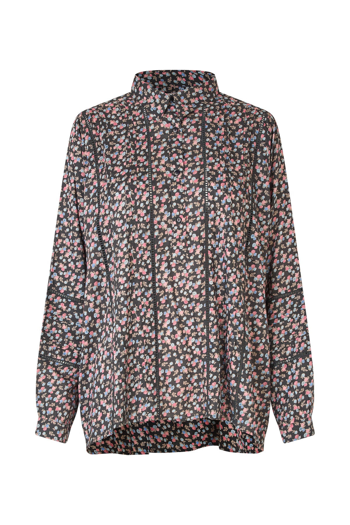 Blomstret skjorte fra Lollys Laundry. Den har to sorte vertikale linjer foran og to diagonale linjer på på underarmene. Oversize/løs pasform.