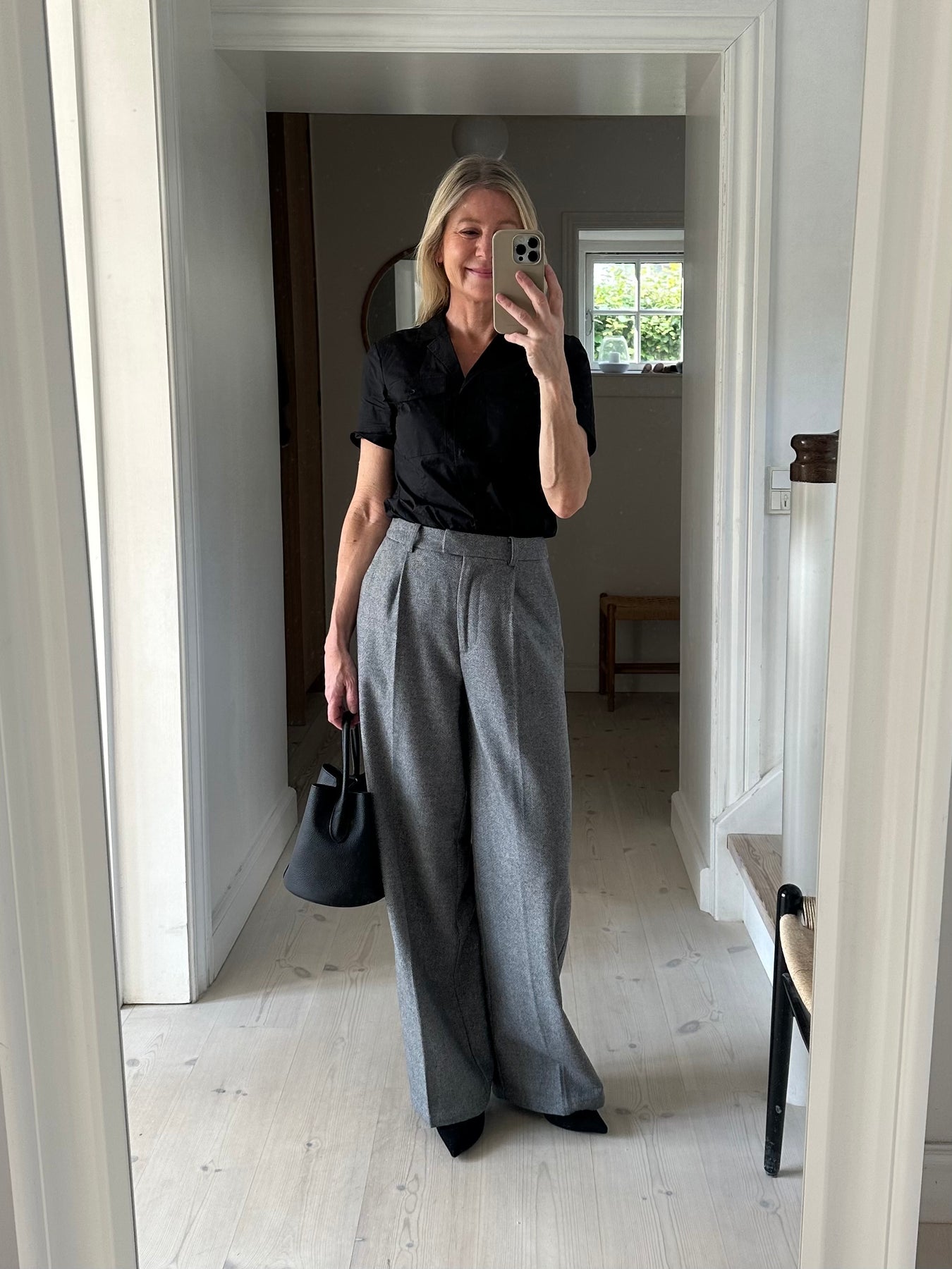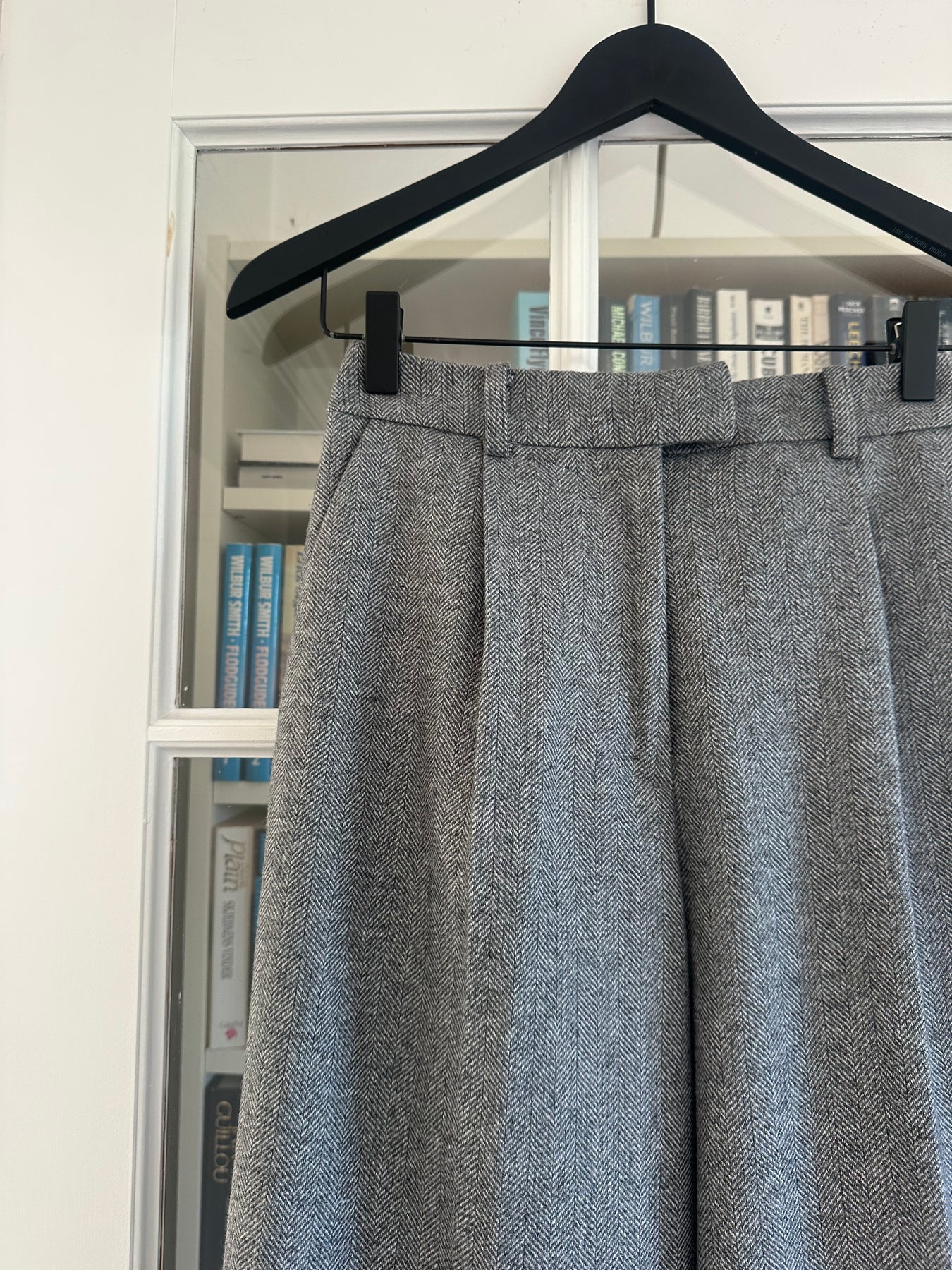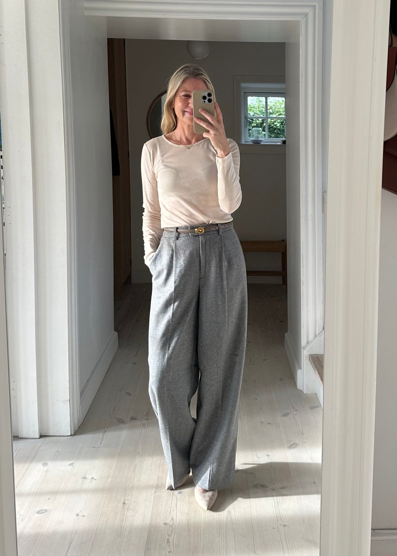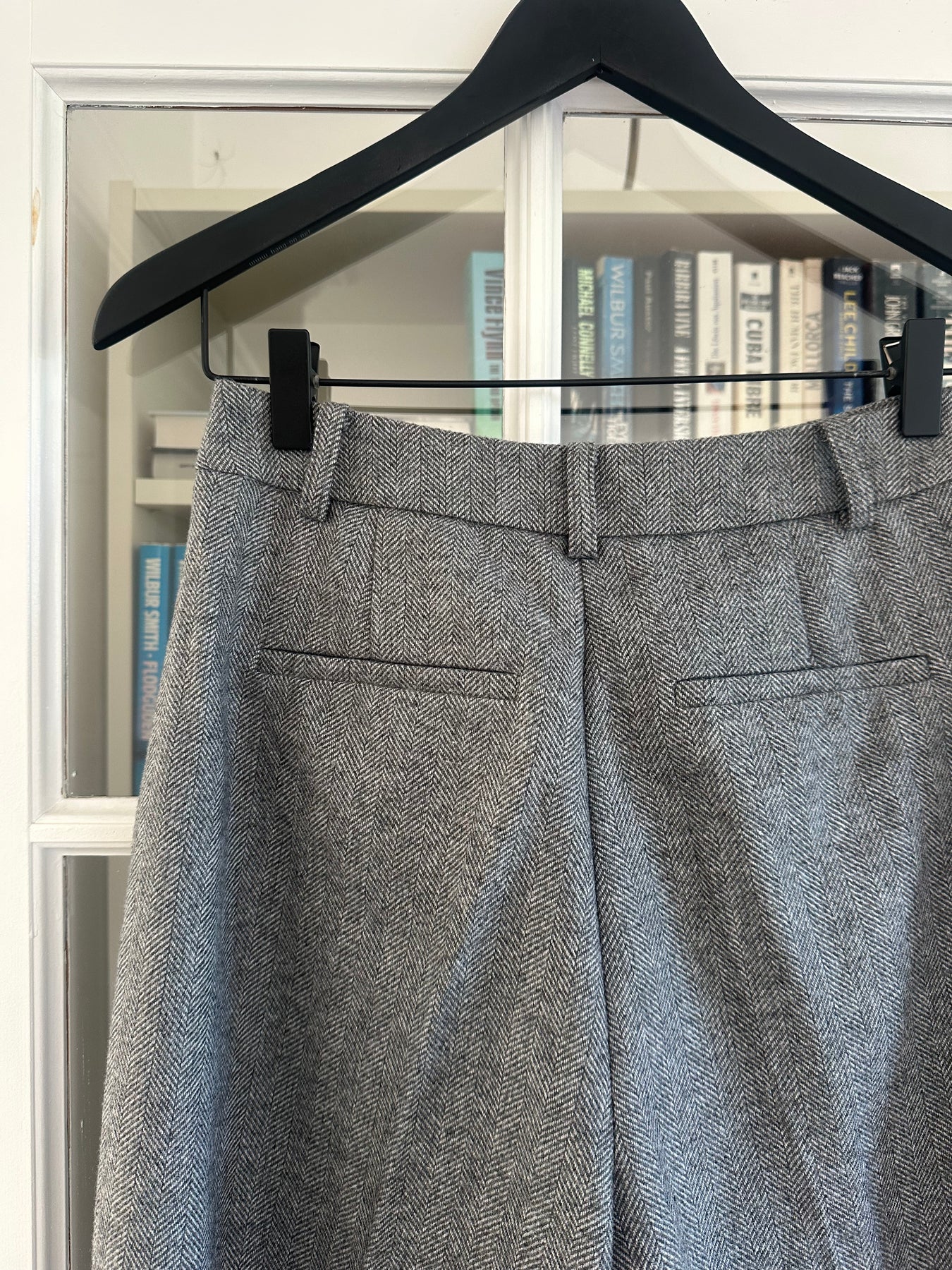 Lækre grå habitbukser fra Modström i kraftig kvalitet og med 20% uld. Bukserne har brede ben, høj talje, lynlåsgylp og pressefolder samt sidelommer og paspoleredebaglommer.