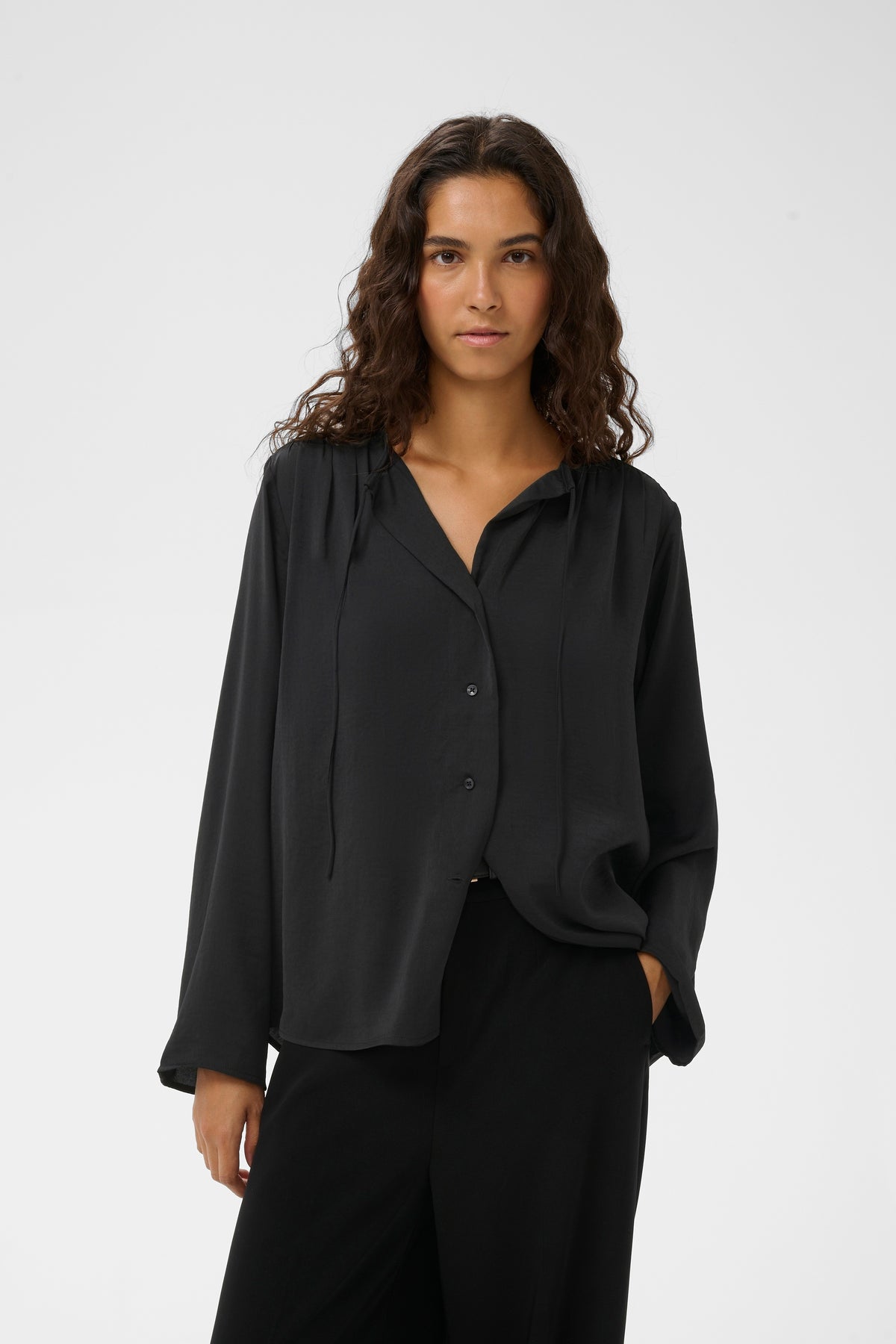 Elegant sort skjortebluse i blød satin. Skjorten har rund hals med bindbånd og knapper foran.