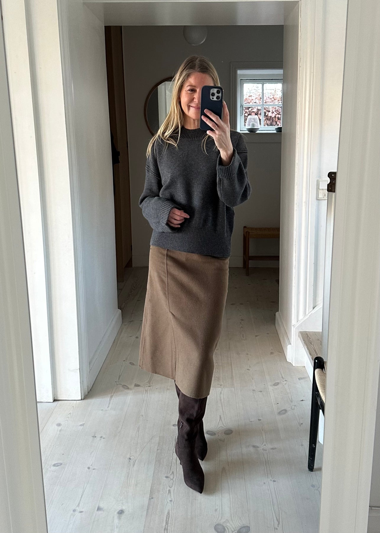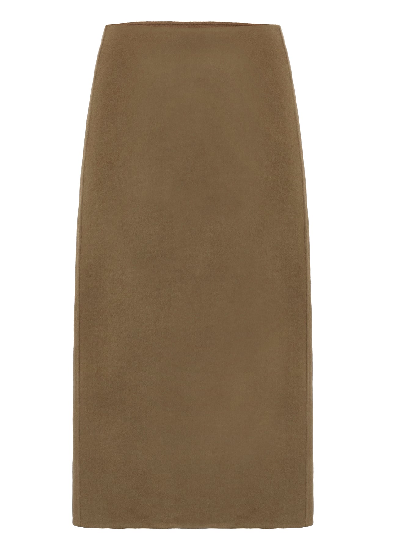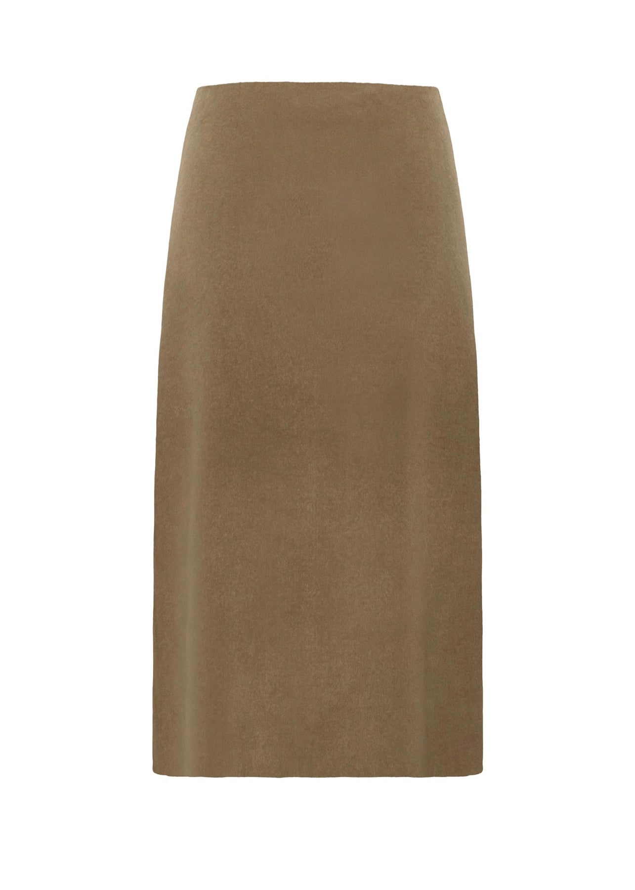 Lækker uldnederdel fra Minimum i flot brun farve. Nederdelen har en lige pasform, slids foran og lynlås bagpå.