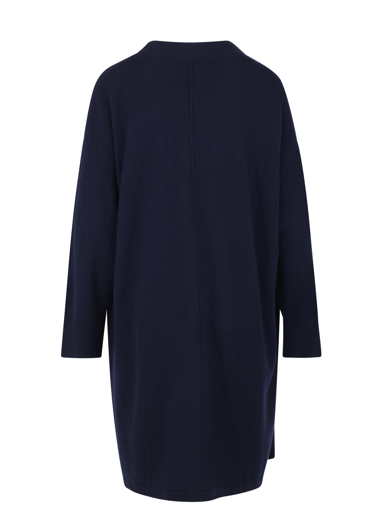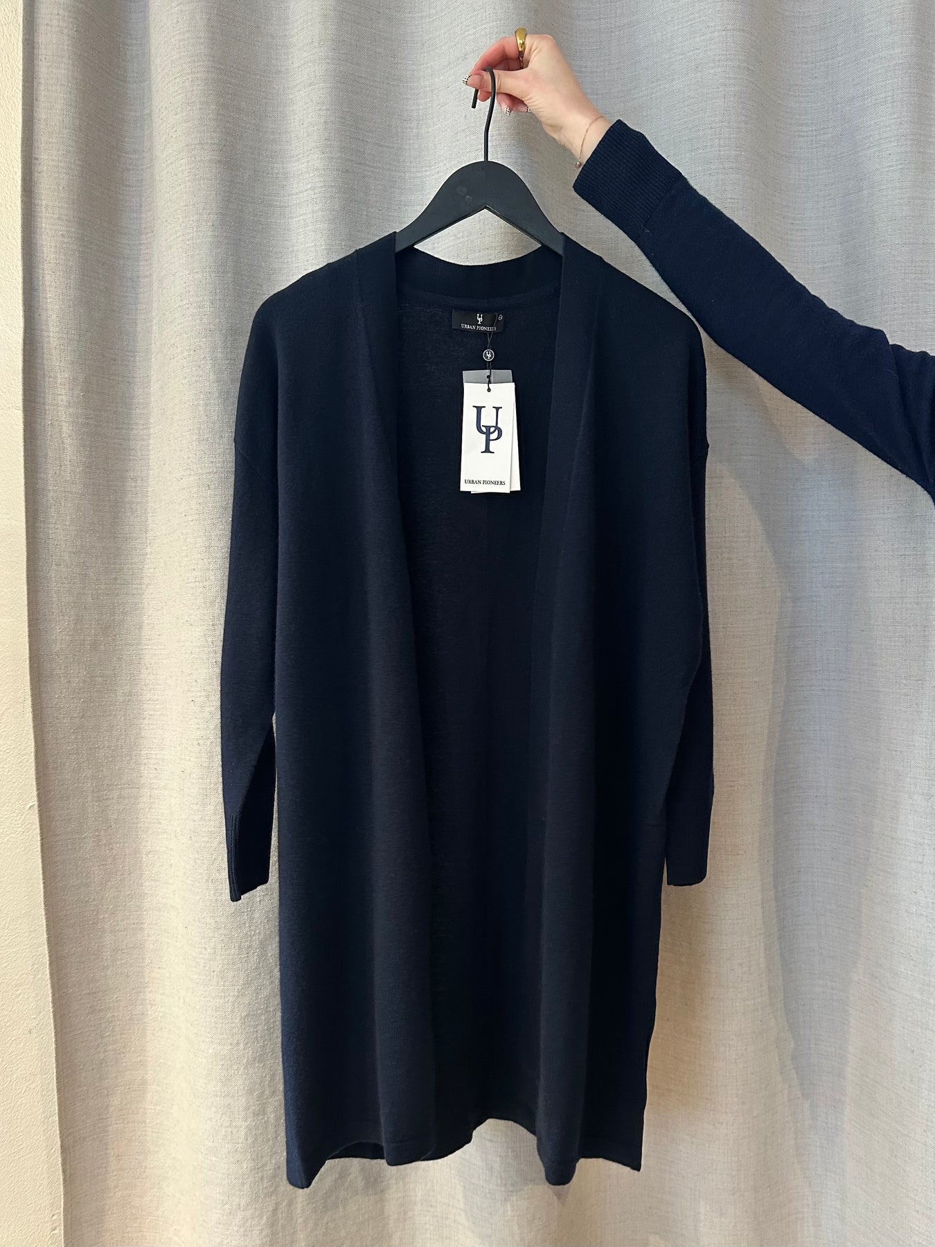 Klassisk navy cardigan fra Urban Pioneers i lækker merinould. Cardiganen er knælang og har lange ærmer.