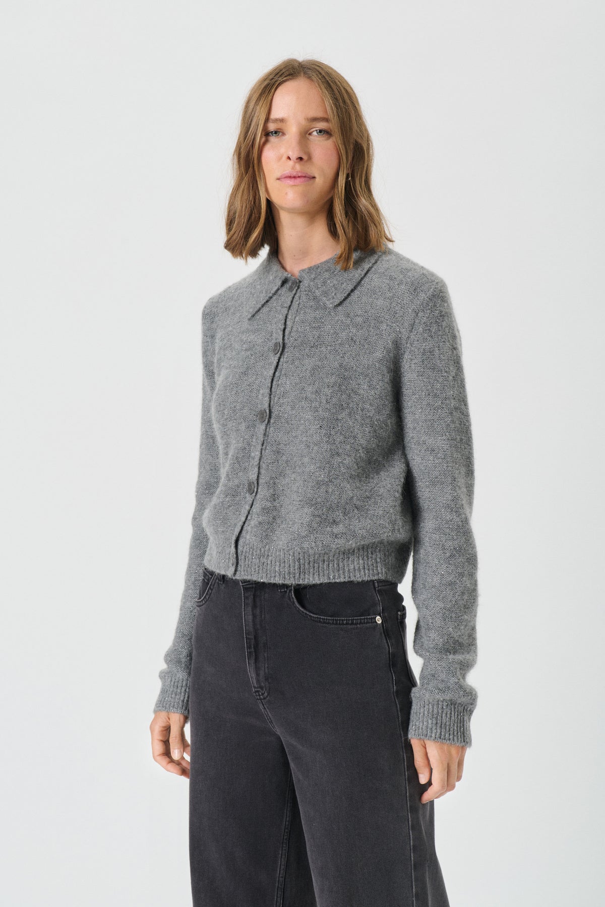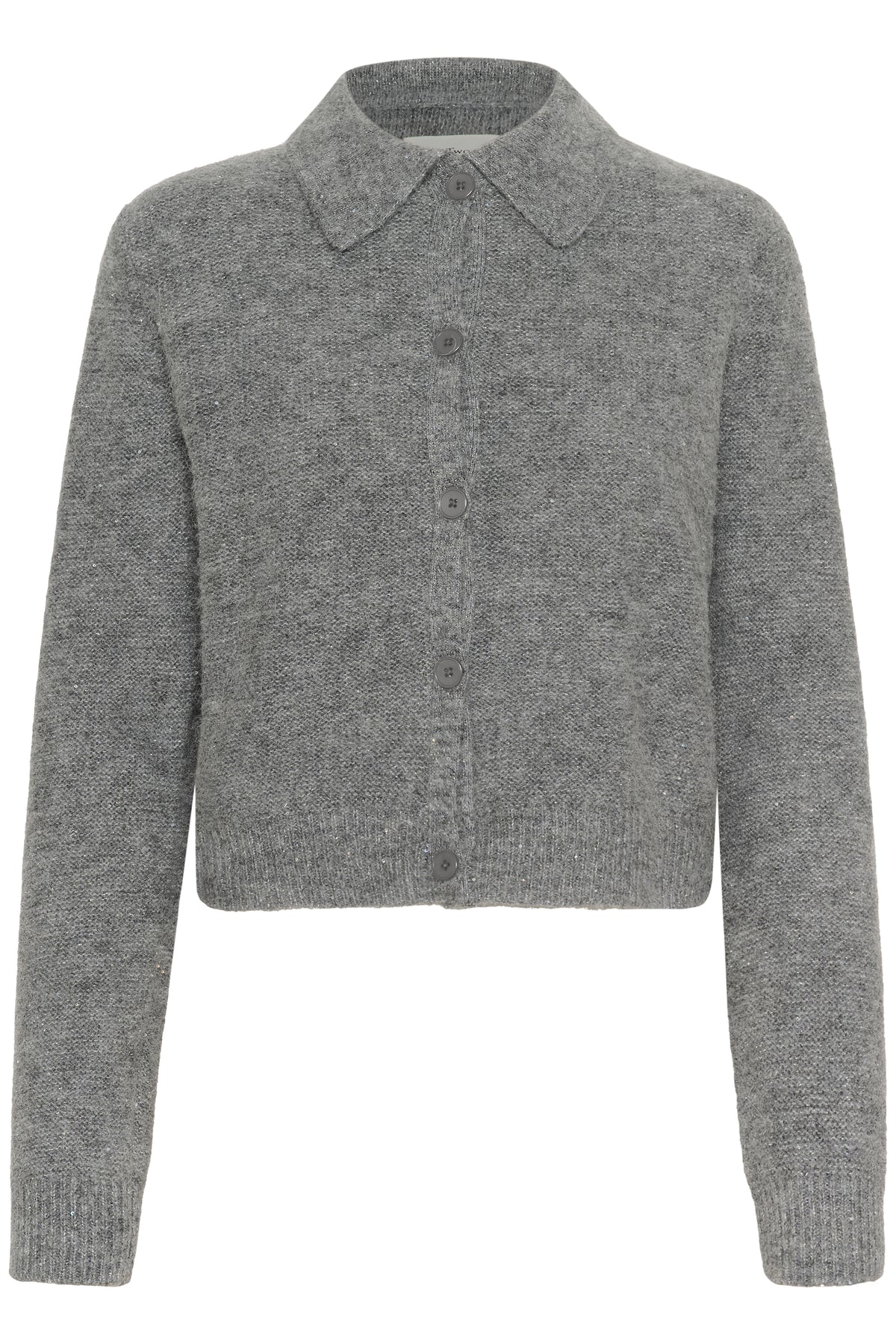 Skøn grå cardigan fra Part Two med krave i en lækker blød kvalitet med bittesmå pailletter i.