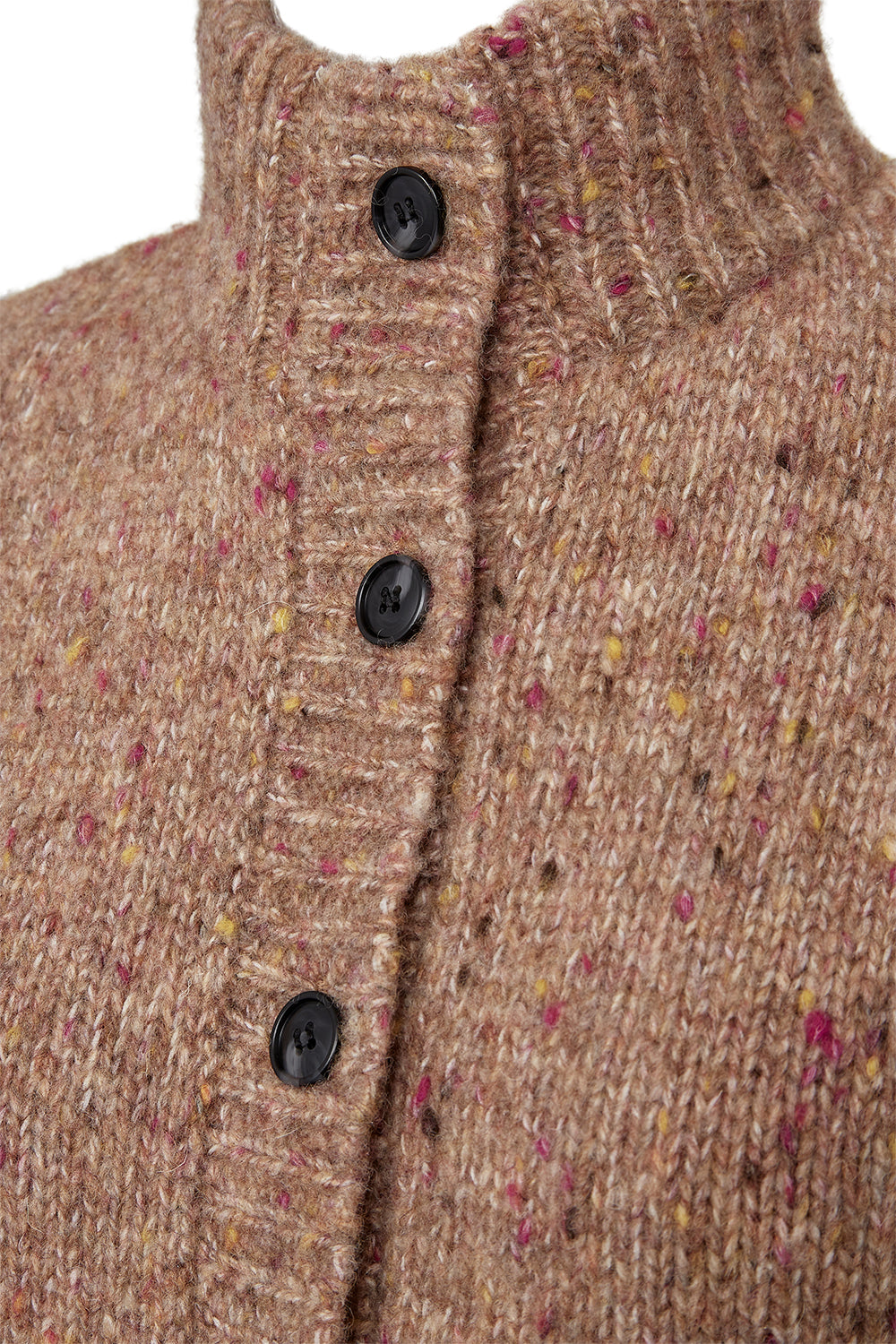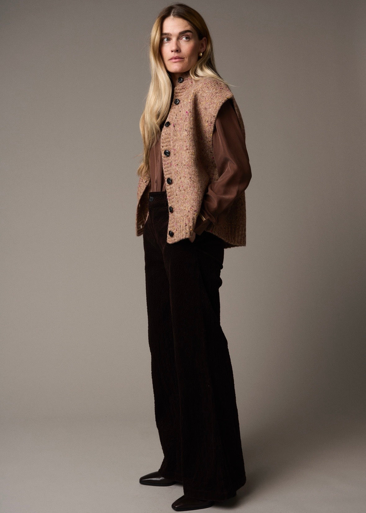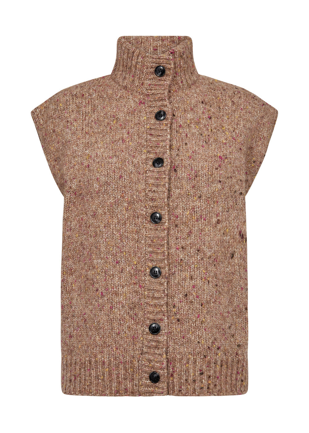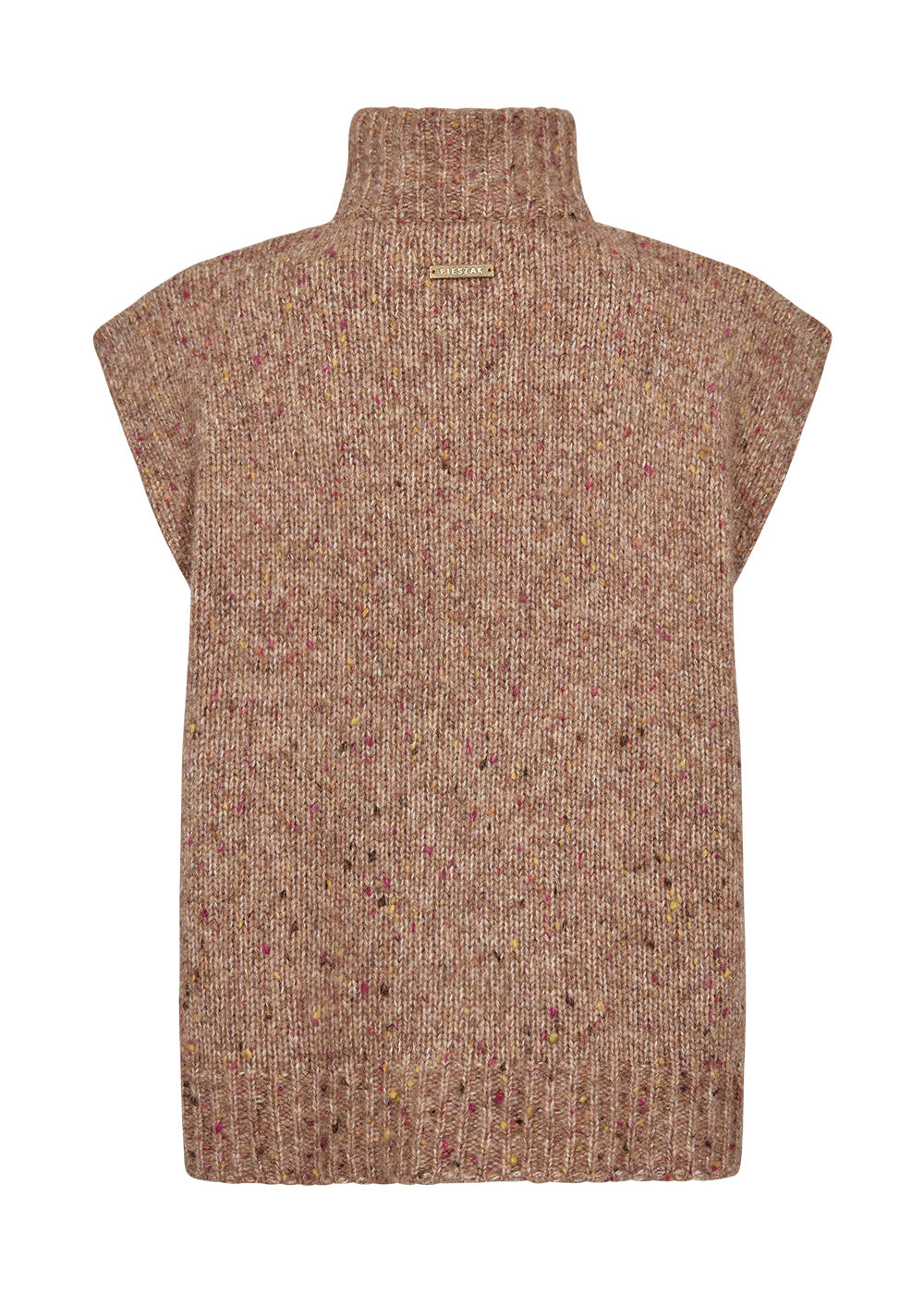 Lækker brunmeleret strikvest fra Pieszak. Vesten har en høj krave og store brune knapper.