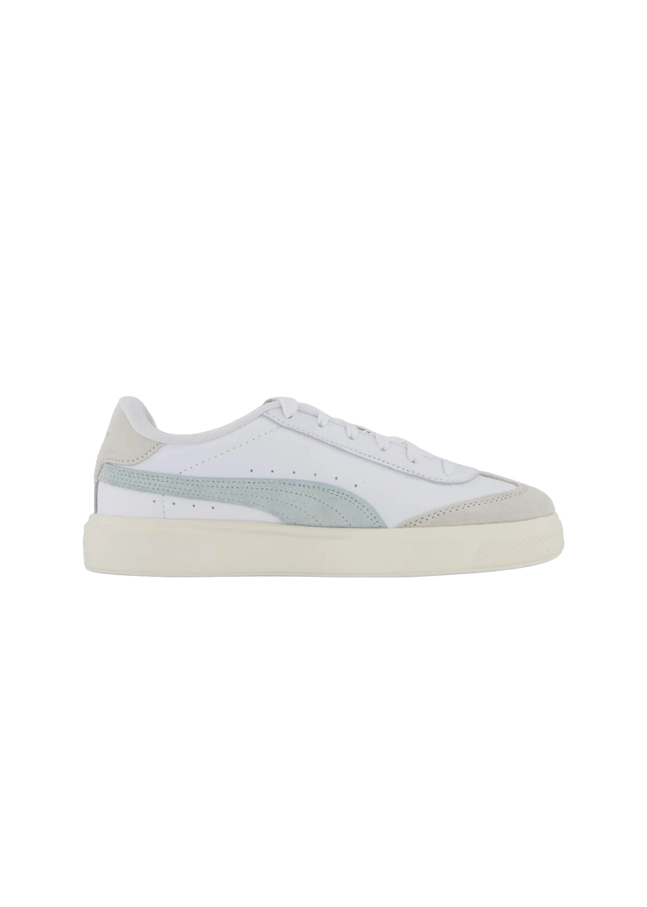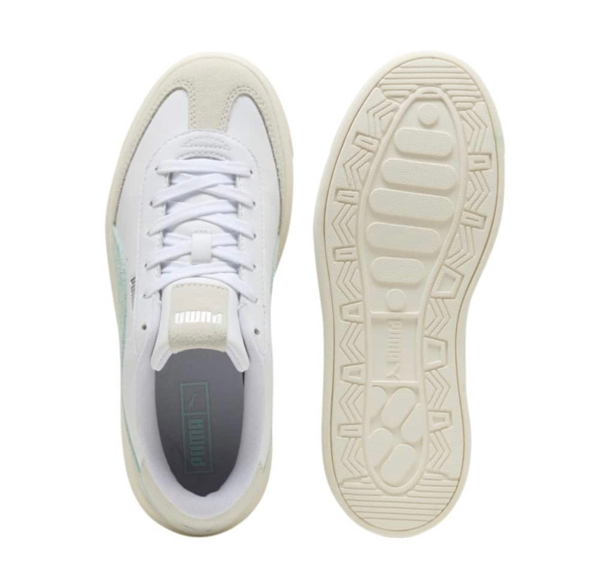 Flotte sneakers fra Puma i hvide med mintfarvet stribe på siden.
