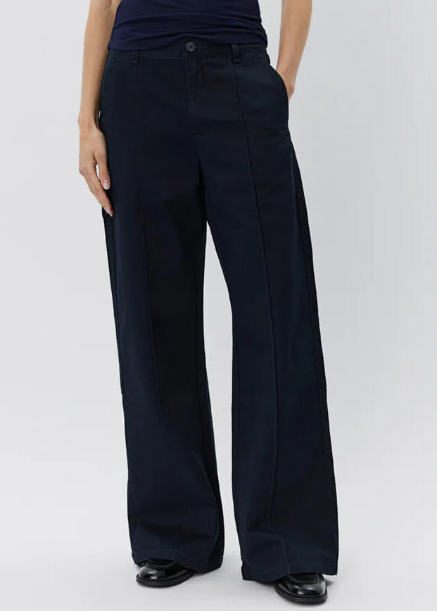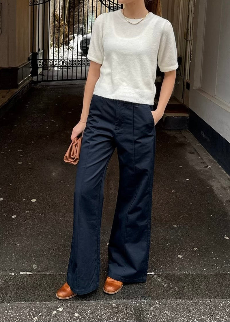 Cool brede navy bukser fra Sofie Schnoor. Bukserne er mid-waist, har læg foran, sidelommer og baglommer.