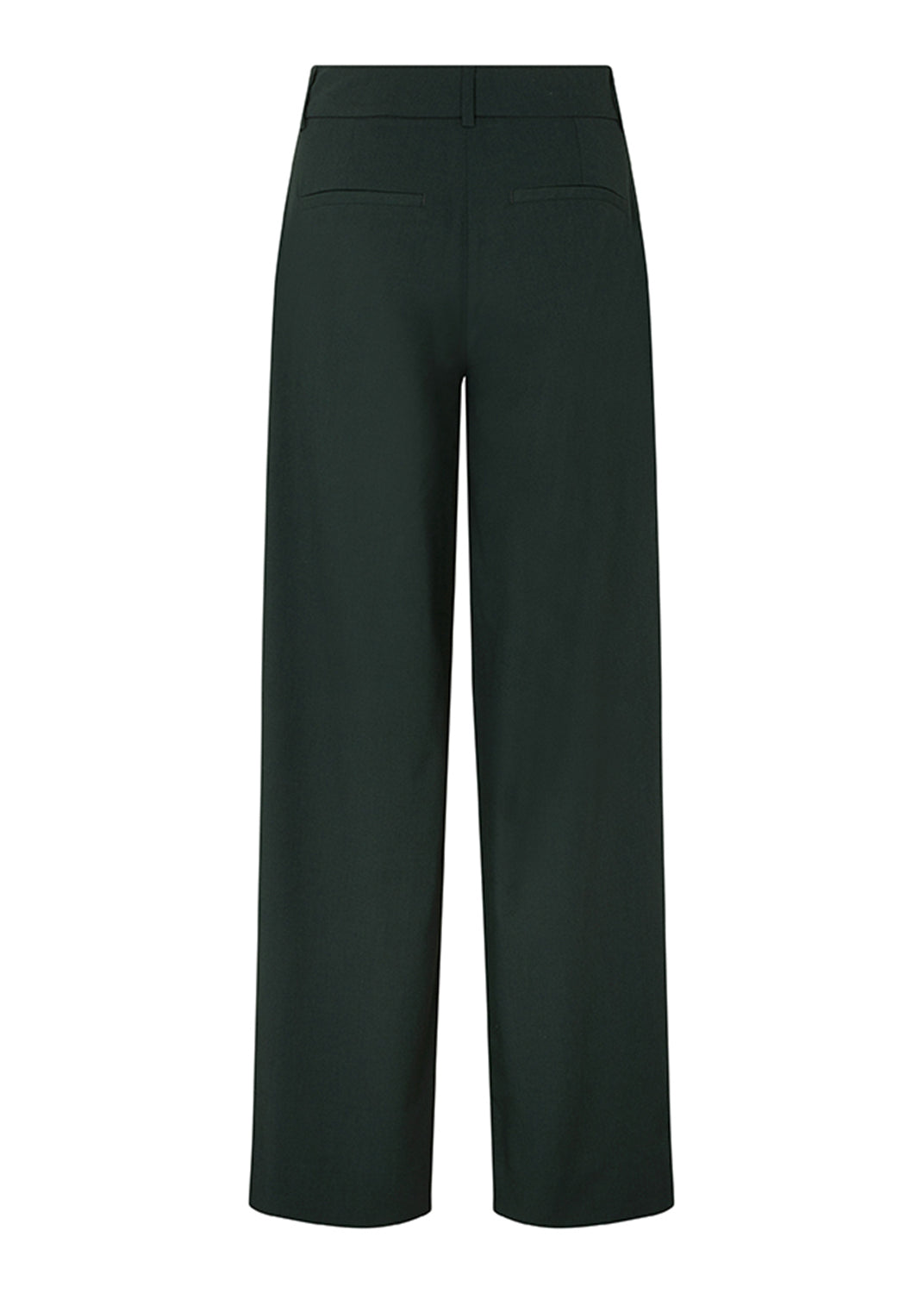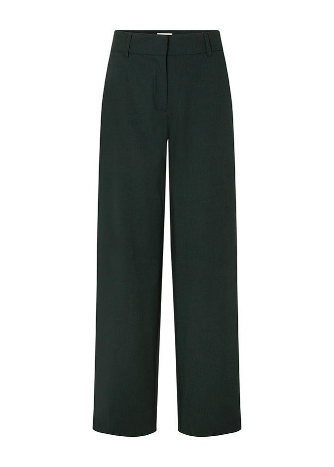 Mørkegrønne habitbukser fra Five Units. De har mellemhøj talje og en løs, behagelig pasform. Bukserne har en formsyet linning og et tungt fald for et rent og klassisk udtryk.