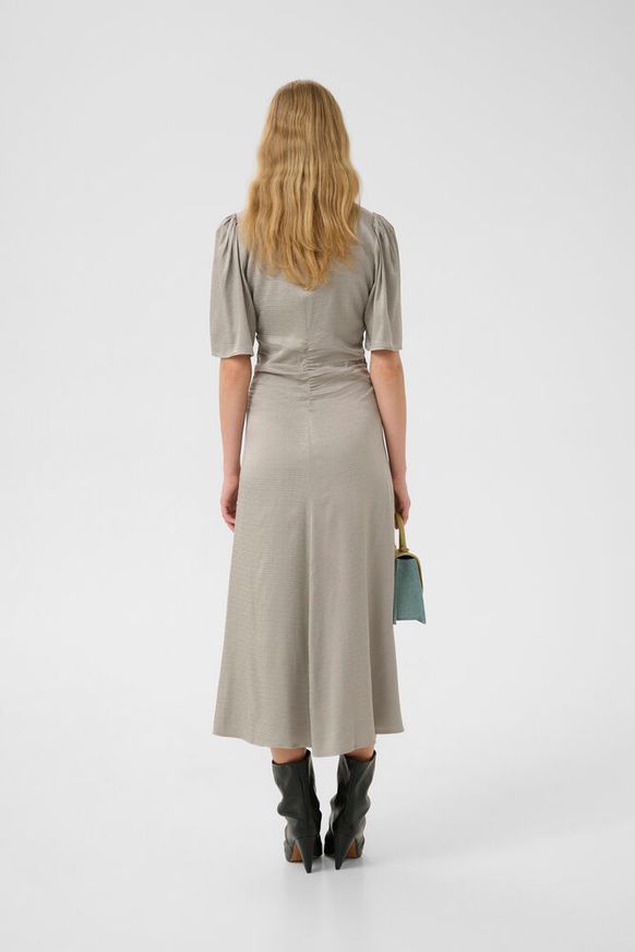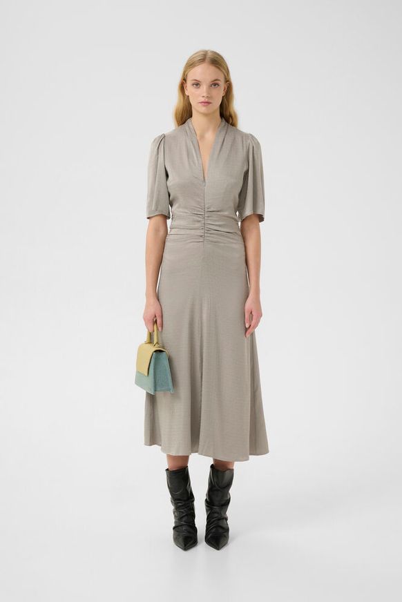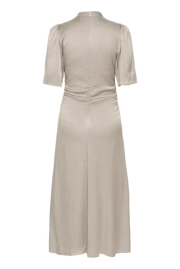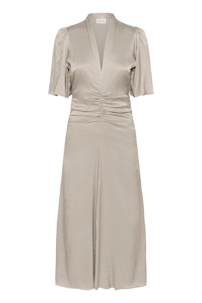 Flot og elegant kjole fra Gestuz. Kjolen har rynk foran, v-udskæring, der kan justere med lynlås, løse korte ærmer og en længde til under knæet.