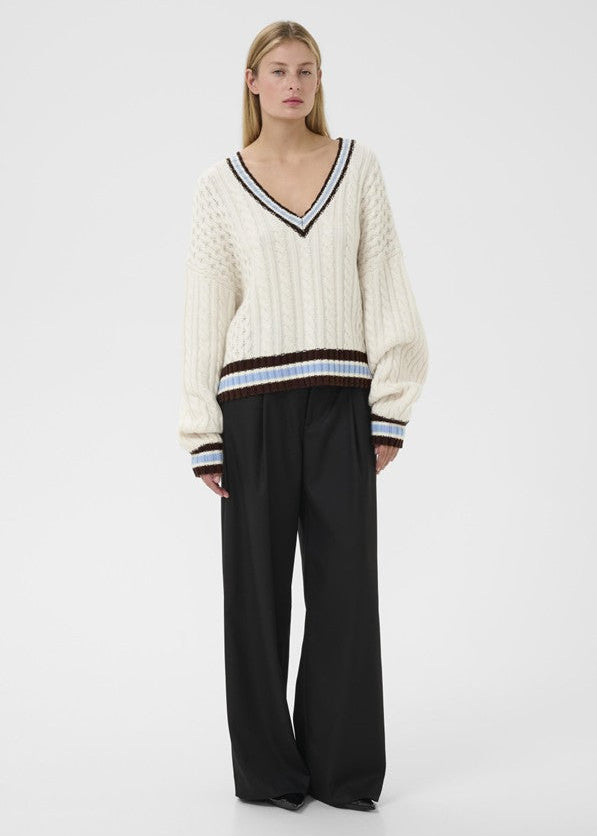Cool pullover fra Gestuz med kabelstrik og kontraststriber. Pulloveren har v-hals, lange ærmer og en løs pasform.