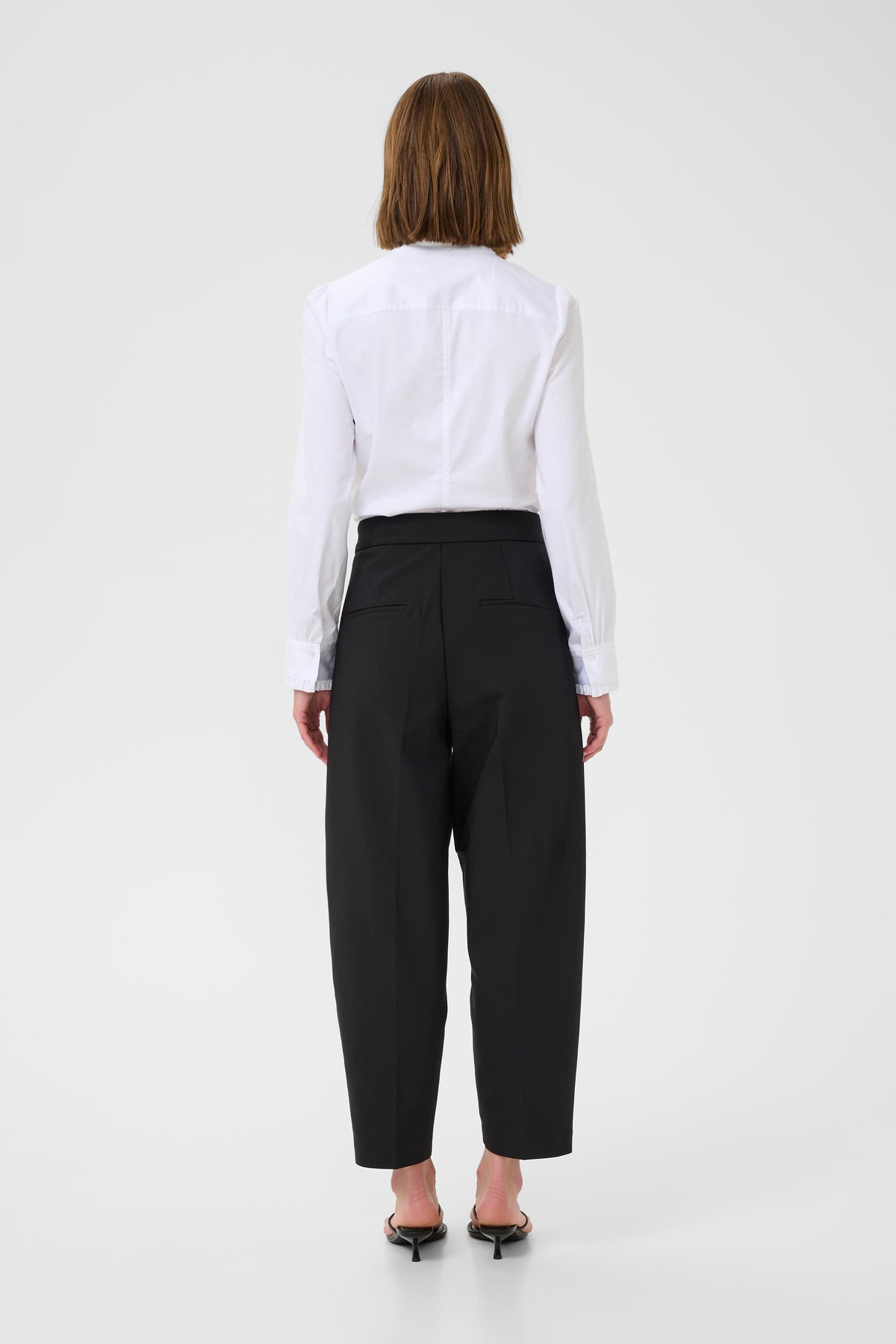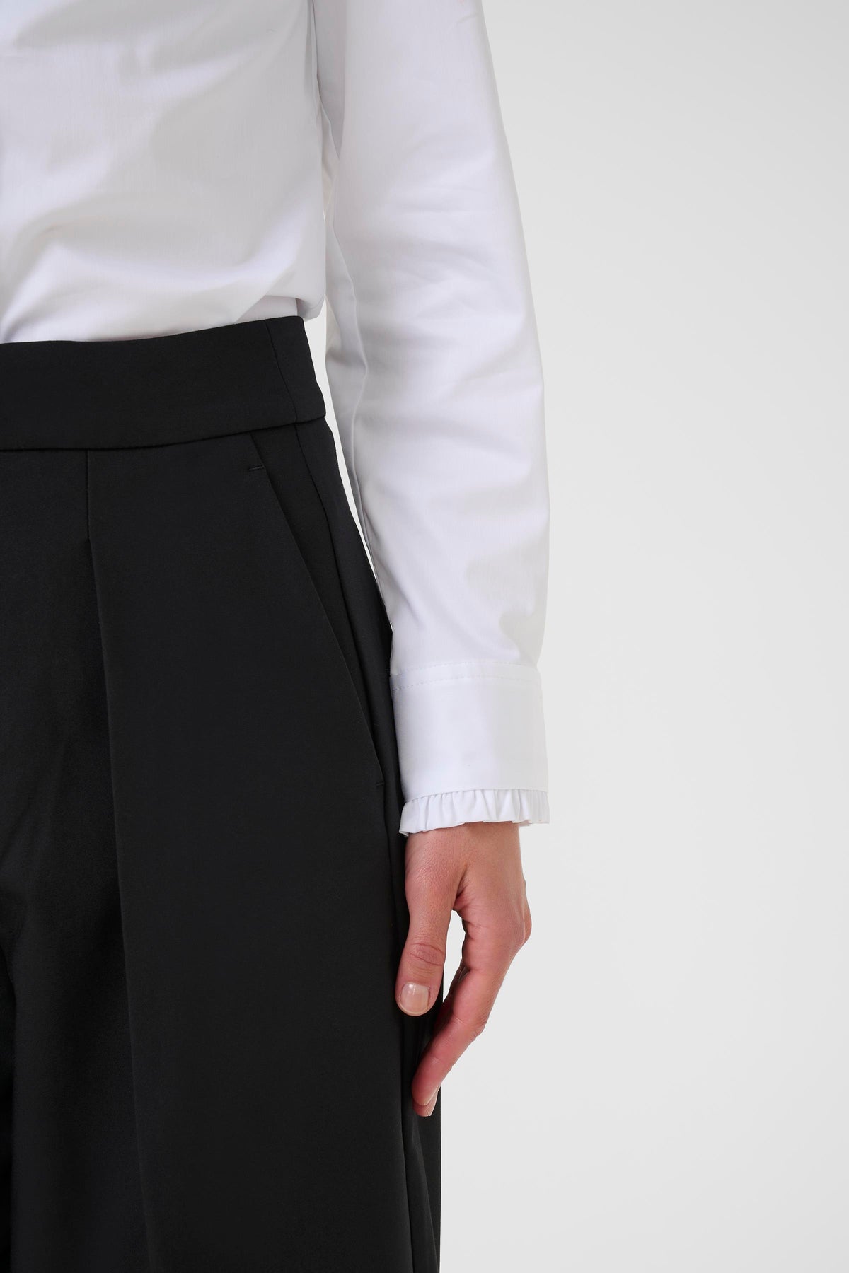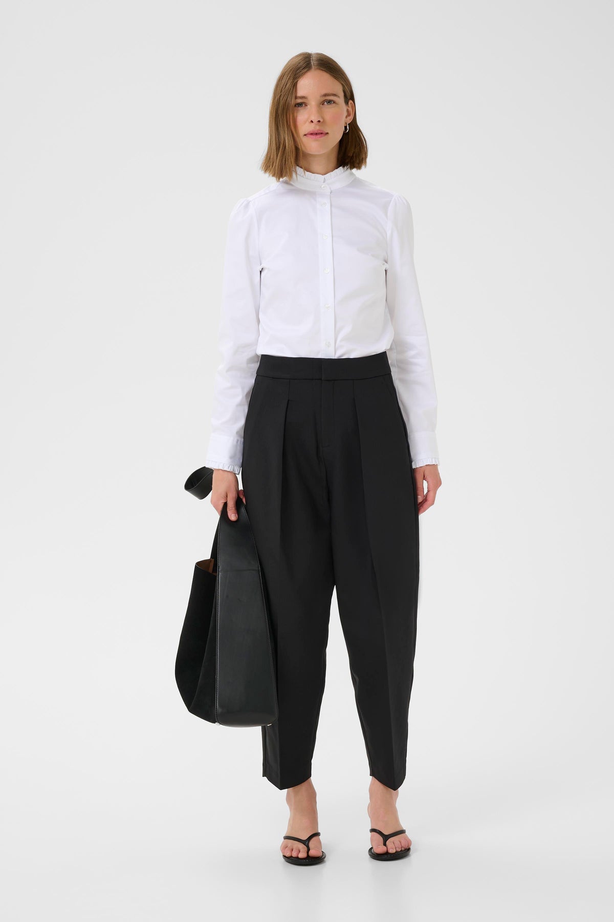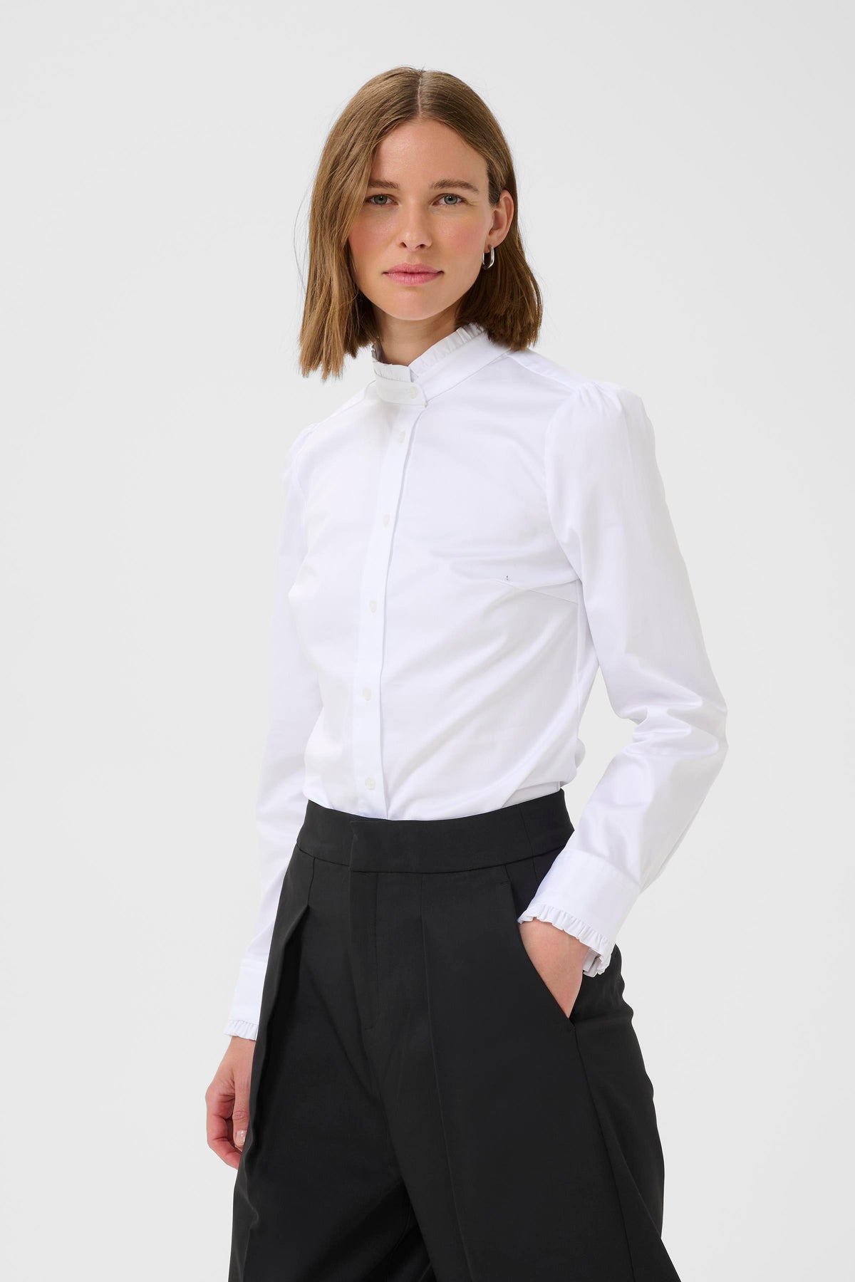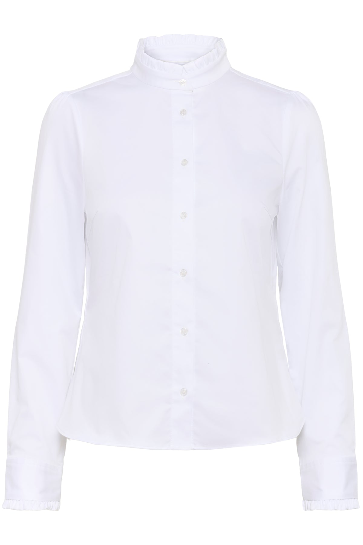 Hvid skjorte fra Inwear med knaplukning, høj, rynket standkrave, lange ærmer med diskret rynkedetalje ved manchet og glat, skarp finish.