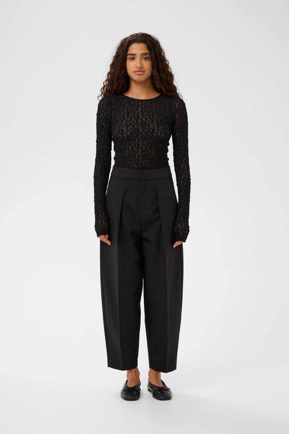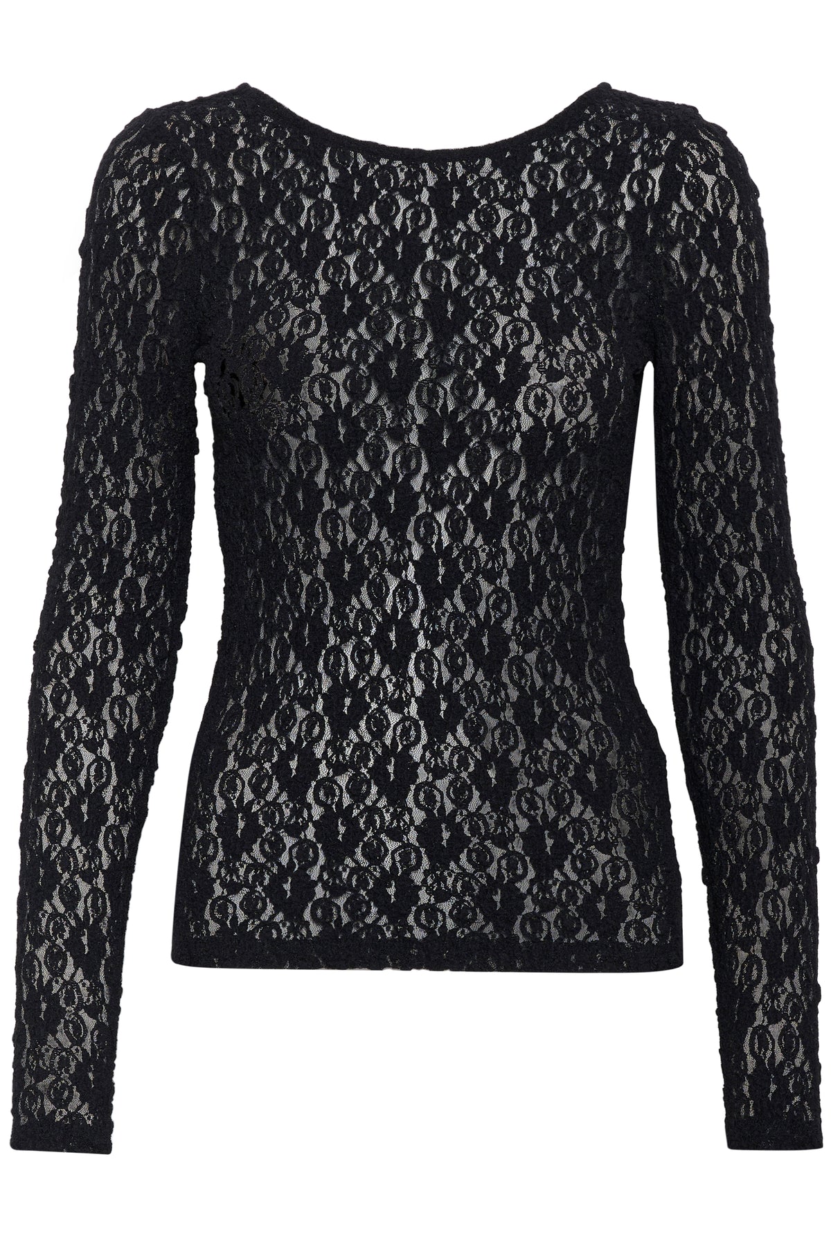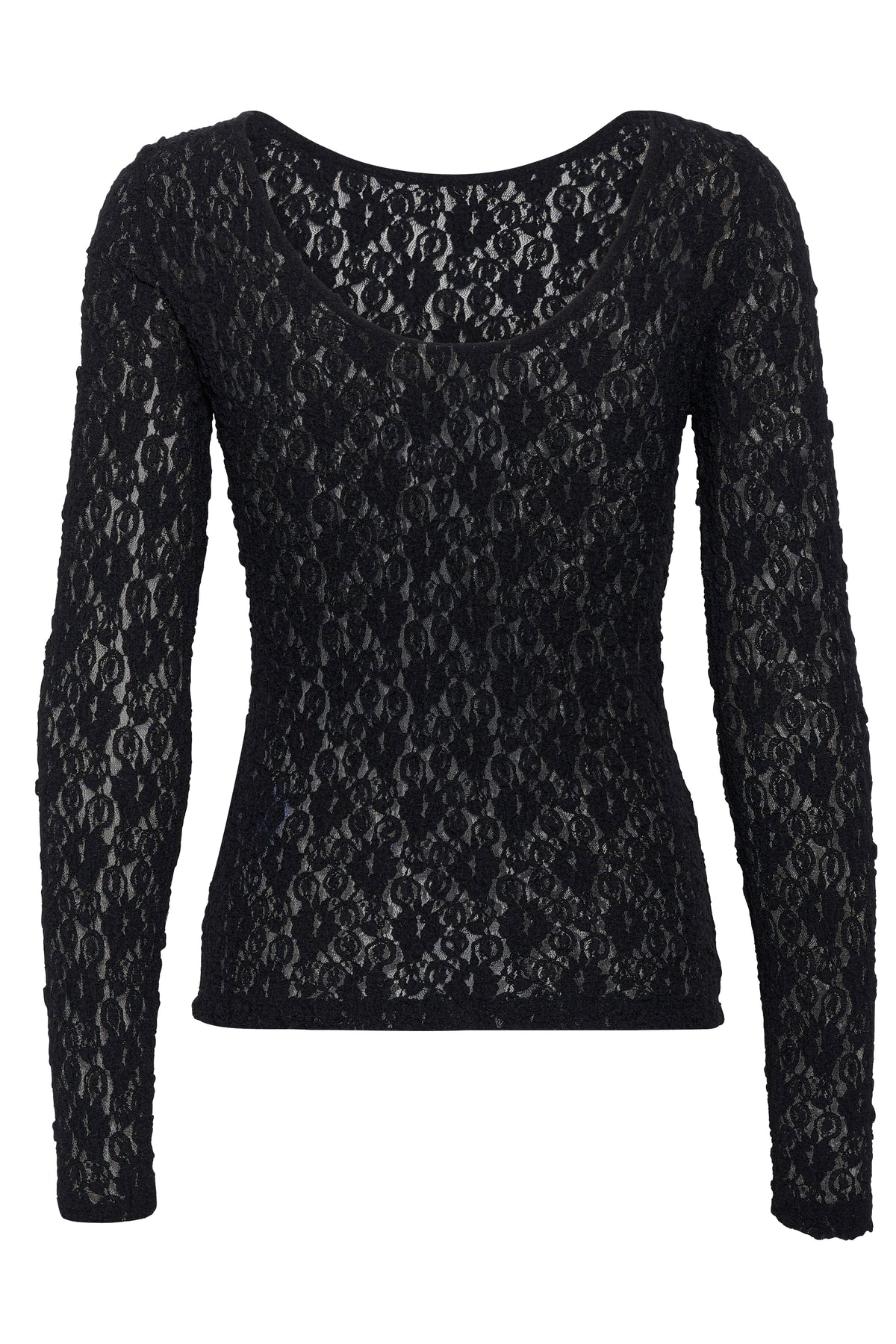 Smuk sort blondebluse fra Inwear med rund hals, dyb hals og lange ærmer.