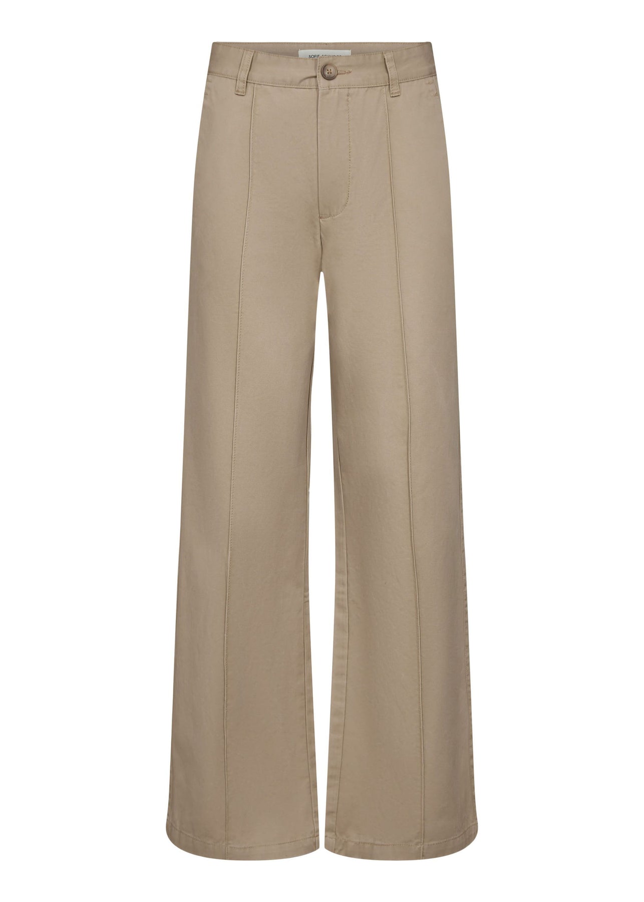 Cool brede bukser fra Sofie Schnoor i mørk sand. Bukserne er mid-waist, har læg foran, sidelommer og baglommer.