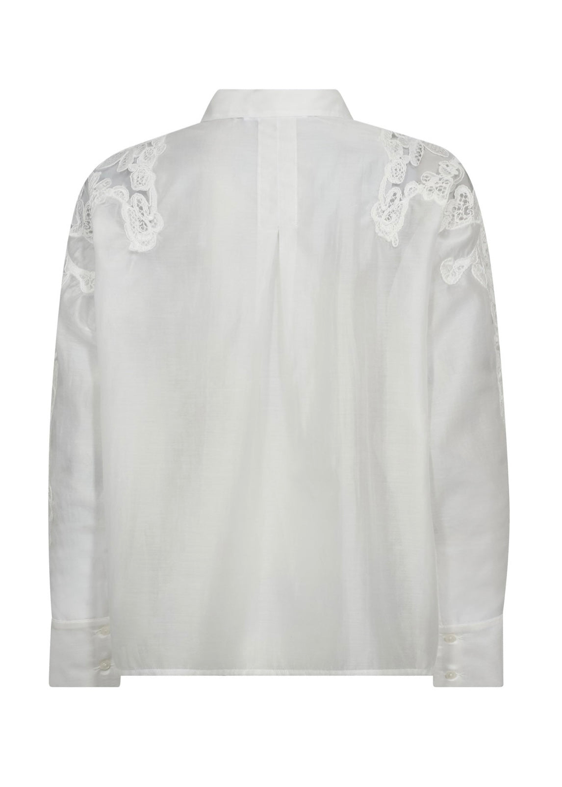 Yndig skjorte fra Co'Couture med blonder på skuldre og ærmer, der går ned ved kraveben og ryg. Skjorten har skjult knaplukning foran.