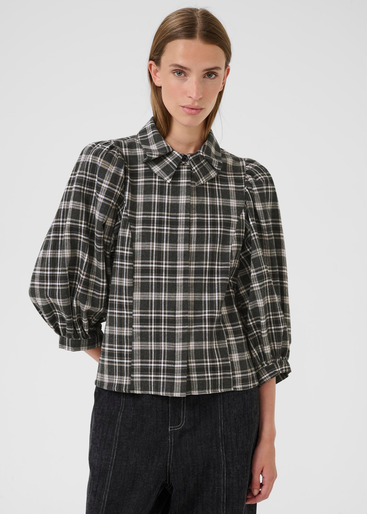 Skøn ternet bomuldsskjorte fra Karen by Simonsen. Skjorten har en fin dobbeltkrave, 3/4 lange ærmer og en let taljeret pasform.