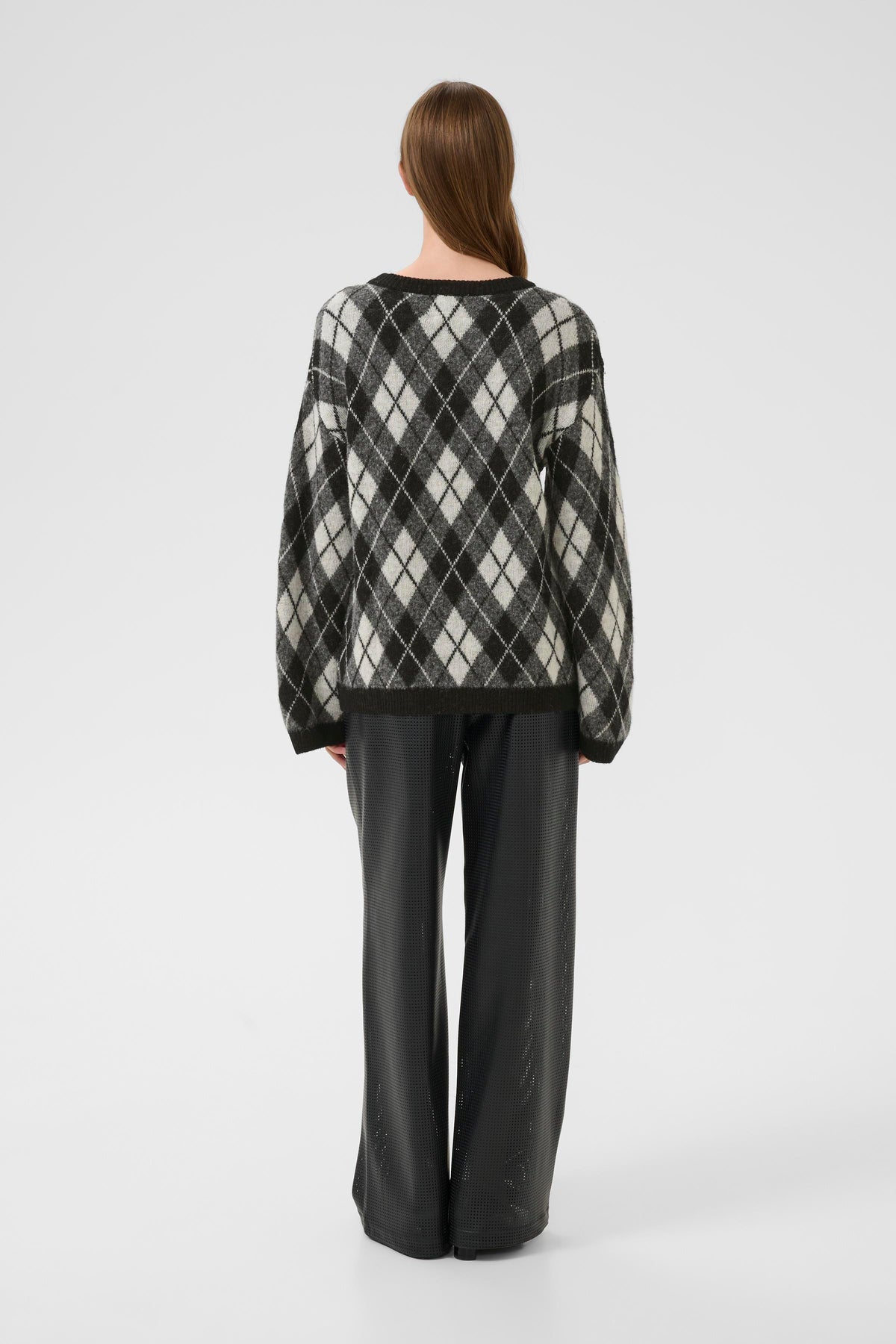 Lækker sort og hvid mønstret pullover fra Karen by Simonsen. Pulloveren har rund hals, lange ærmer og en lige pasform.