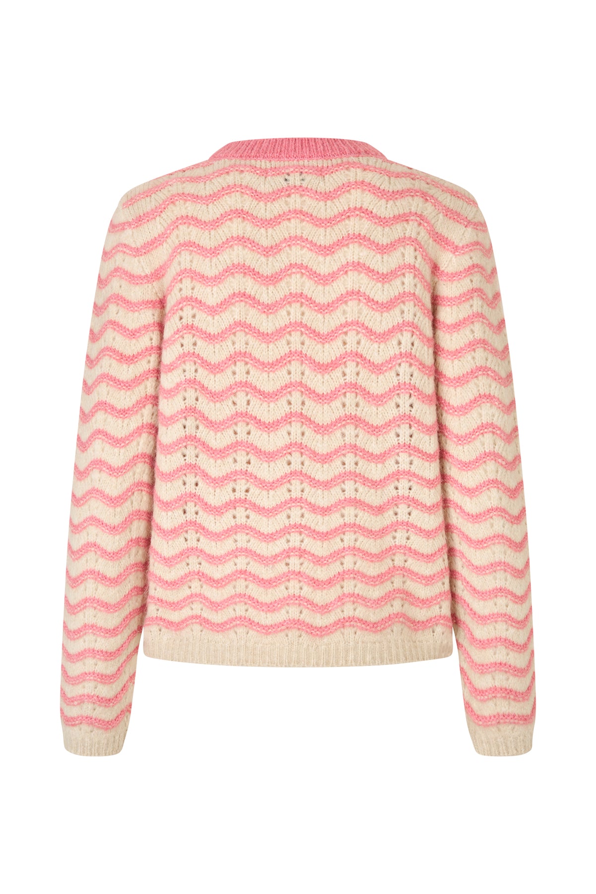 Smuk hulmønsteret pullover i rosa og off-white. Pulloveren har rund hals, lange ærmer og en lige pasform.