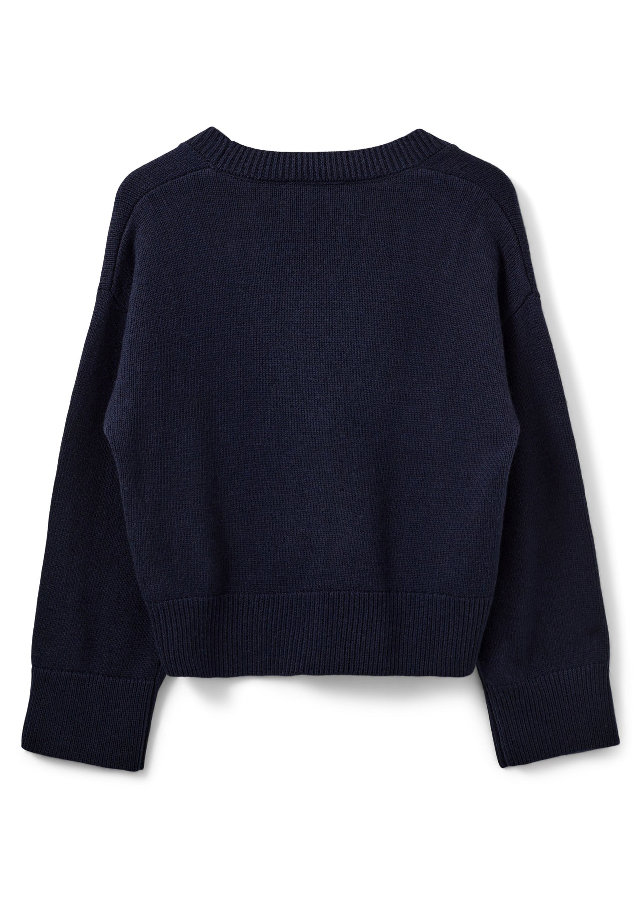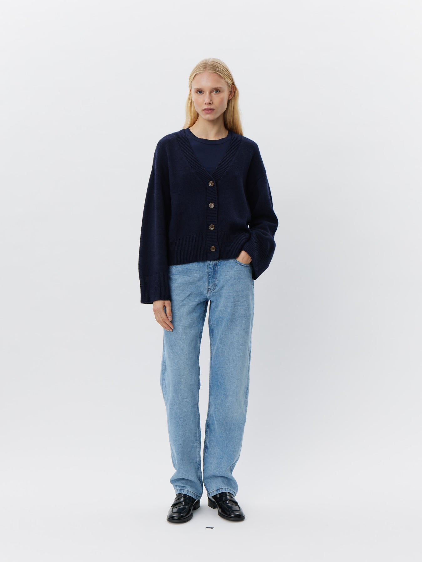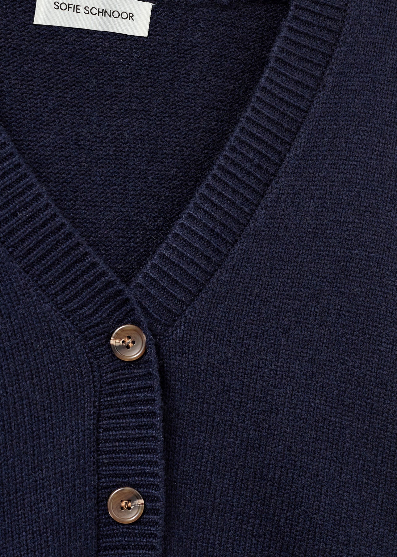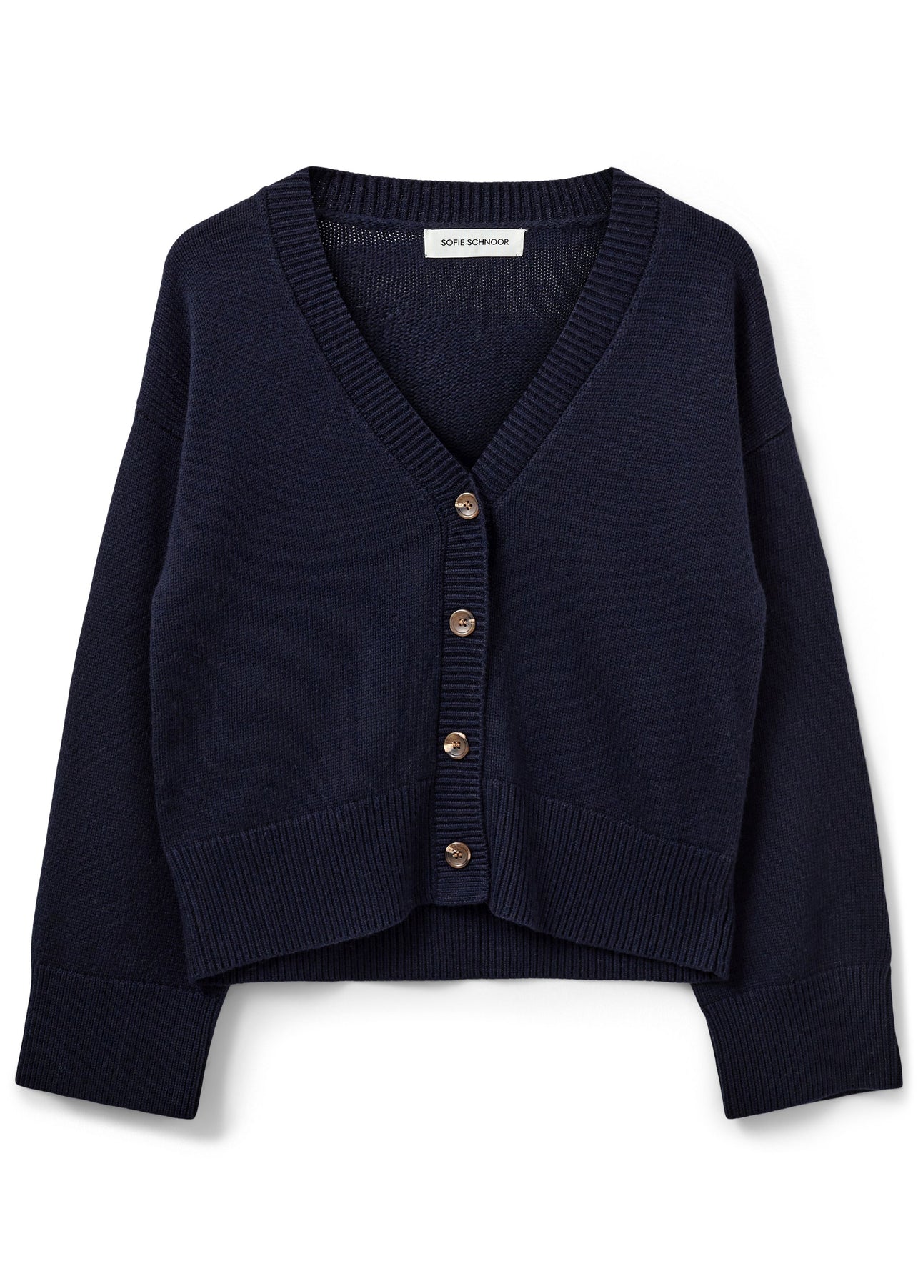 Cool navy cardigan fra Sofie Schnoor i lækker kvalitet. Cardiganen har v-udskæring, knapper foran, løse ærmer og en løs pasform.