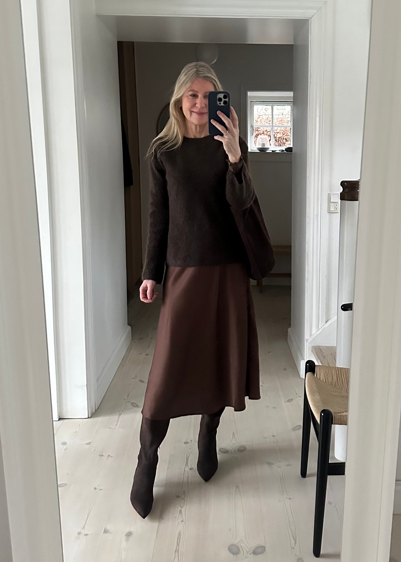 Skøn brun satinnederdel fra Saint Tropez med skjult elastik i livet.