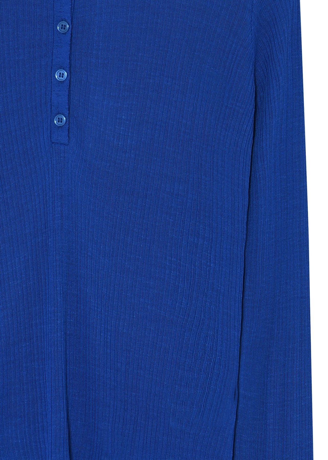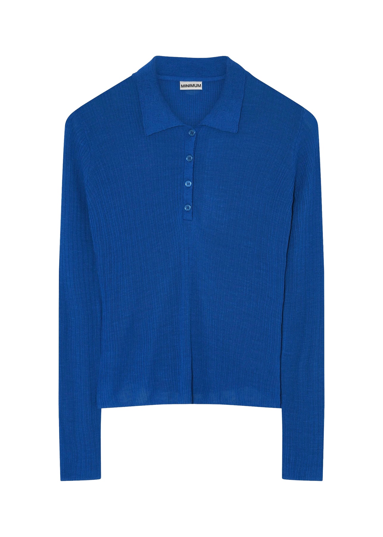 Blå strikket polo fra Minimum. Poloen har en krave, lukkes med knapper og er i et lækkert skrækbart materiale.