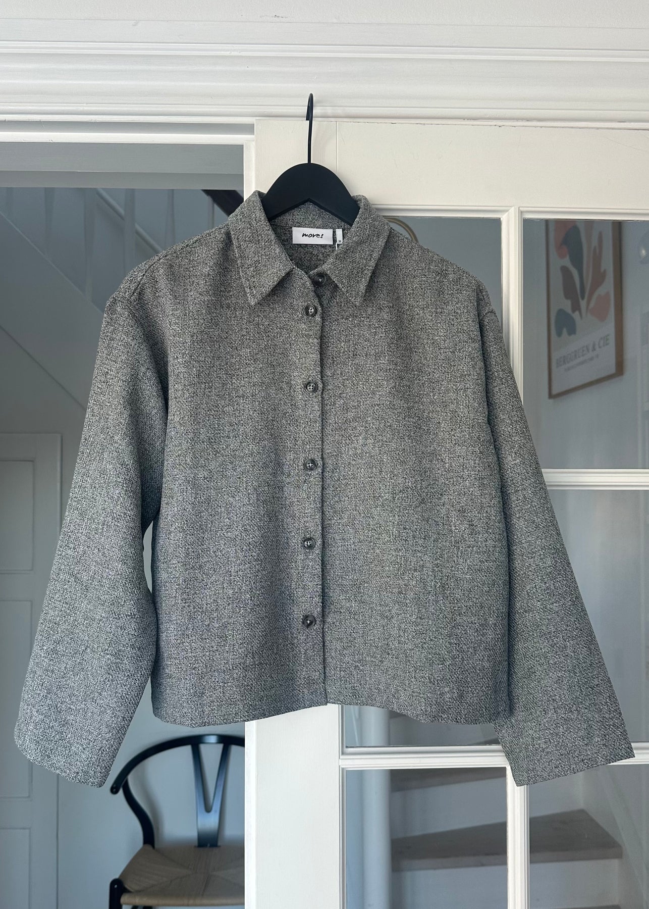 Gråmeleret bluse fra Moves. Blusen har en krave og lukkes med knapper foran.