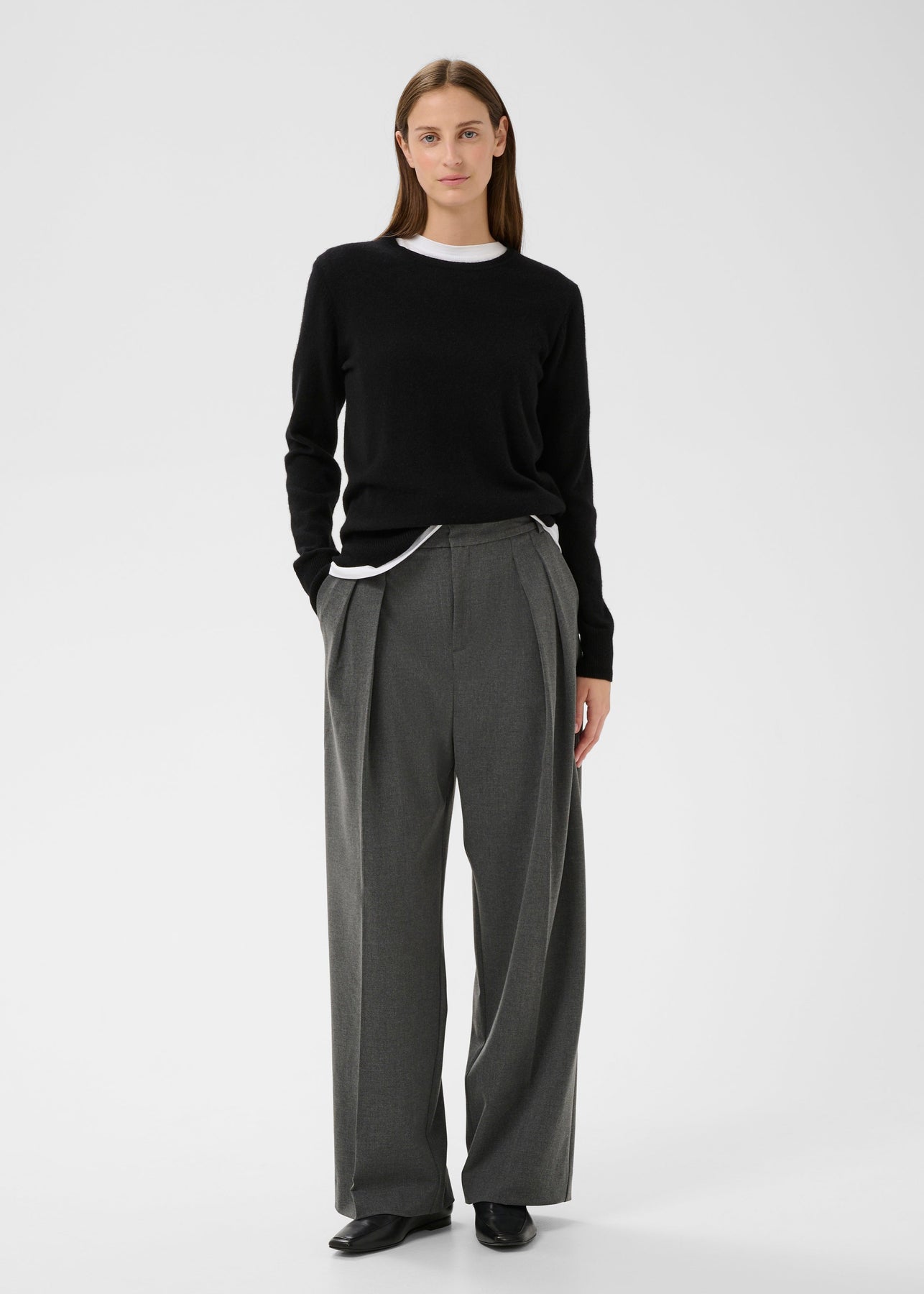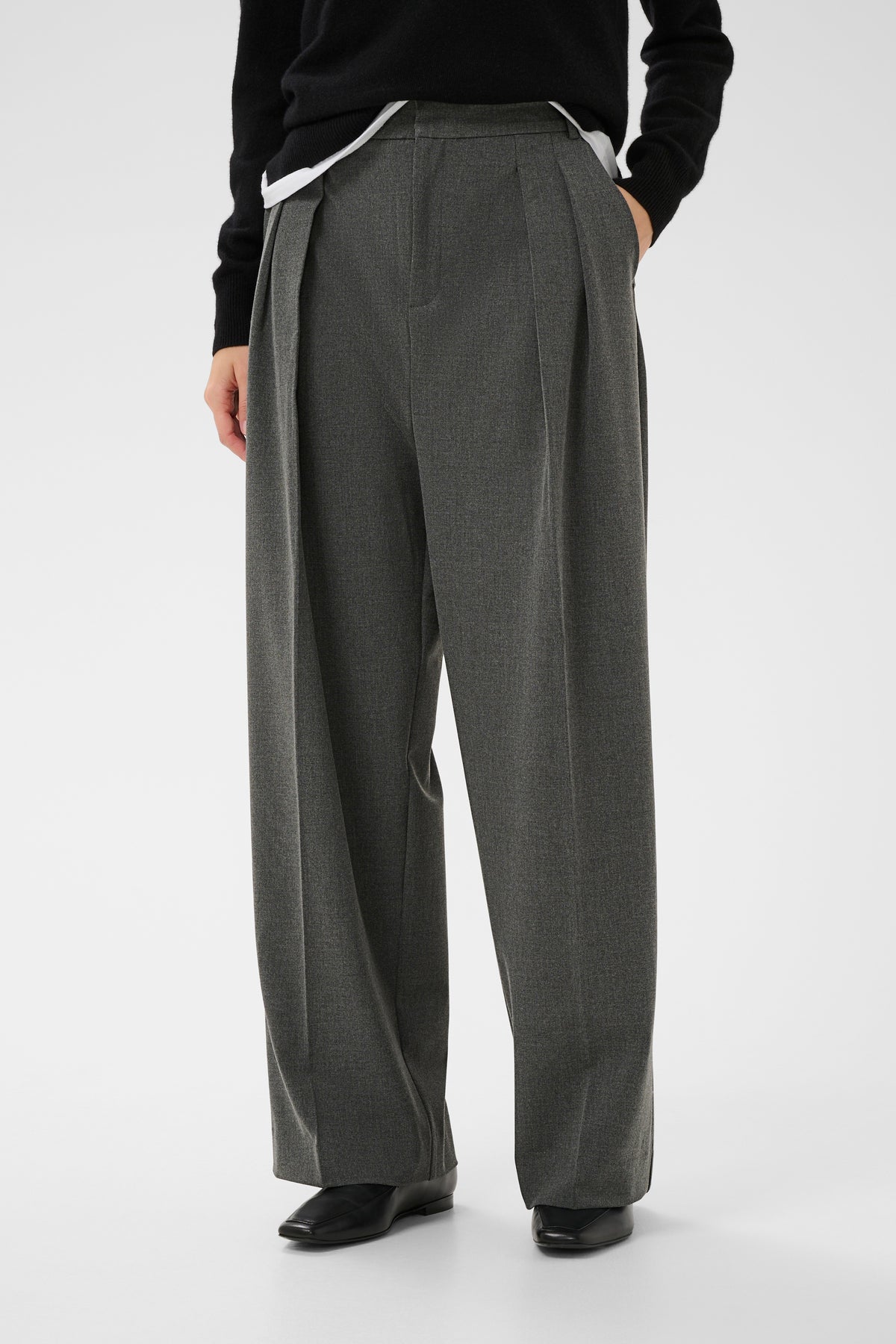Fine mørkegrå bukser fra InWear med brede ben, høj talje og læg foran.