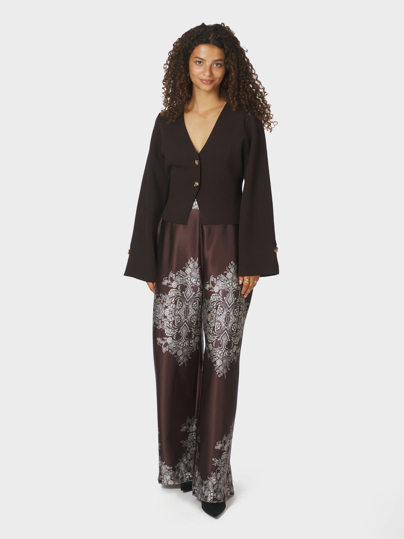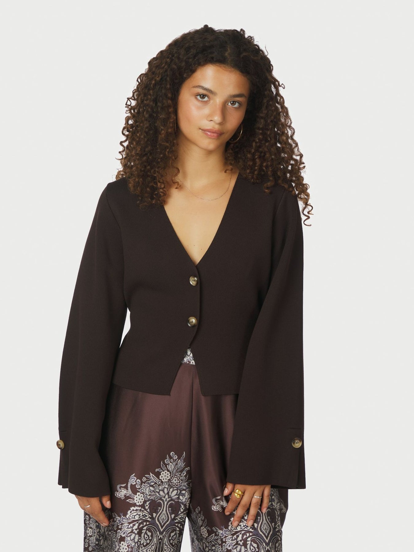 Brun strikcardigan fra neo Noir. Cardiganen har en kort taljeret pasform, lange brede ærmer og hornknapper foran og på ærmer.
