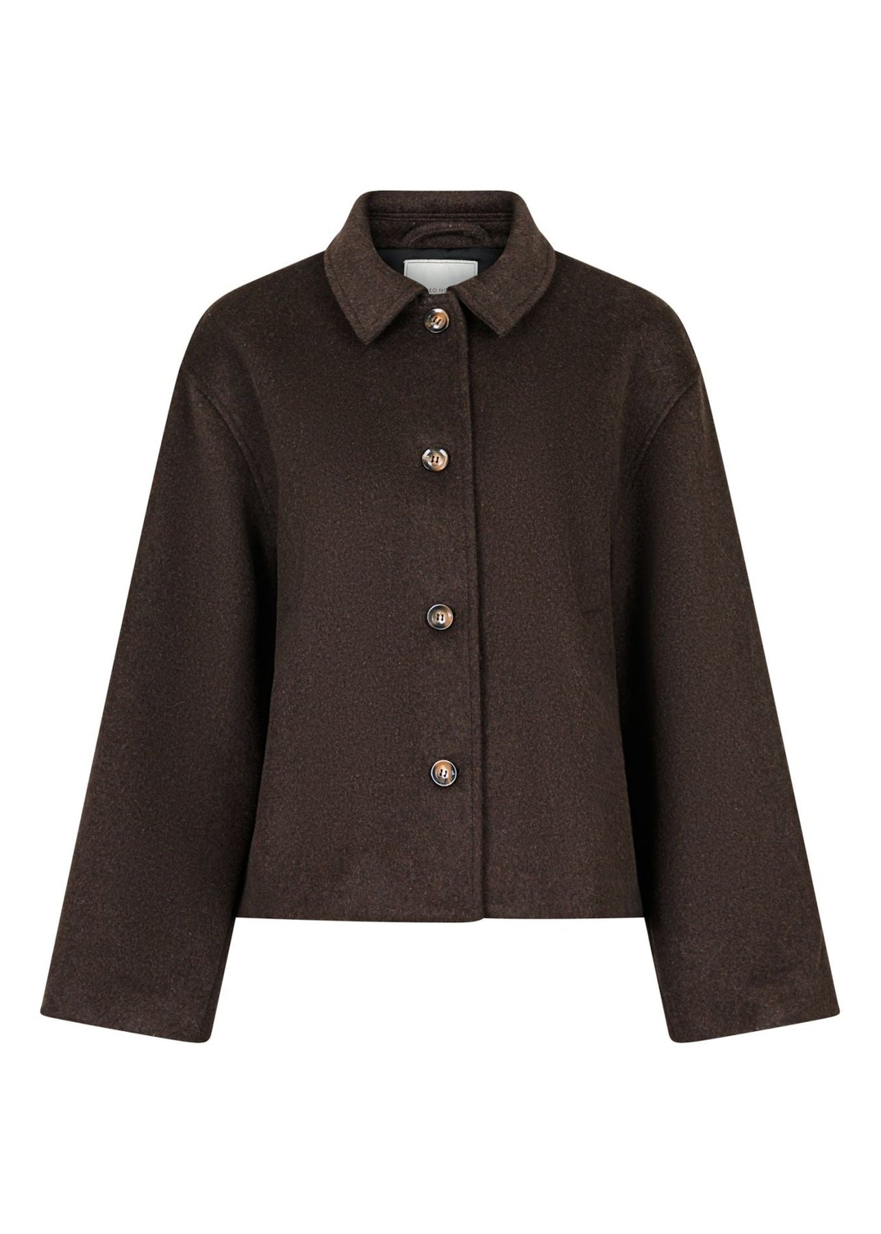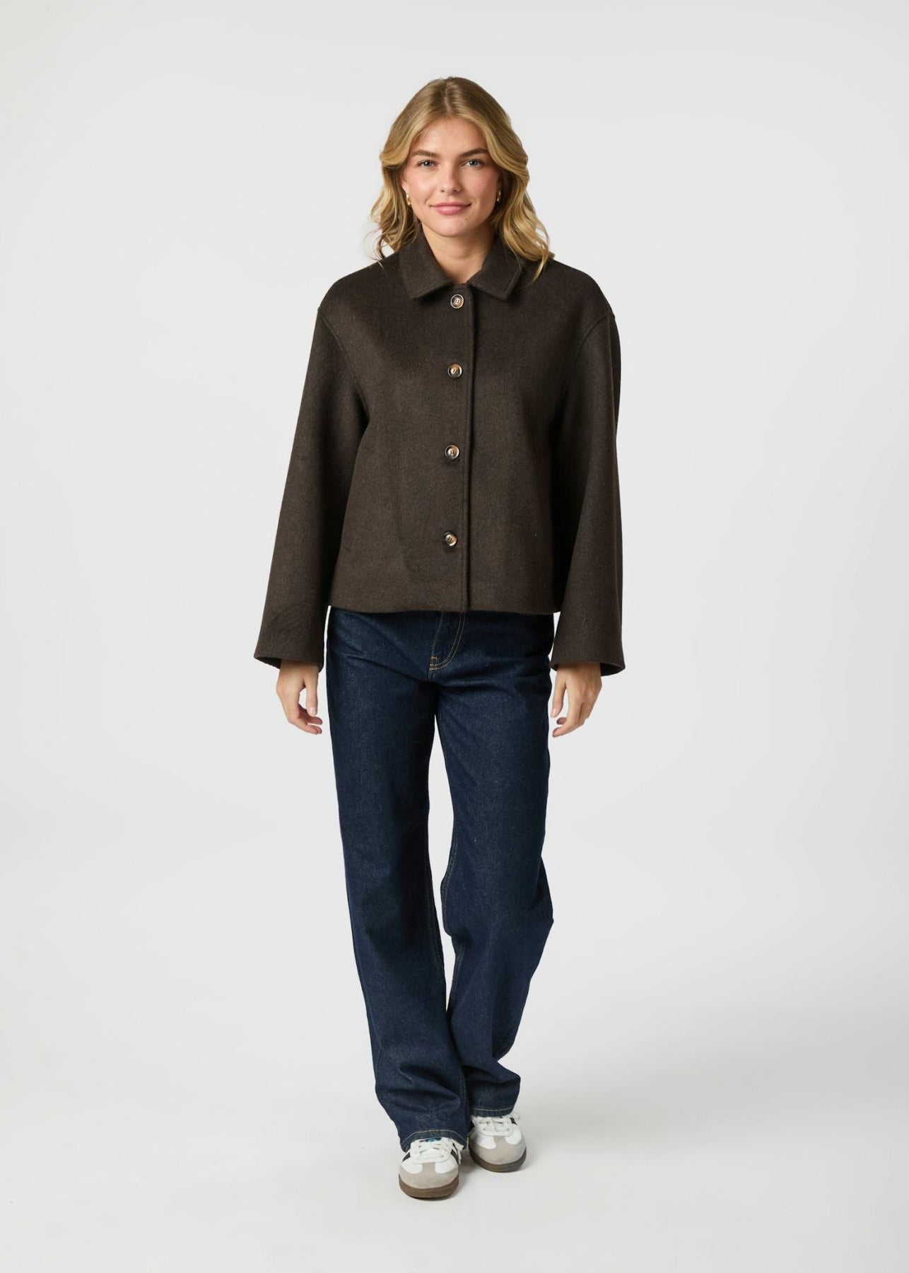 Fin brun uldjakke fra Neo Noir. Den har en løs pasform, krave og lukkes med lysebrune knapper foran.