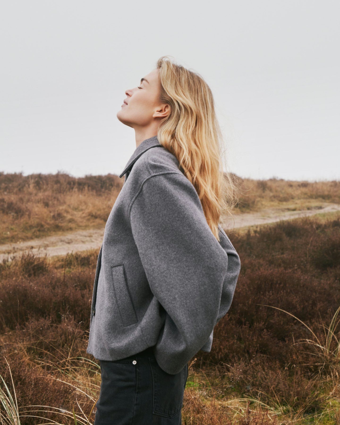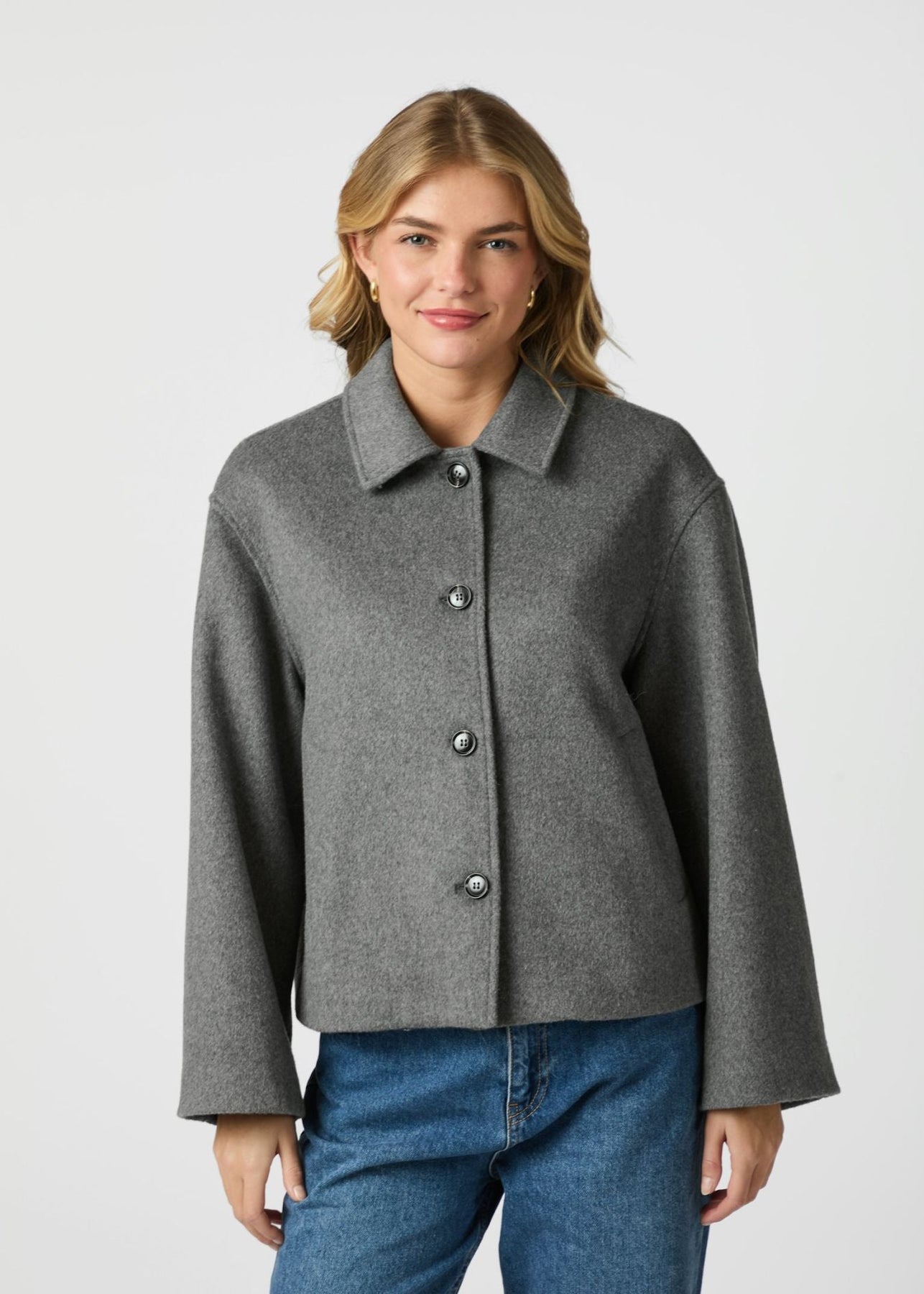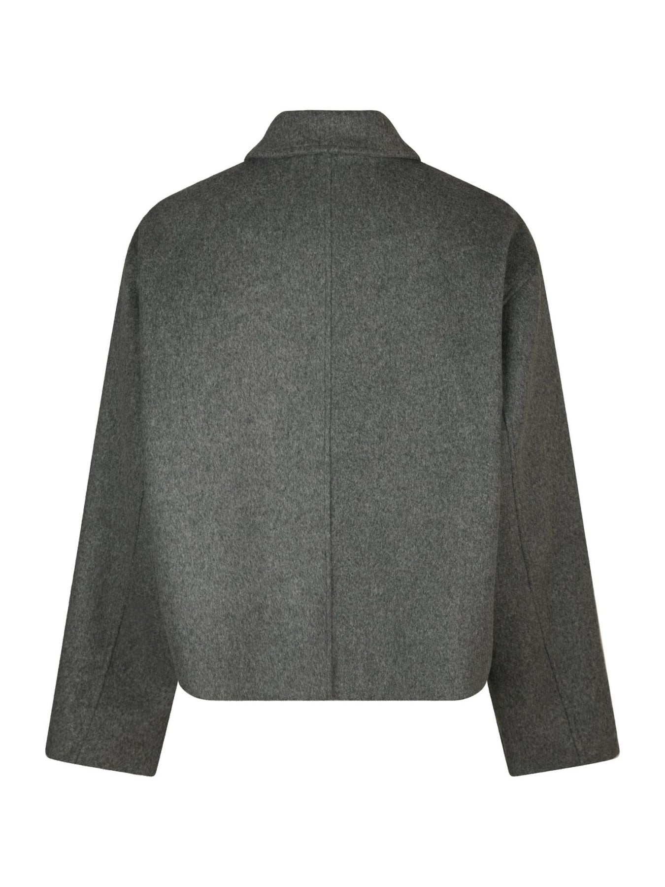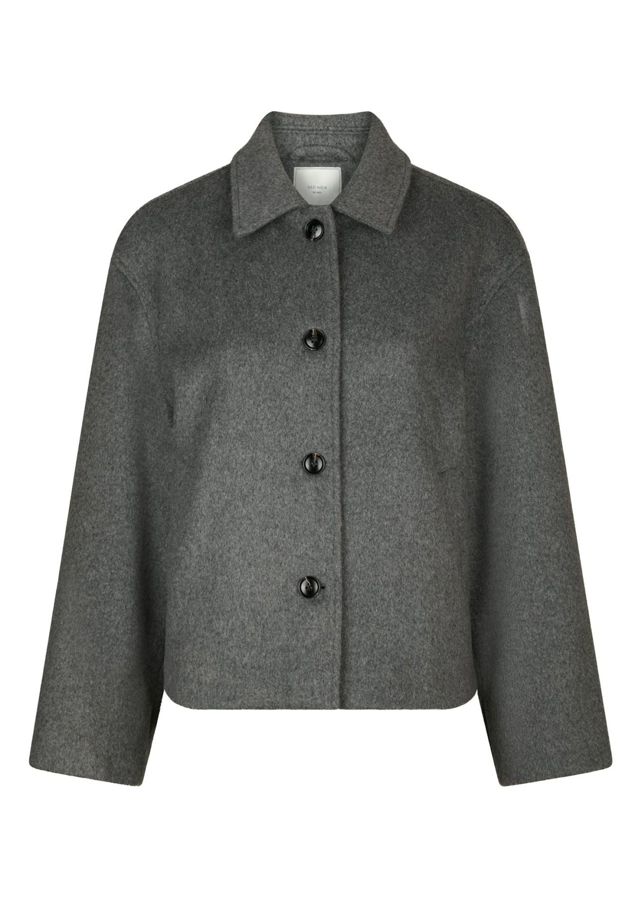 Fin grå uldjakke fra Neo Noir. Den har en løs pasform, krave og lukkes med lysebrune knapper foran.