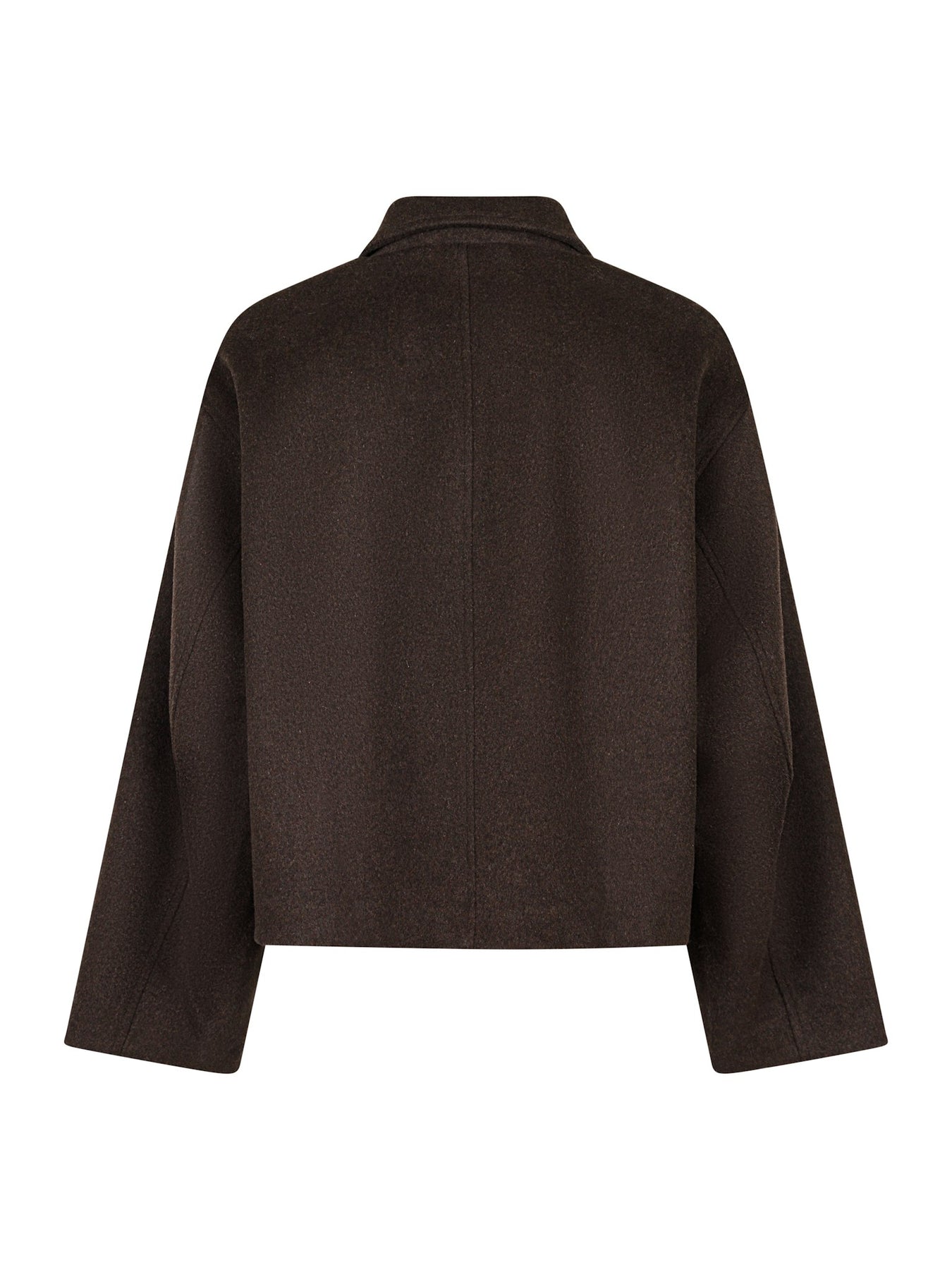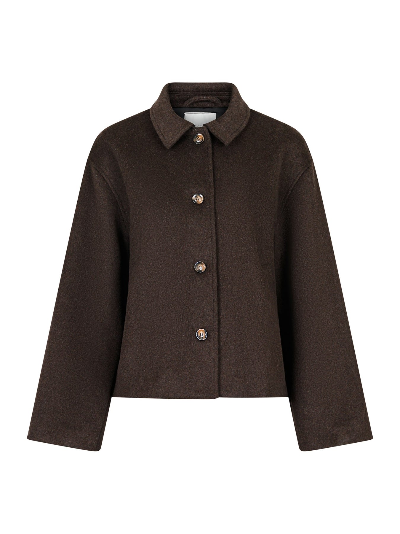 Fin grå uldjakke fra Neo Noir. Den har en løs pasform, krave og lukkes med lysebrune knapper foran.Stor i størrelsen, så gå 1-2 str ned.