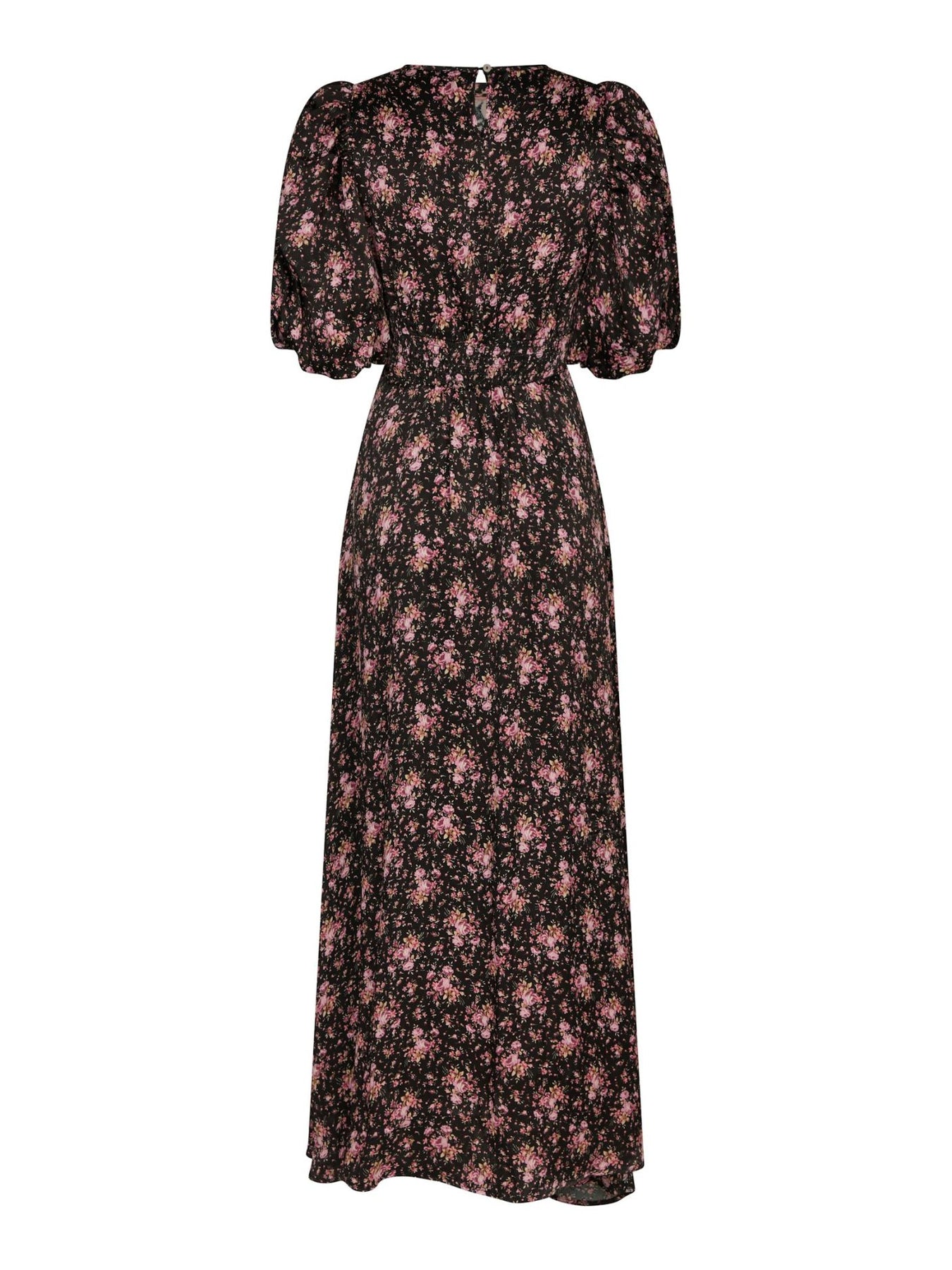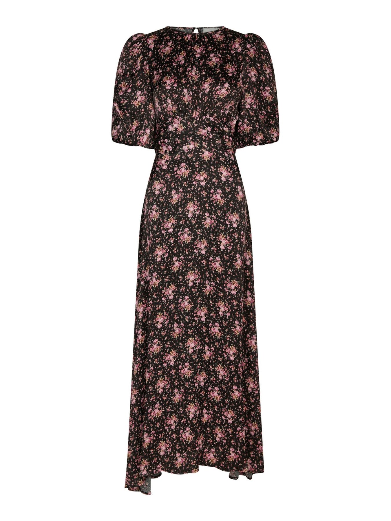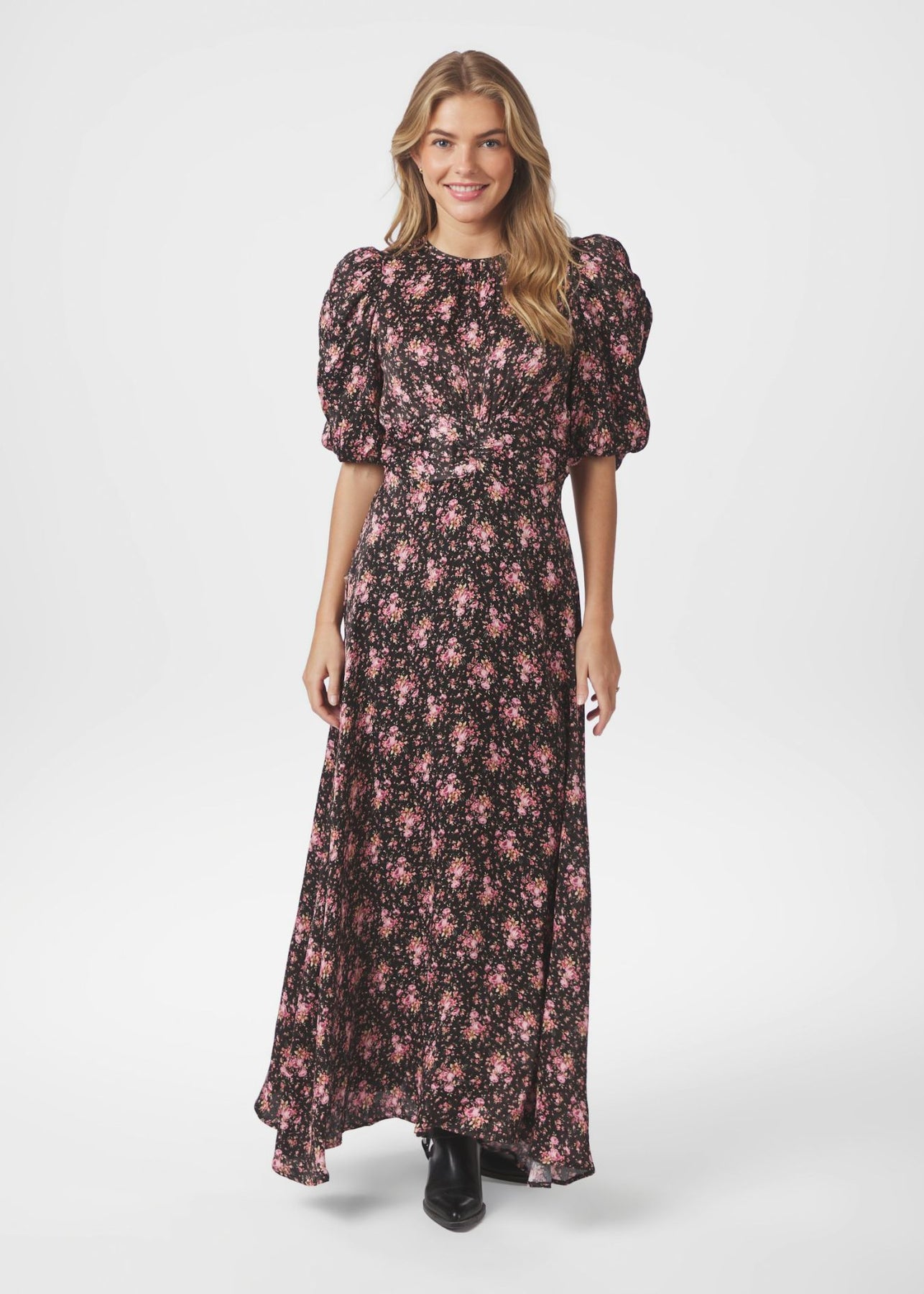 Fin blomstret kjole fra Neo Noir. Den er gulvlang, har pufærmer og et lyserødt blomsterprint på sort baggrund.