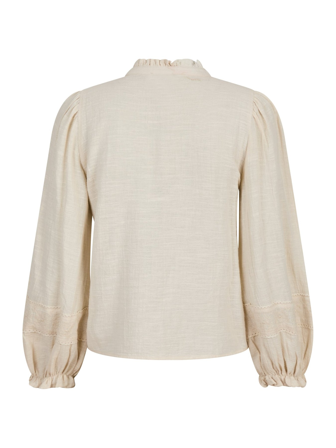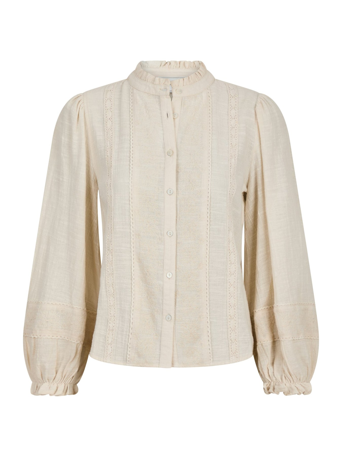 Feminin bluse med broderet detaljer og blondekantbånd. Blusen har knapper foran og er i fin bomuldskvalitet med struktur. Den har en løs pasform.