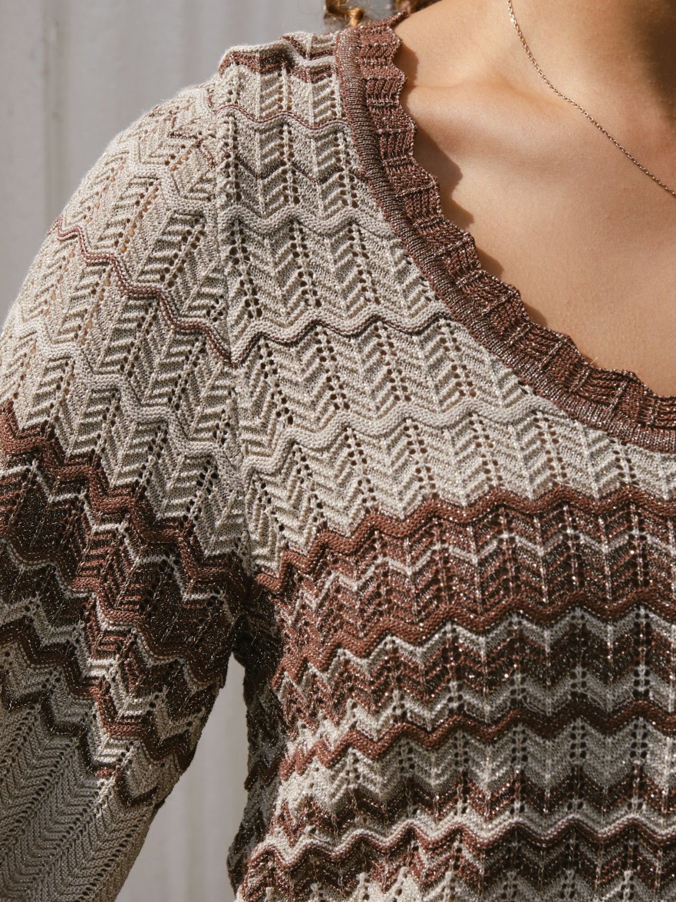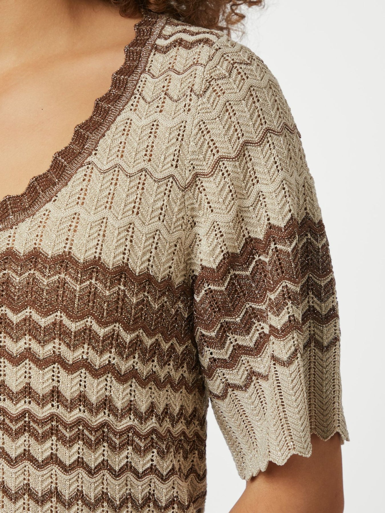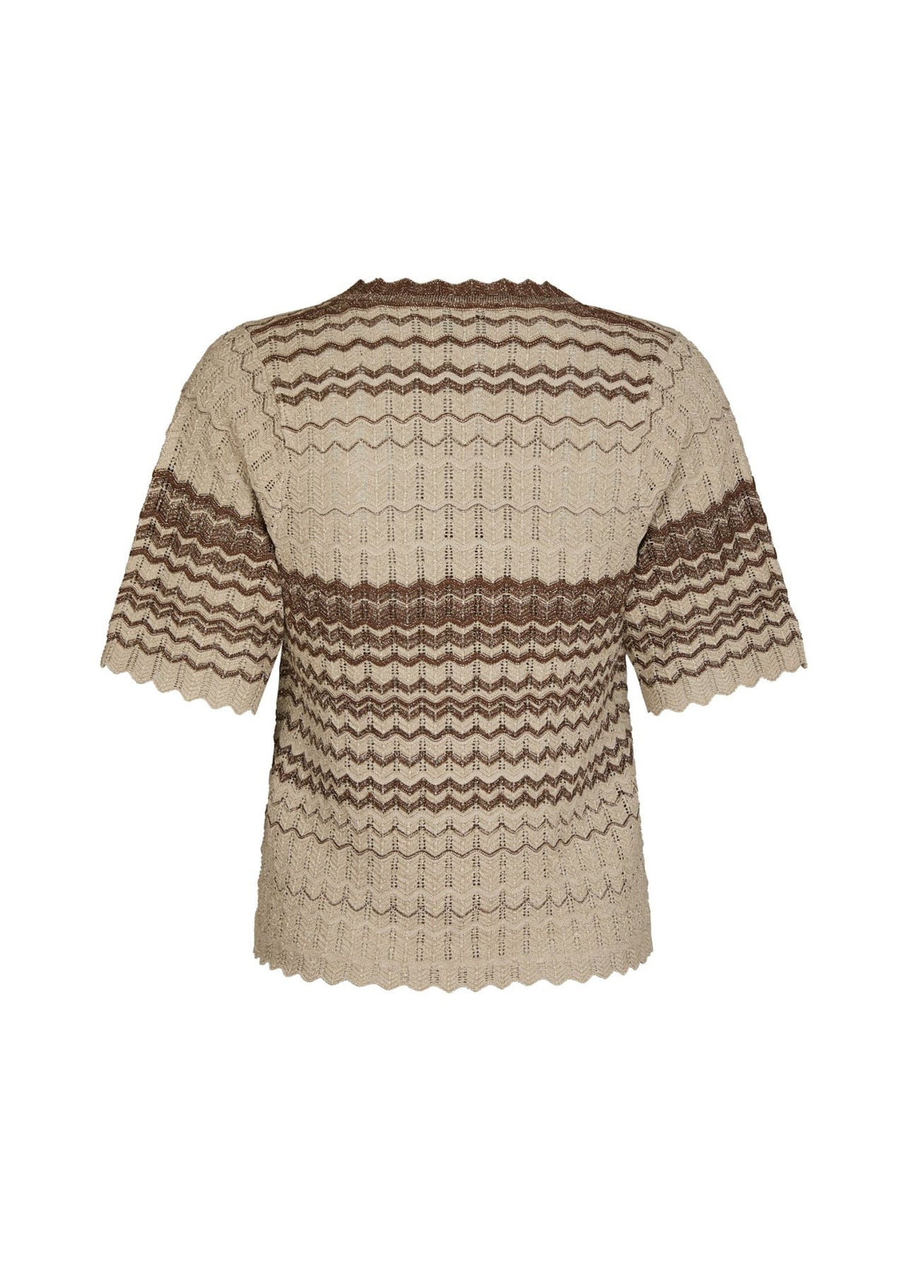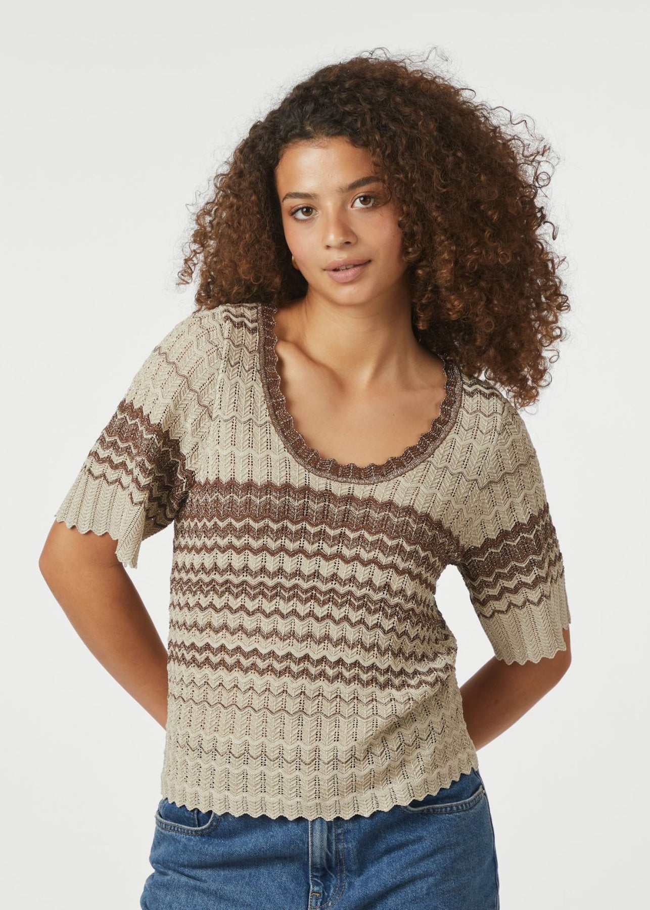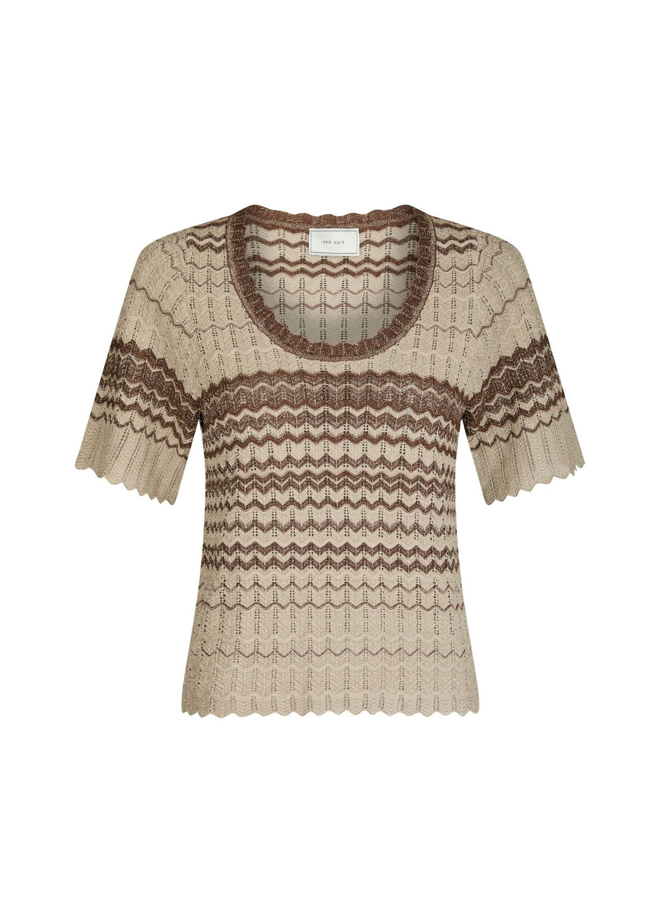 Fin strikket bluse fra Neo Noir i beige og brun. Blusen har en smal pasform med rund hals og korte ærmer. Den har en fin bølget kant i halsudskæringen.